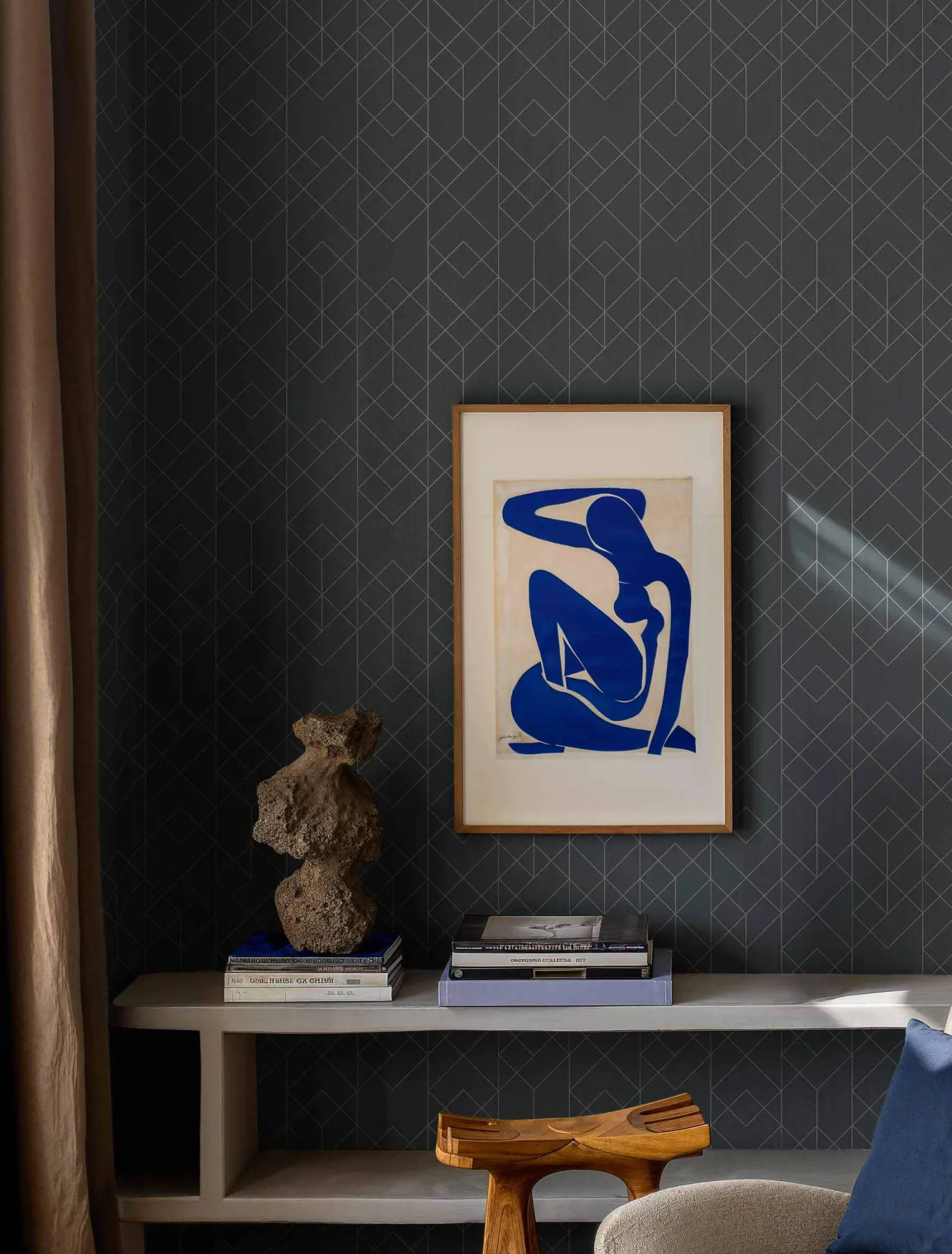 Rhombohedral Ice de Coordonne es un papel pintado de inspiración geométrica en tonos Azul/Azul Marino de la colección Lattice Geometrics. Celdas impecablemente dispuestas.