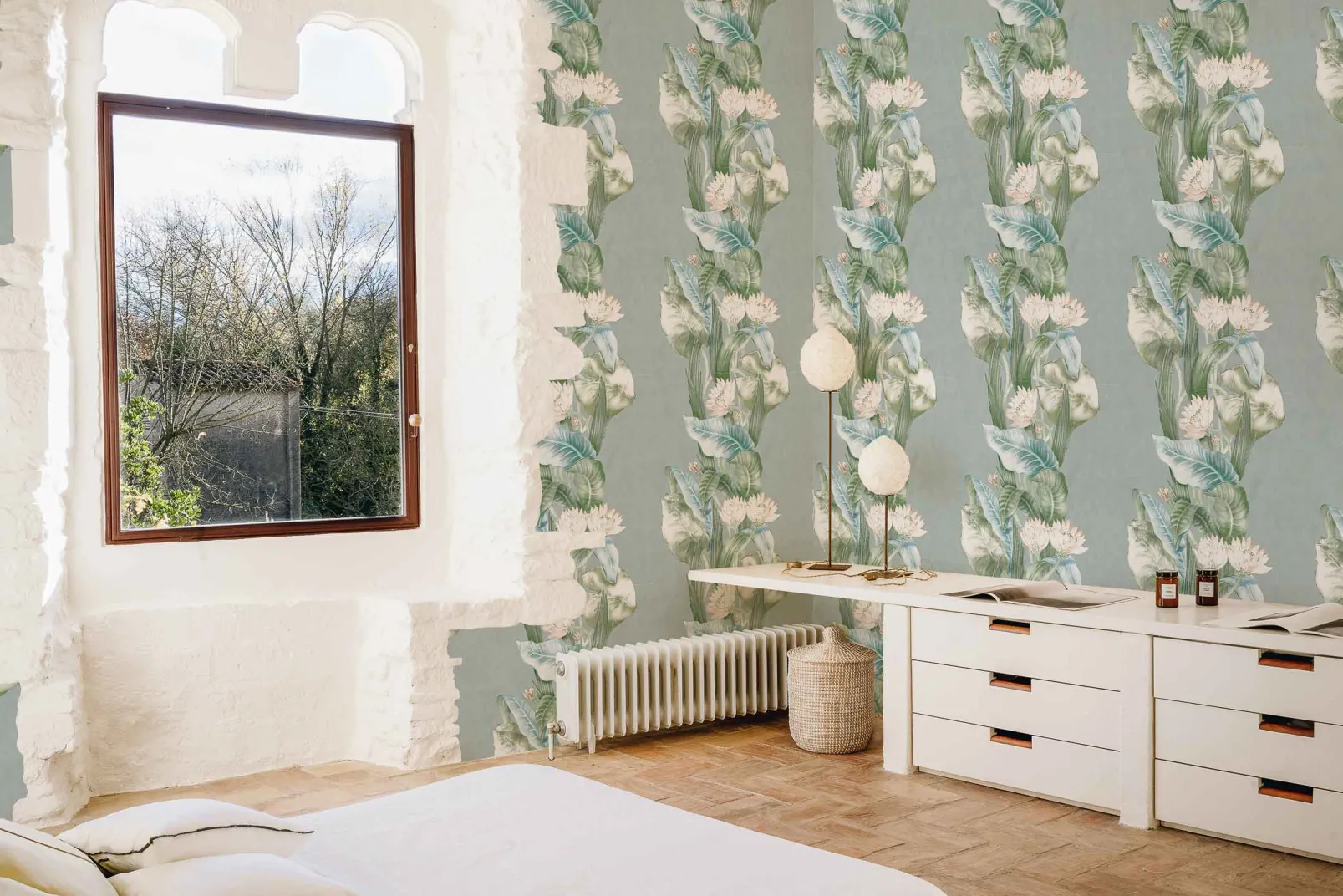 El papel pintado Riverine Aqua de Coordonné es un diseño floral en tonos verdes de la colección Maasai.
