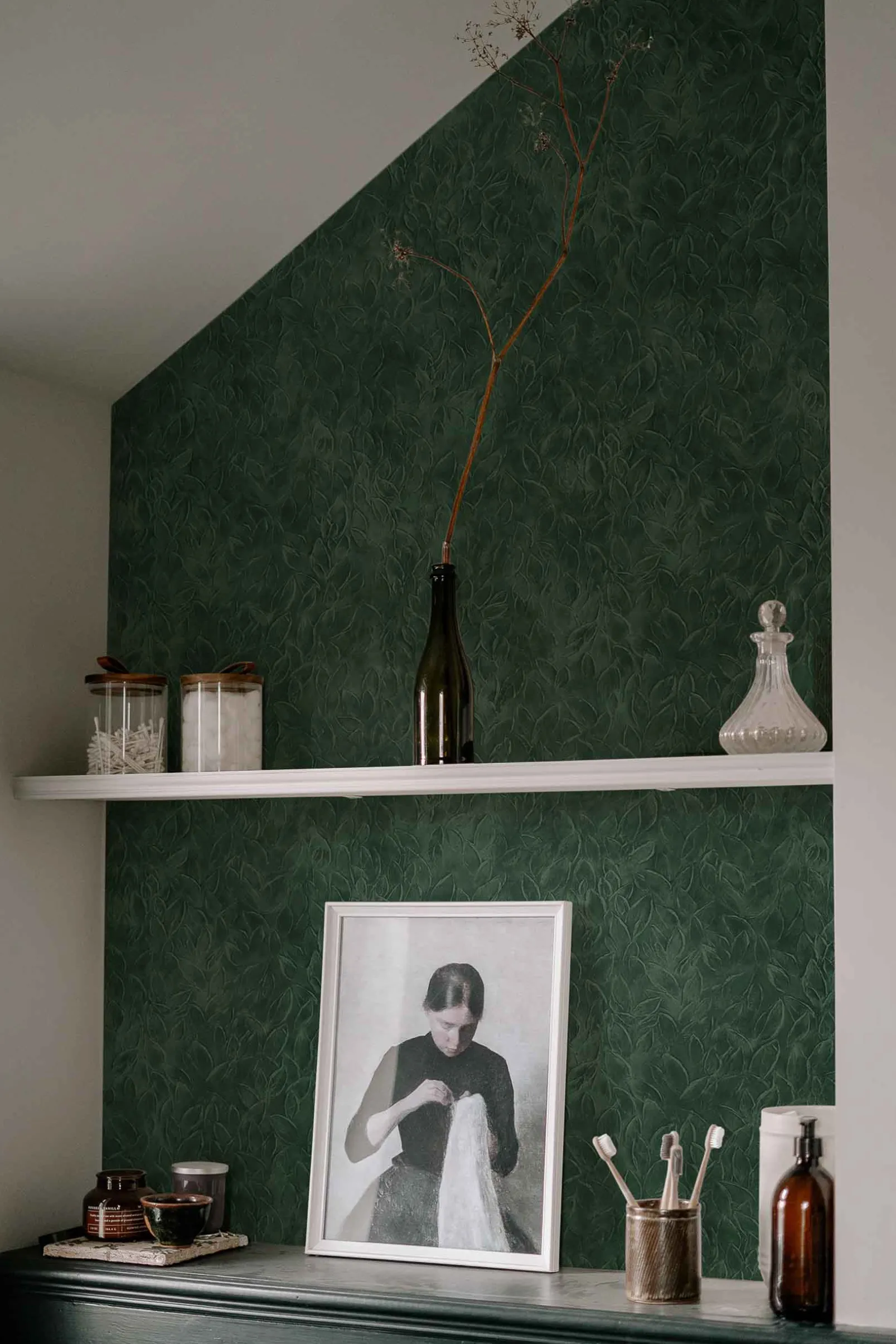El papel pintado Rob Leaves Silvester de Coordonné es un diseño vegetal en color verde de la colección Geo.