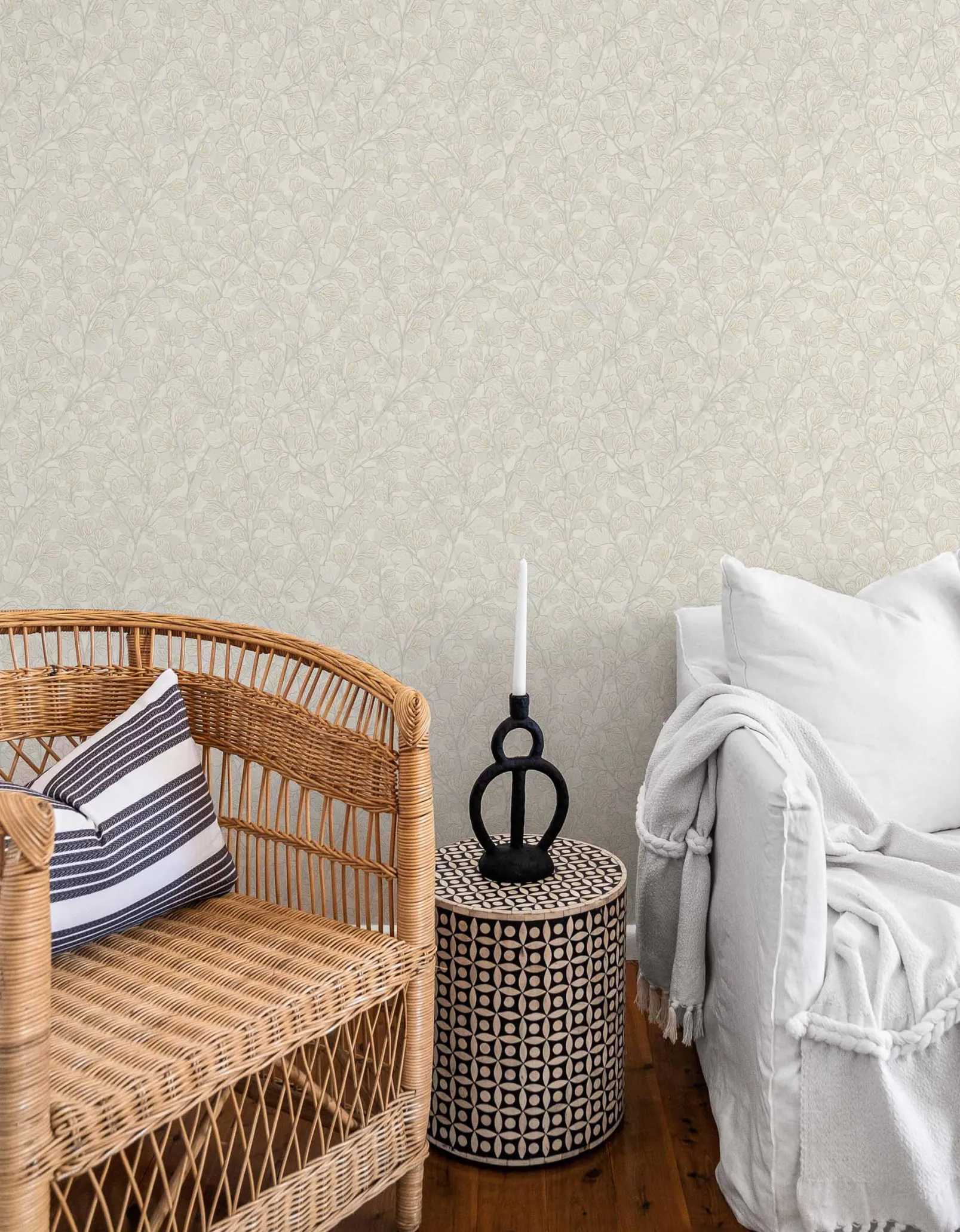 El papel pintado Robledal Algodón de Coordonné es un diseño vegetal en tonos blanco/gris. Amalgama de hojas de roble que aportan carácter a cualquier paisaje.