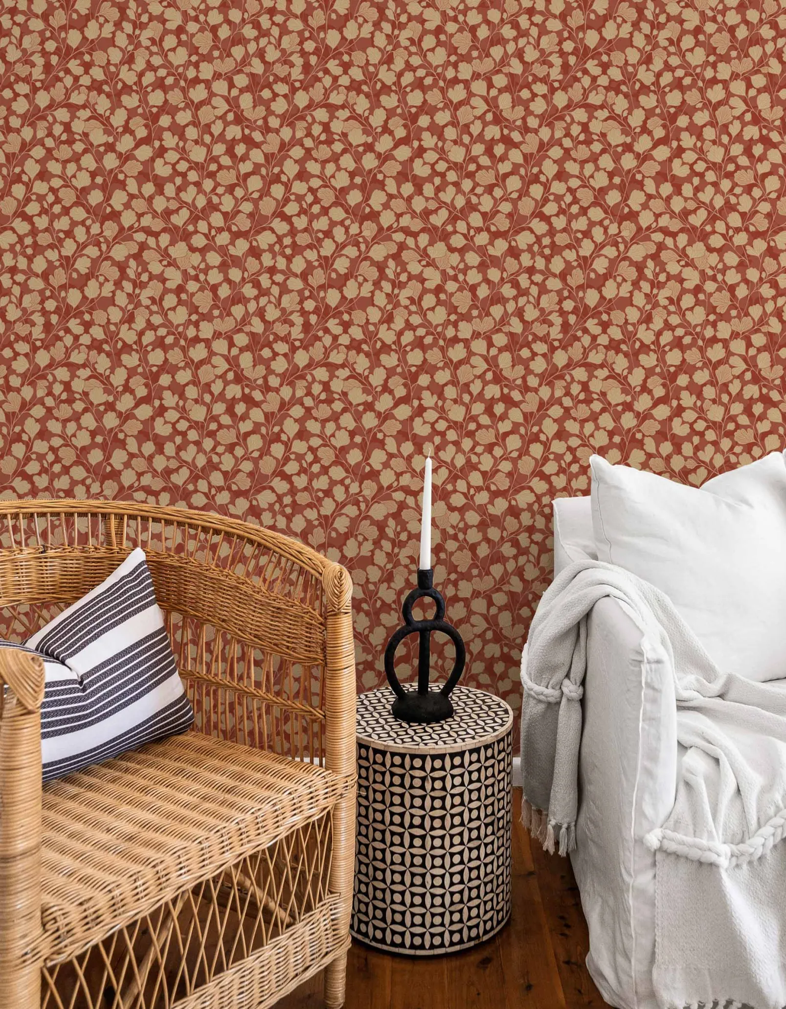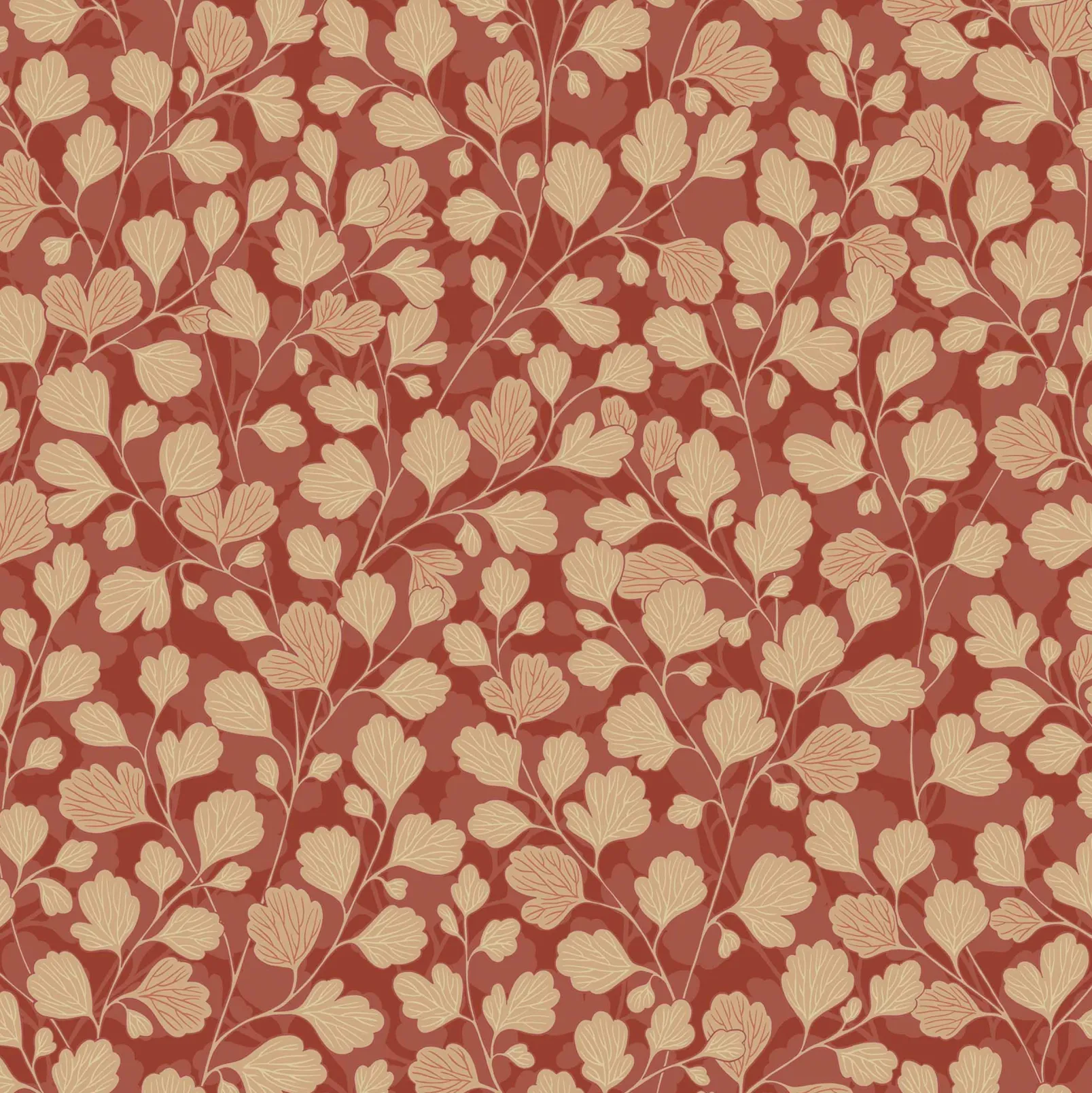El papel pintado Robledal Azafrán de Coordonné es un diseño vegetal en tonos rojo/vino. Amalgama de hojas de roble que aportan carácter a cualquier paisaje.