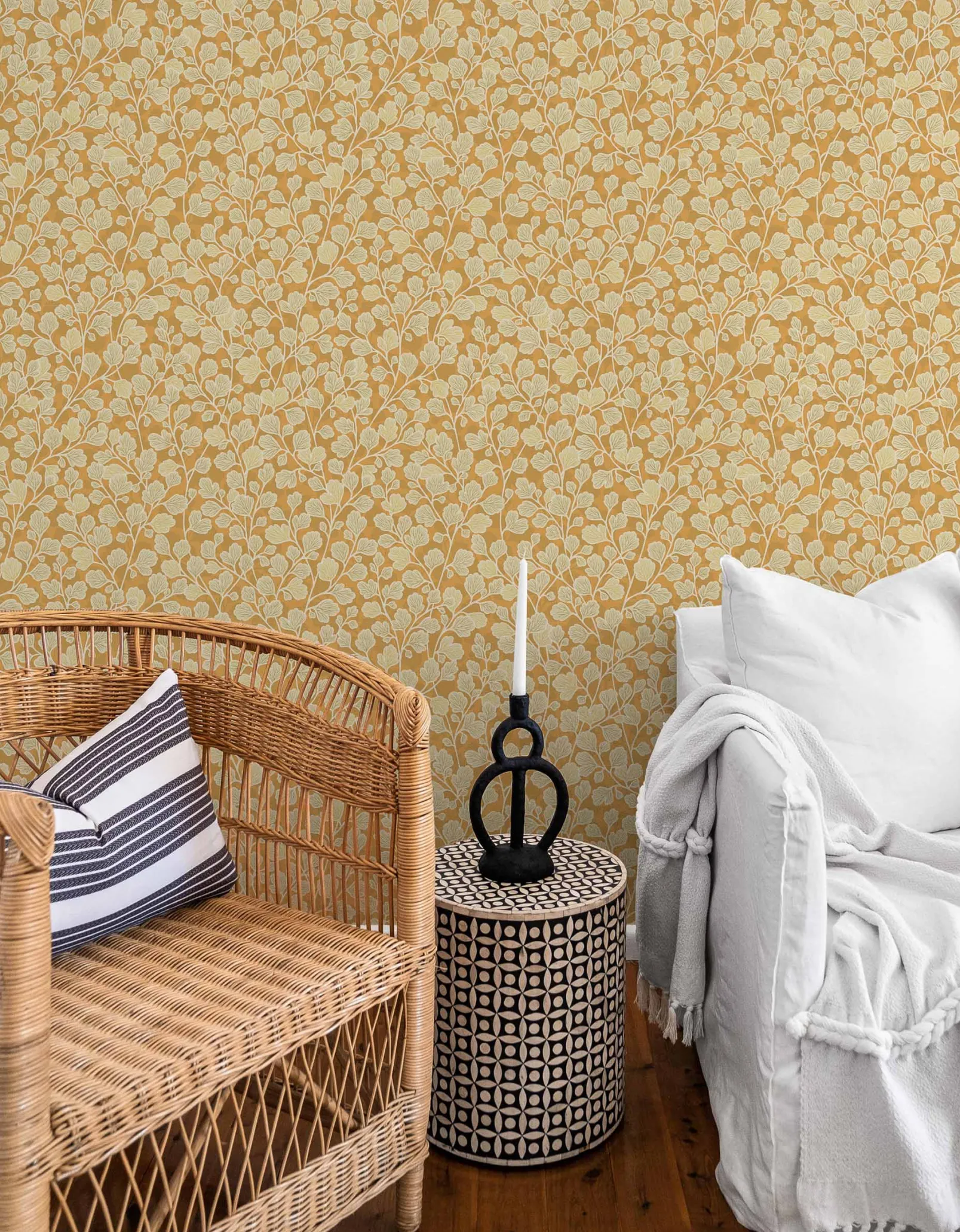 El papel pintado Robledal Curry de Coordonné es un diseño vegetal en tonos amarillo/naranja. Amalgama de hojas de roble que aportan carácter a cualquier paisaje.