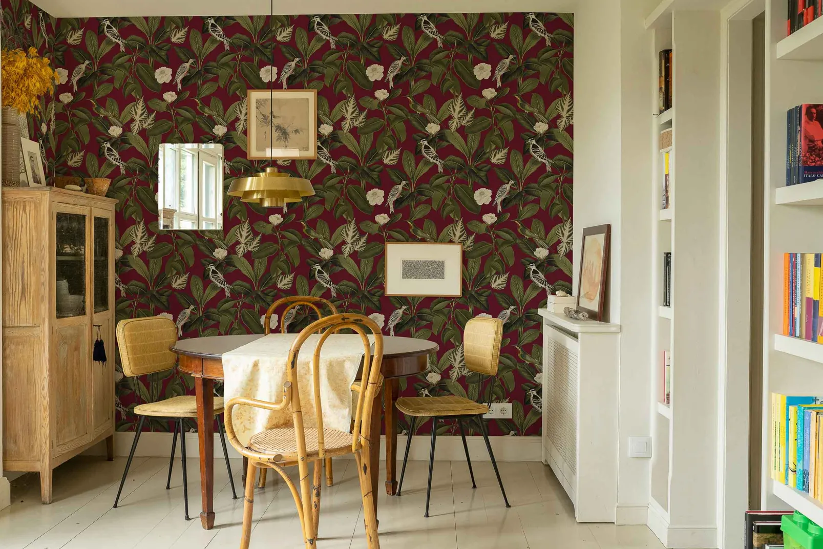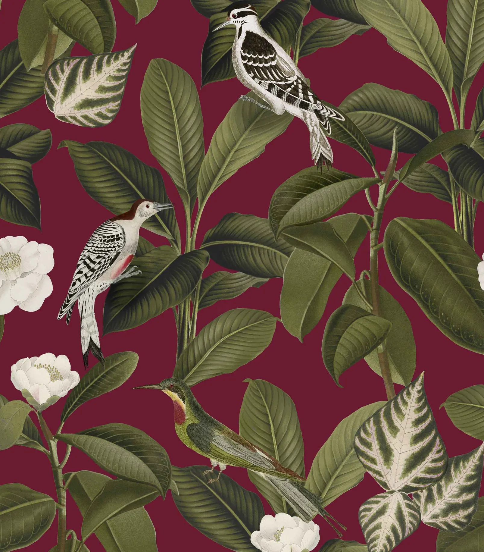 Rocio Grana de Coordonné es un diseño vegetal en rojo/vino de la colección Feria. Impresionantes camelias que atraen a los pájaros jóvenes.