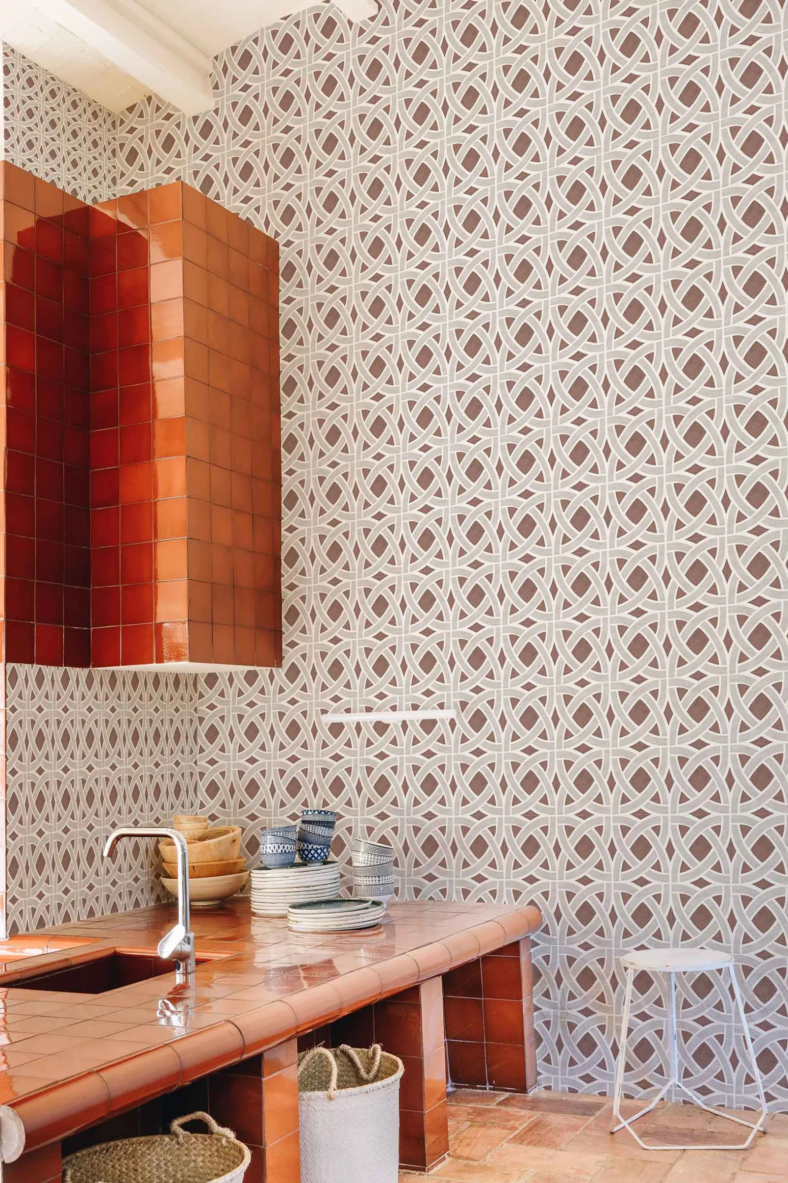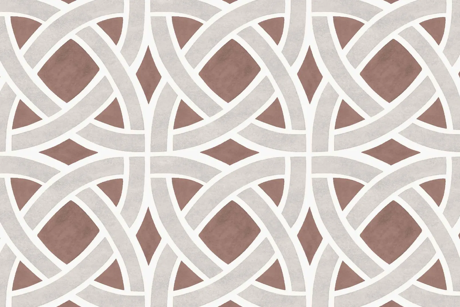 El papel pintado Roots Adobe de Coordonné es un diseño geométrico en tonos rojo/vino de la colección Maasai.
