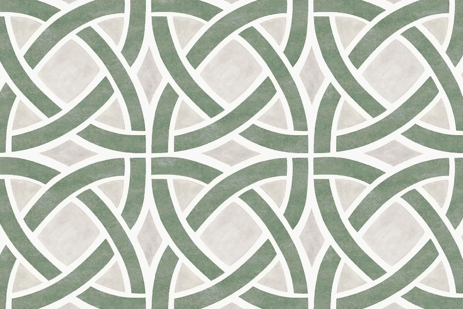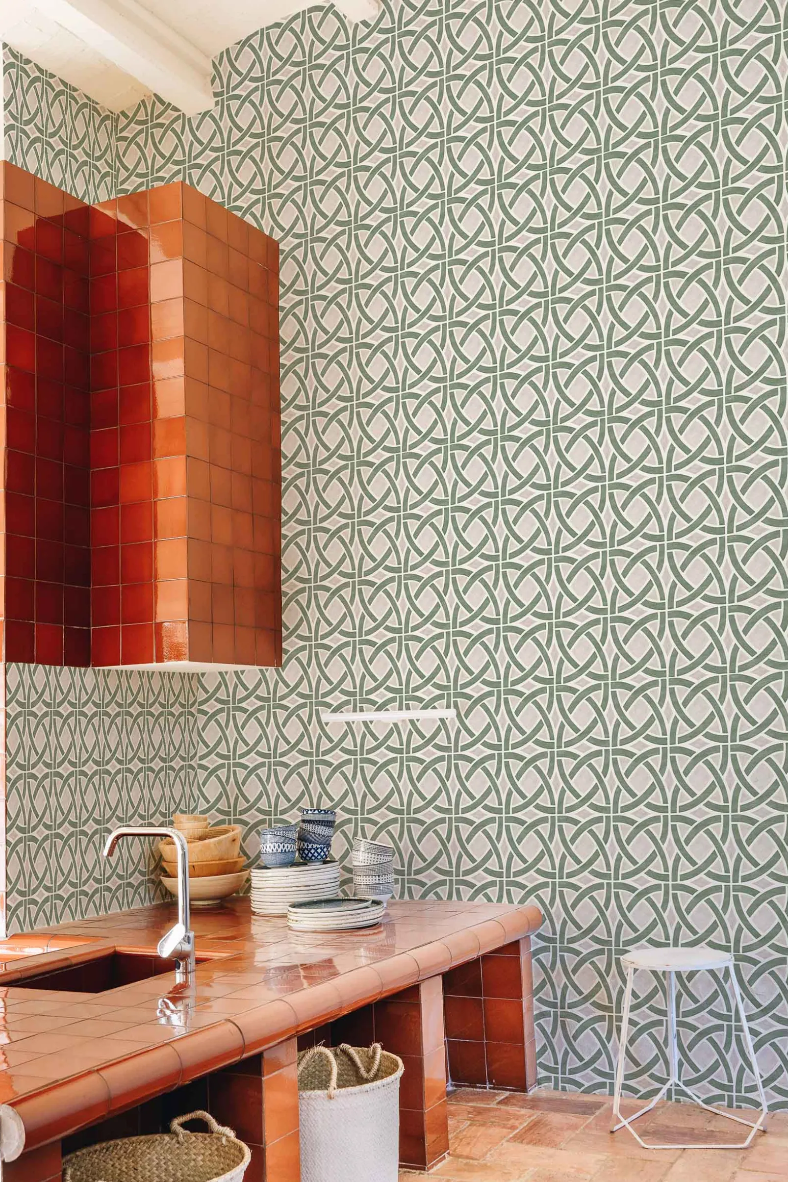 El papel pintado Roots Menta de Coordonné es un diseño geométrico en tonos verdes de la colección Maasai.