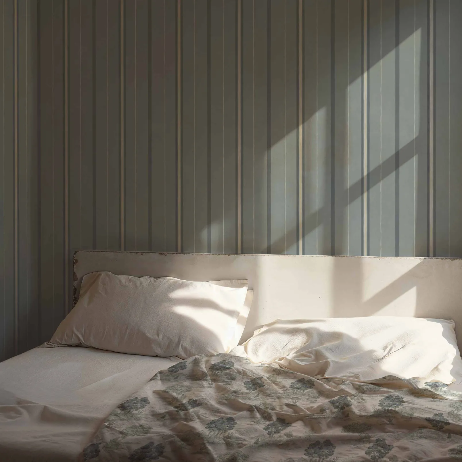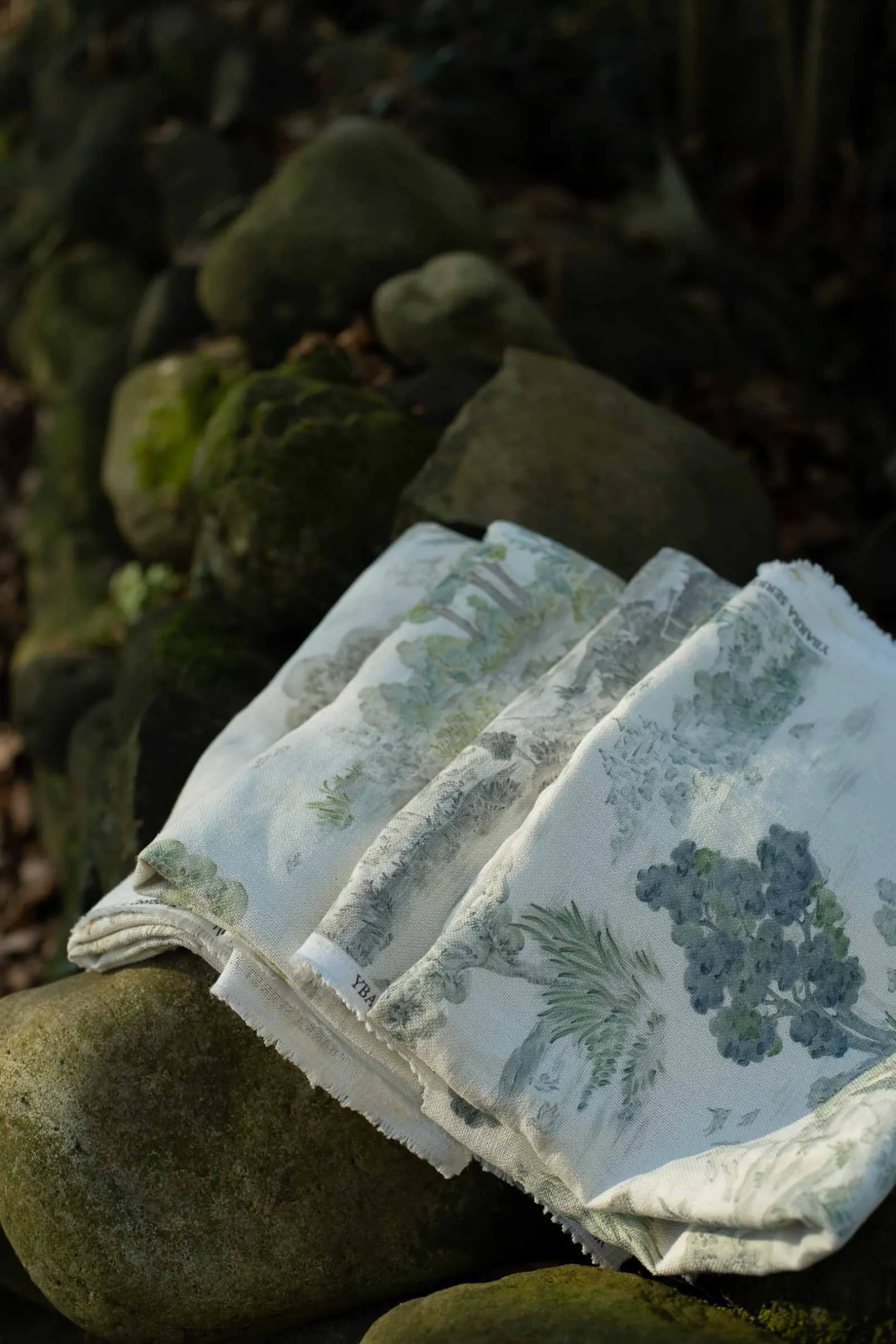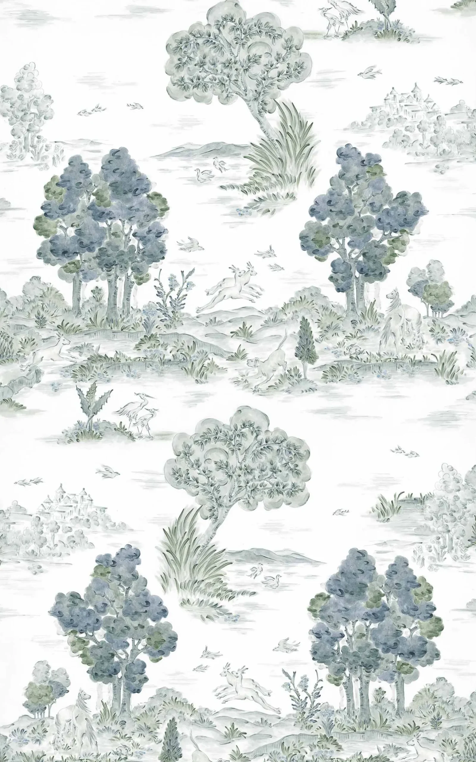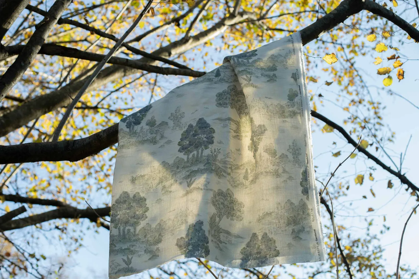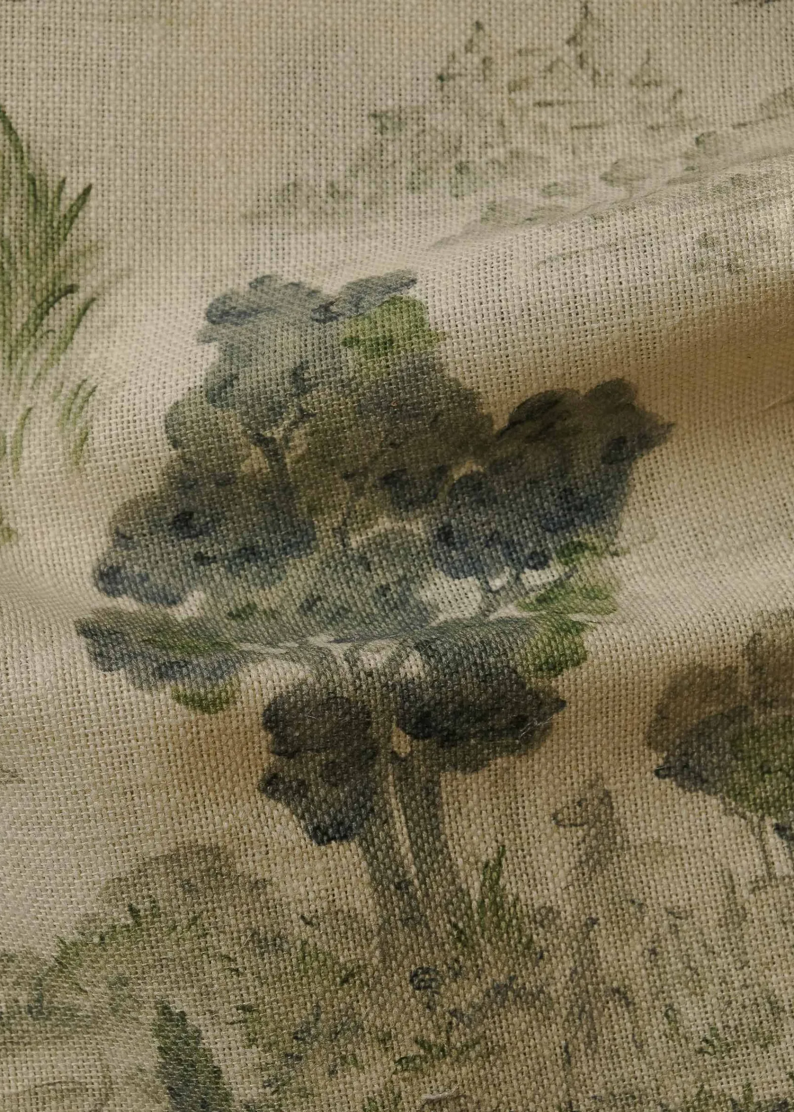 Royal Oak Aqua de Coordonné es un diseño de paisajes en azul/azul marino de la colección Cotswolds Fabrics. Paisaje colosal de árboles majestuosos en una composición monocromática de toile de jouy.