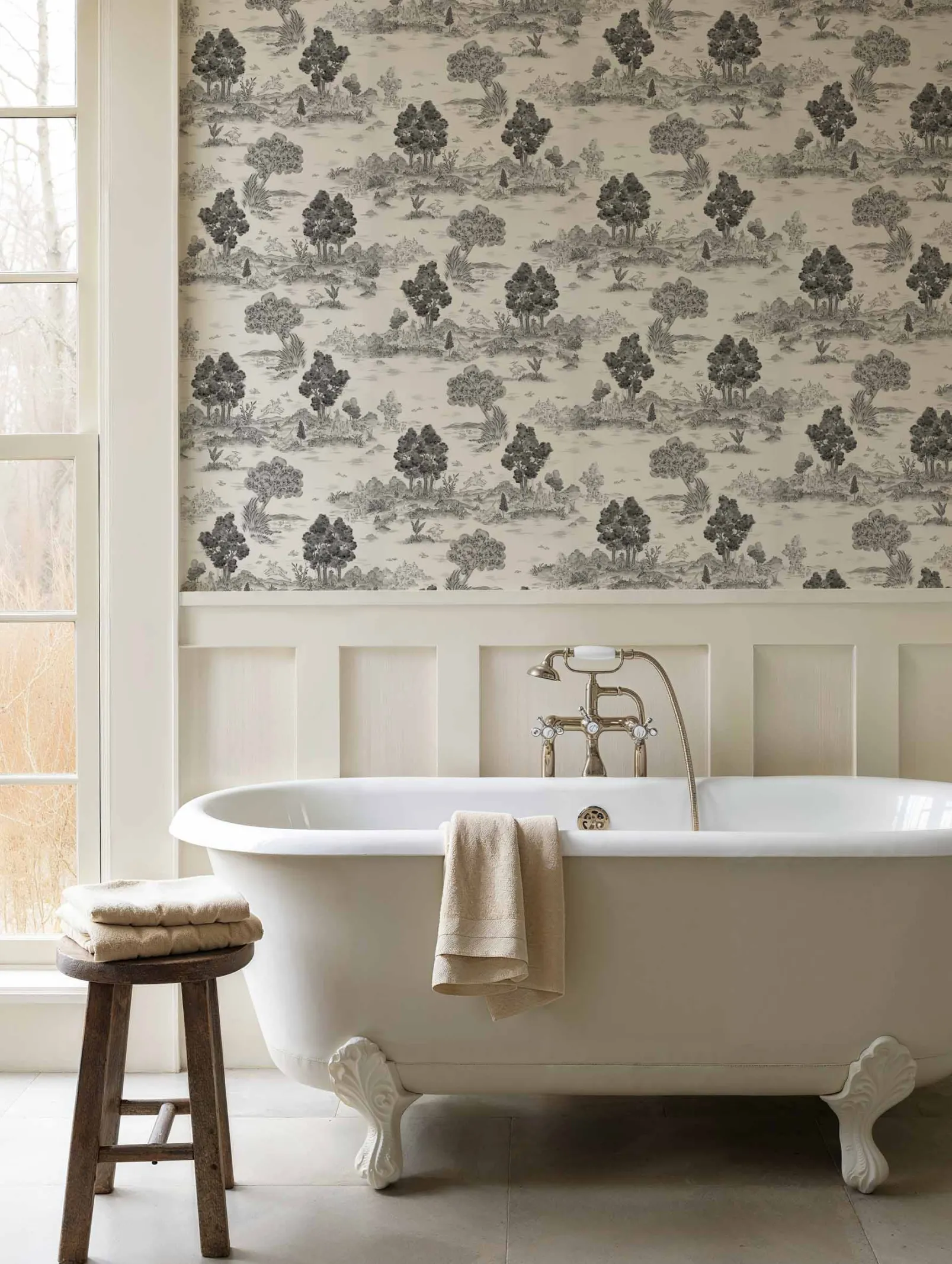 Royal-Oak Black de Coordonné es un diseño de Paisajes en negro de la colección Cotswolds. Un paisaje colosal de árboles majestuosos en una toile de jouy monocroma.