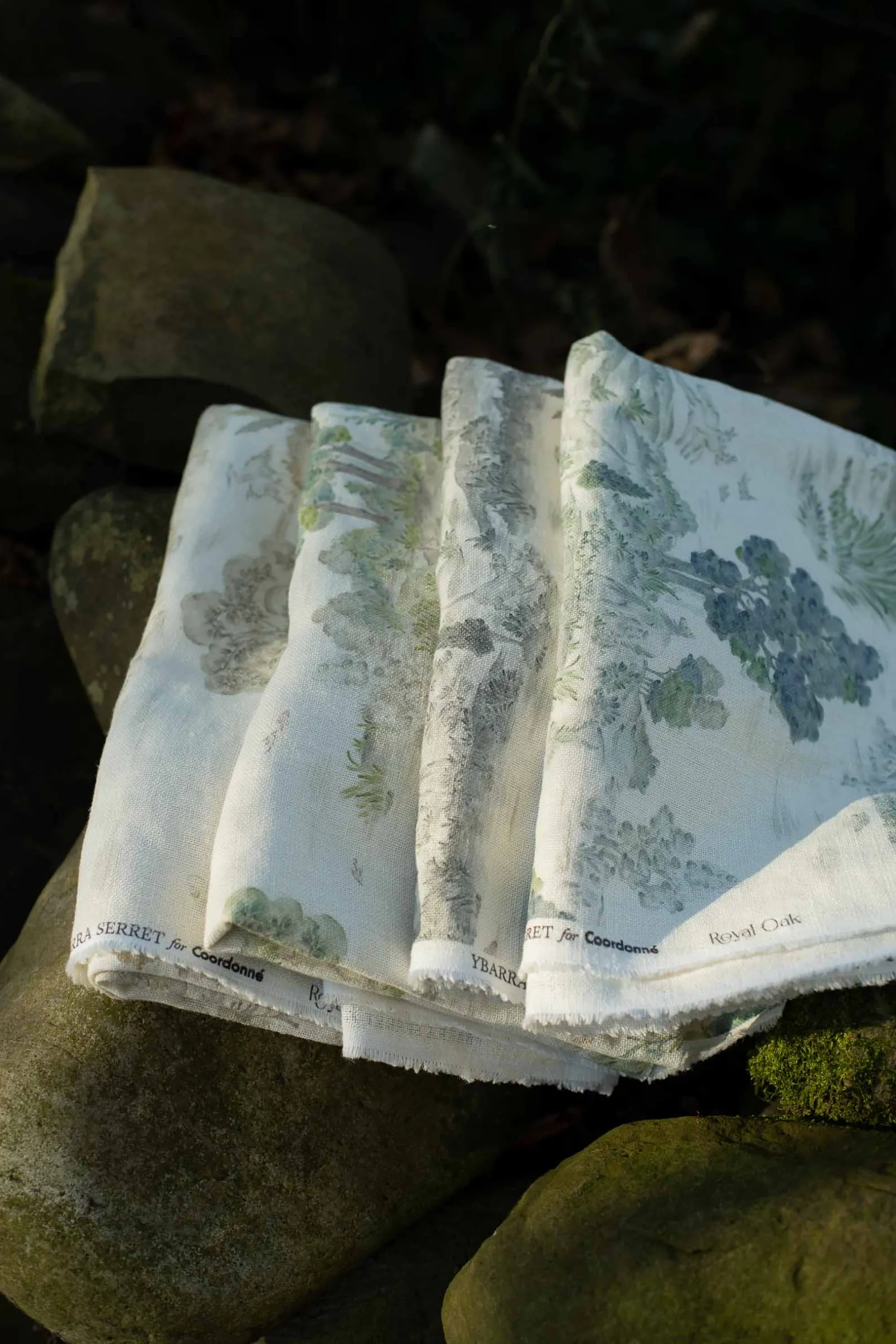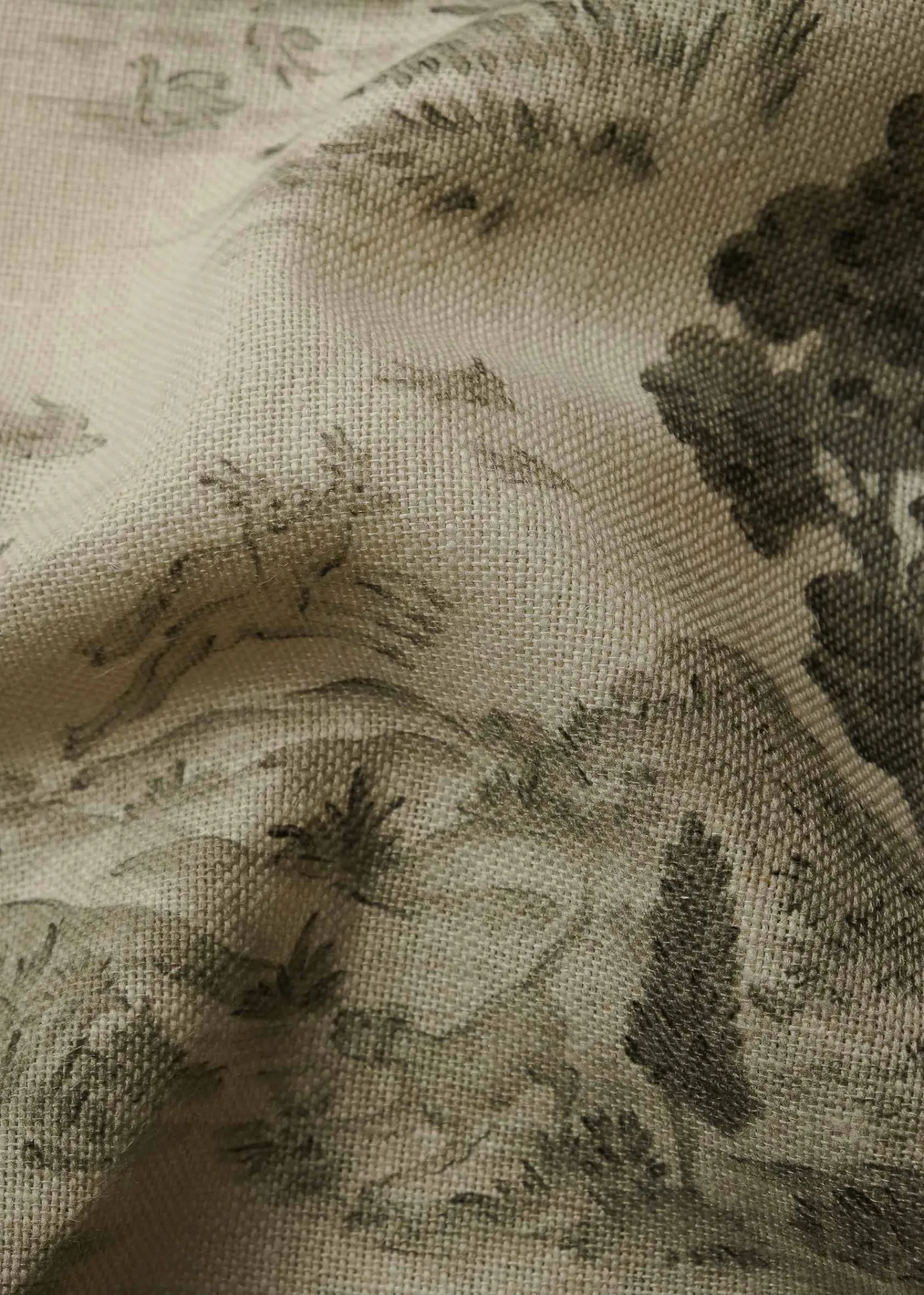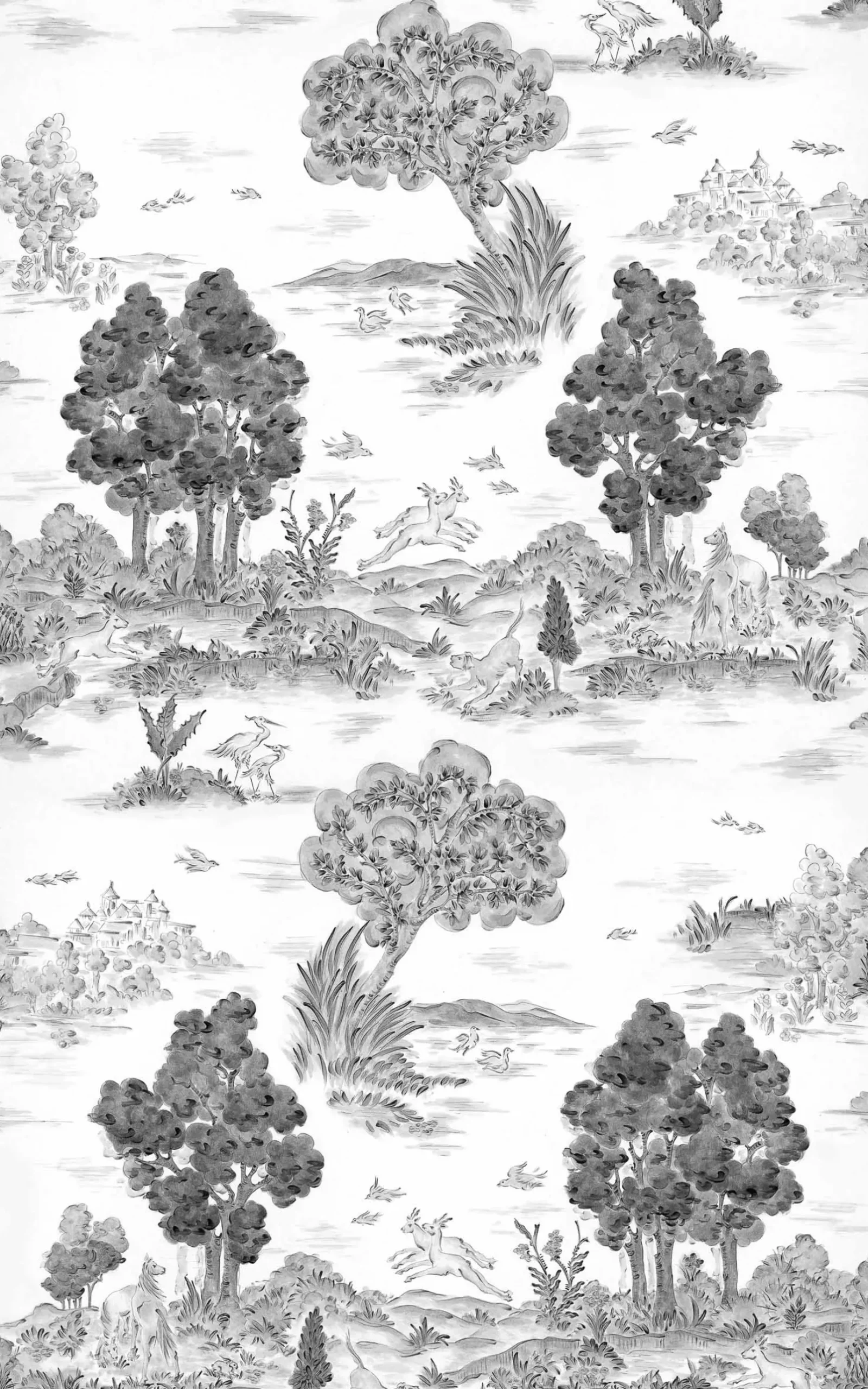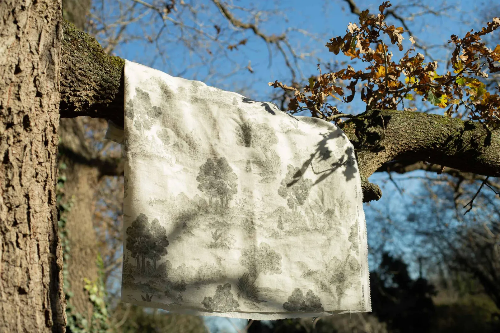 Royal Oak Black de Coordonné es un diseño de Paisajes en Negro de la colección Cotswolds Fabrics. Paisaje colosal de árboles majestuosos en una composición monocromática de toile de jouy.