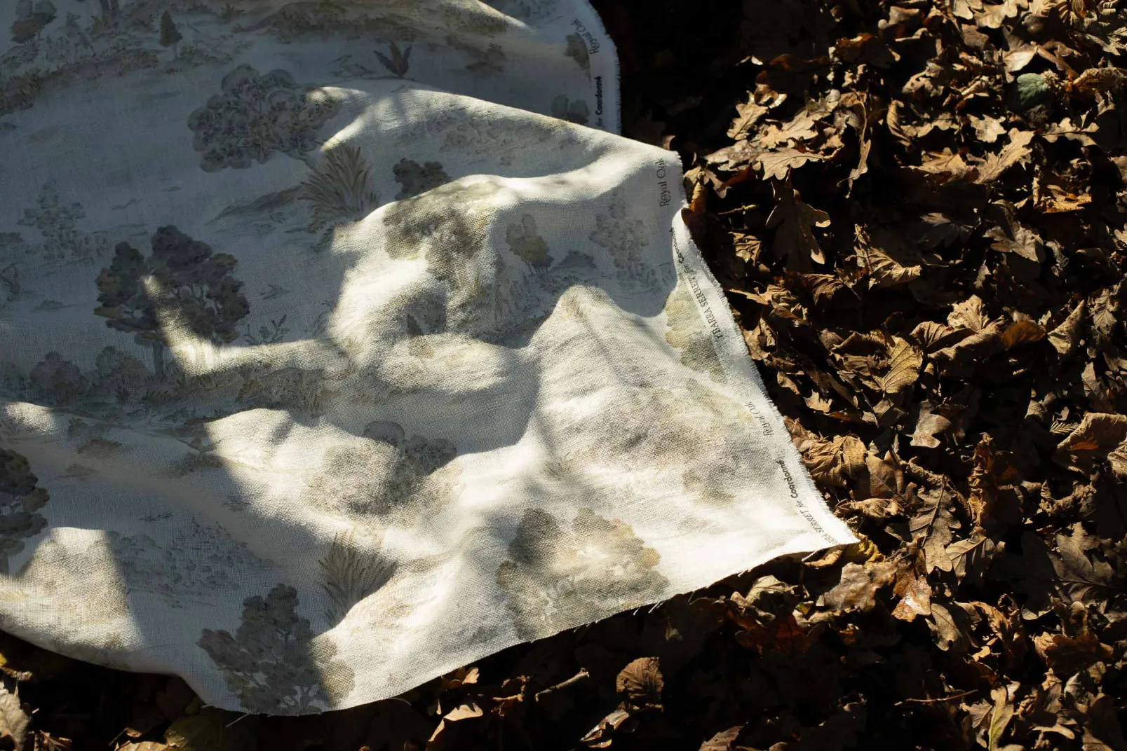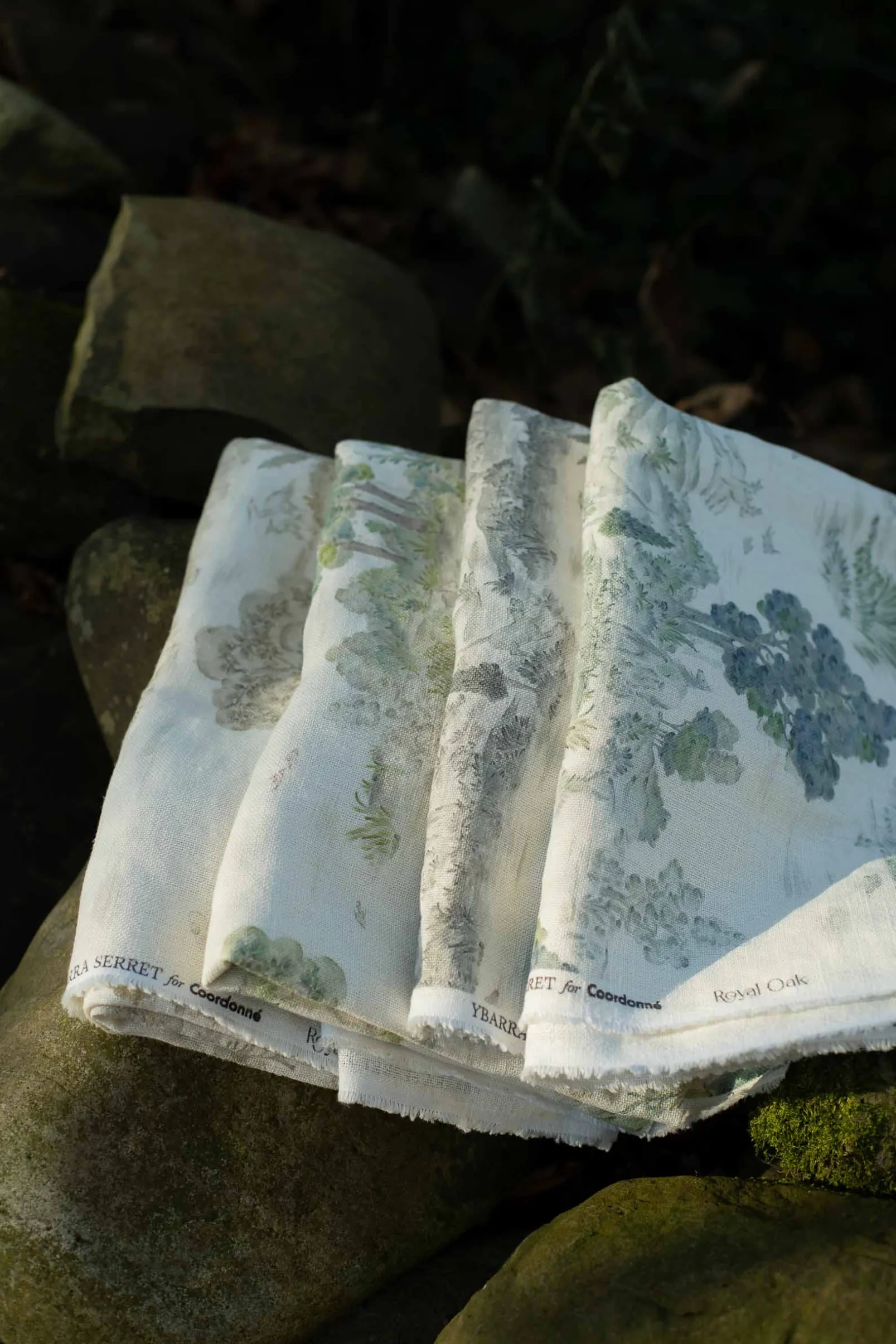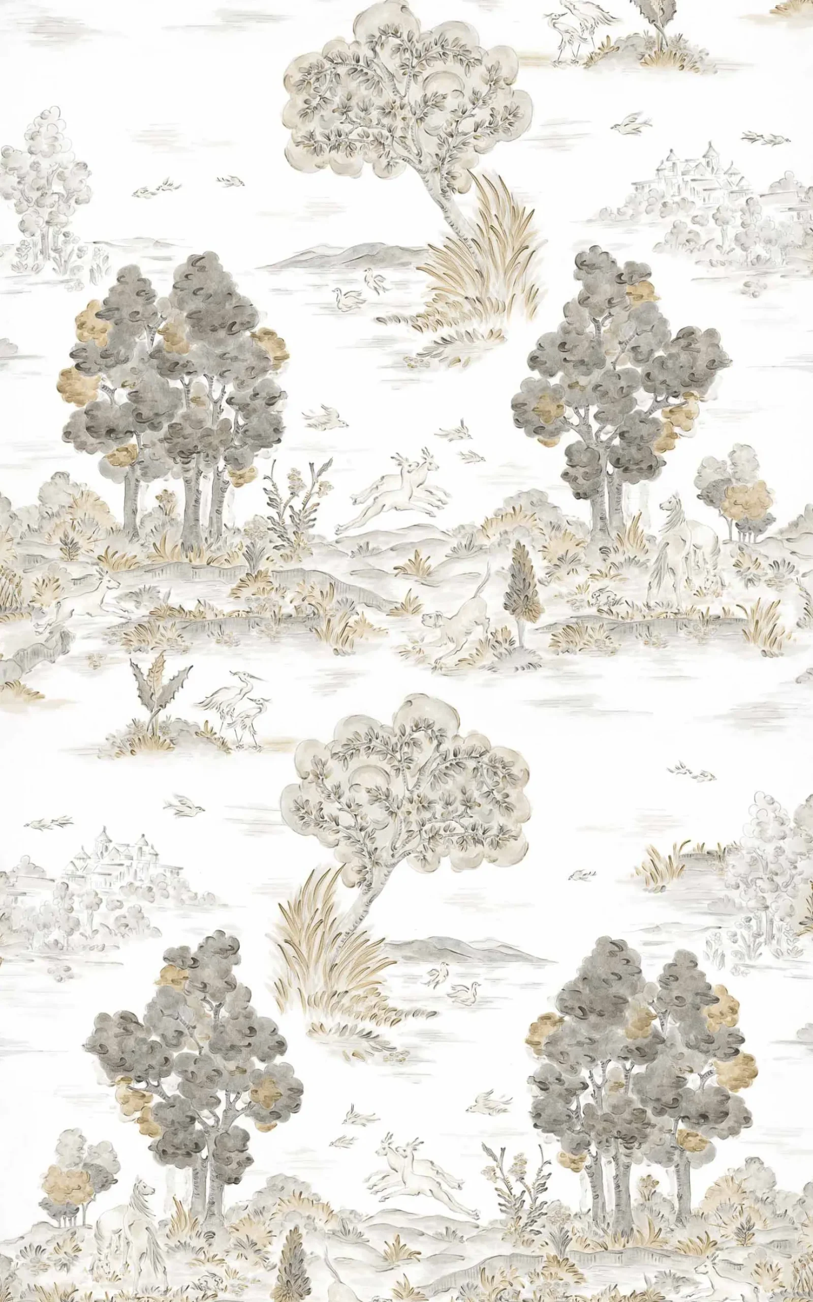 Royal Oak Sunny de Coordonné es un diseño de Paisajes en Beige/Nude de la colección Cotswolds Fabrics. Paisaje colosal de árboles majestuosos en una composición monocromática de toile de jouy.