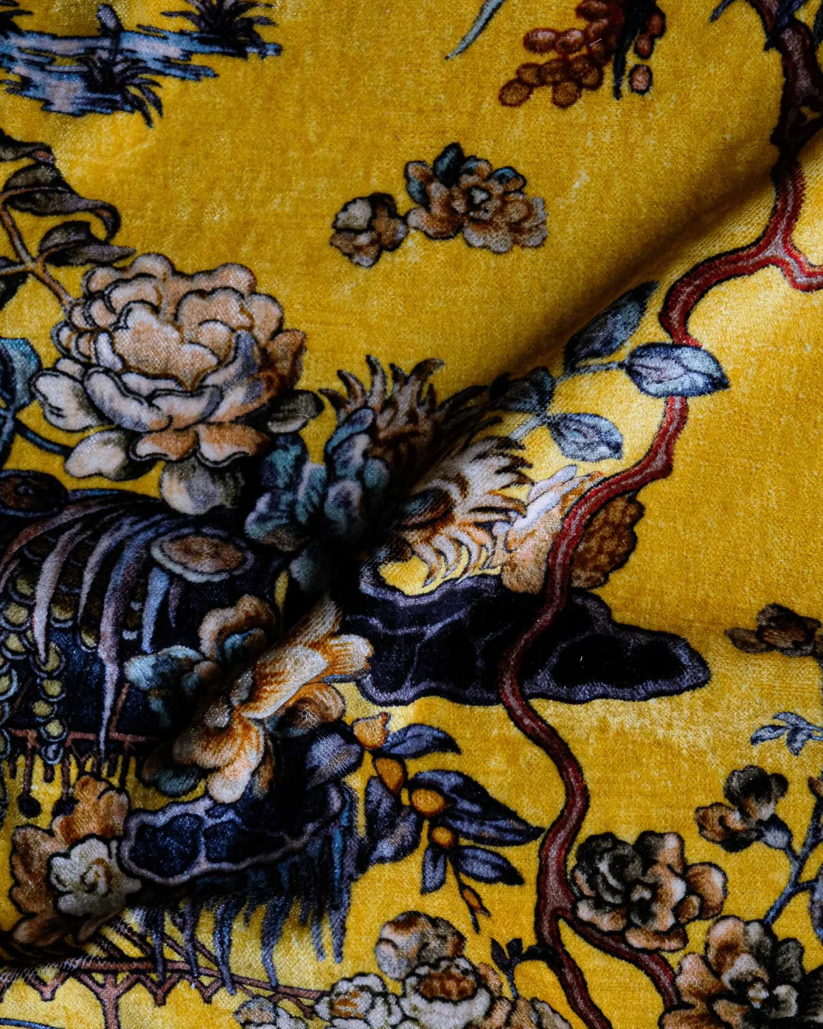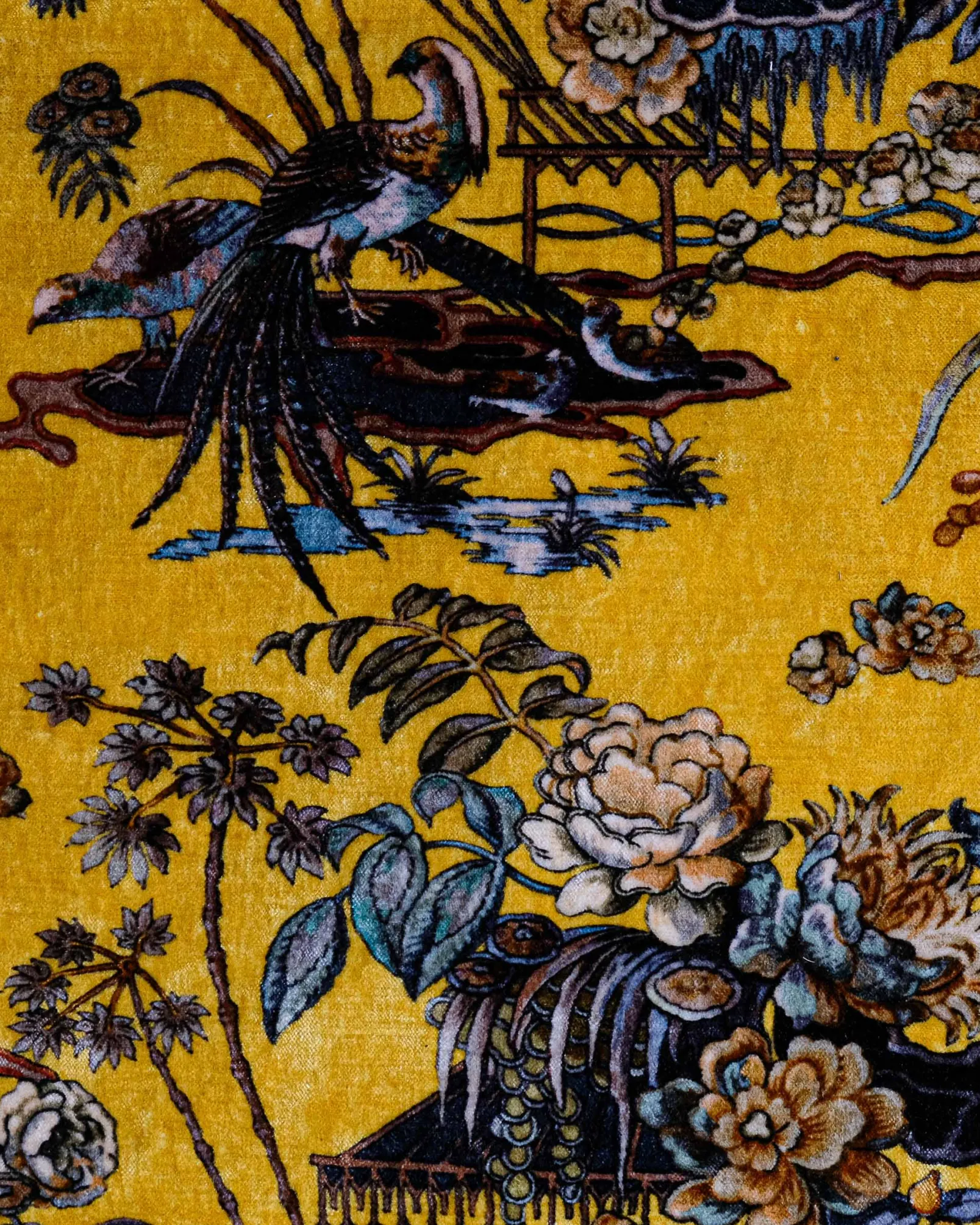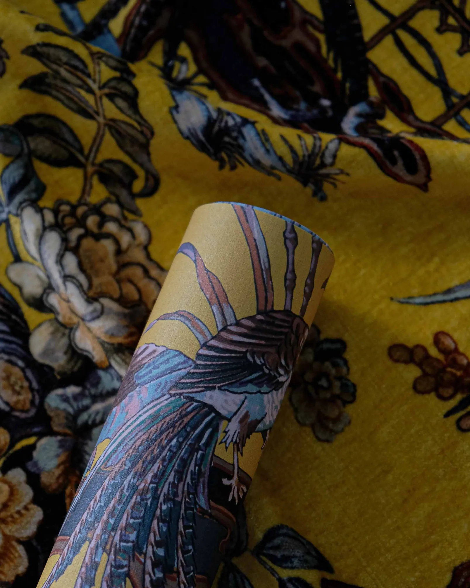 La tela Sacred Pheasants Amber de Coordonné es un diseño de animales en amarillo con tonos rojos de la colección Forbidden City Fabrics.