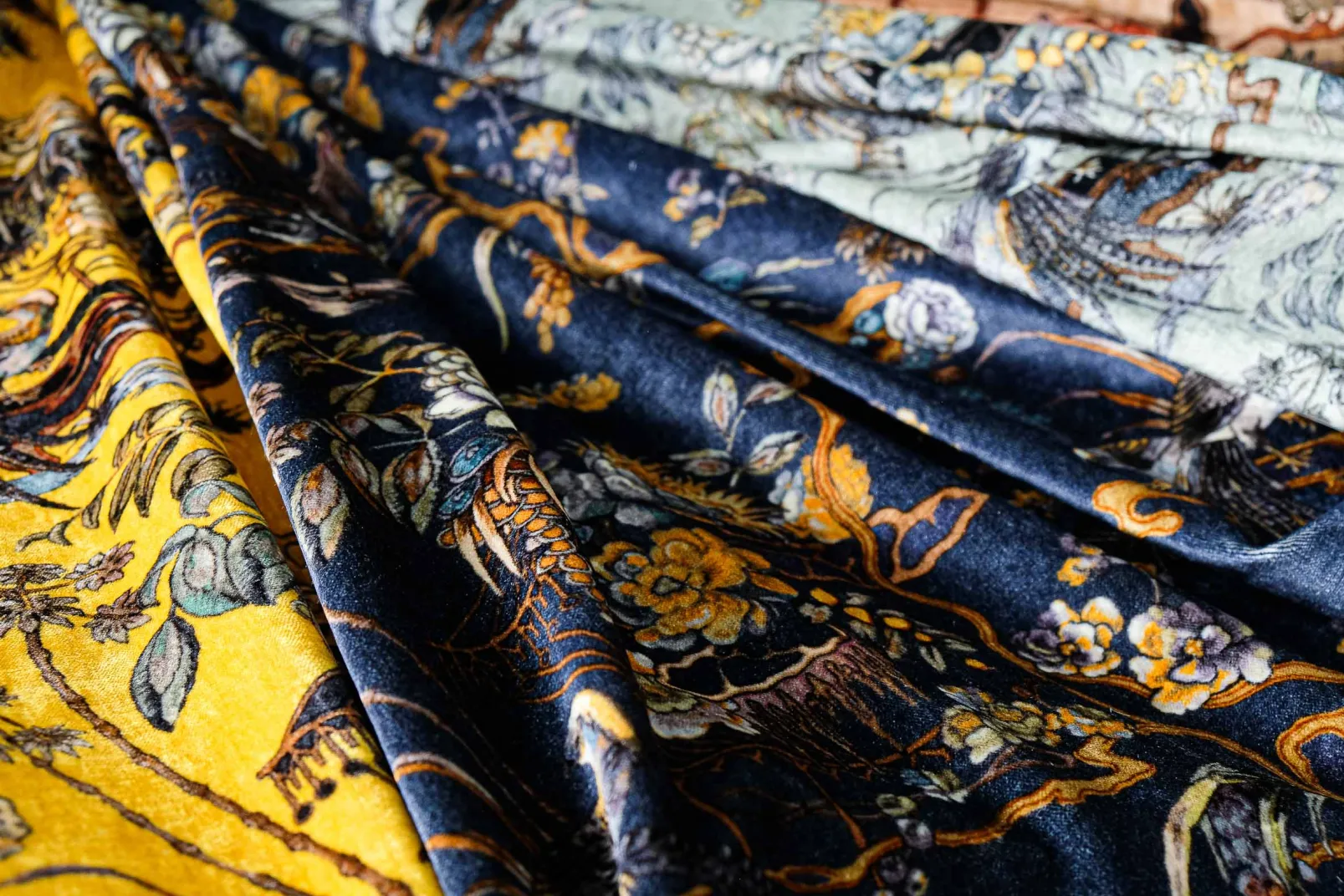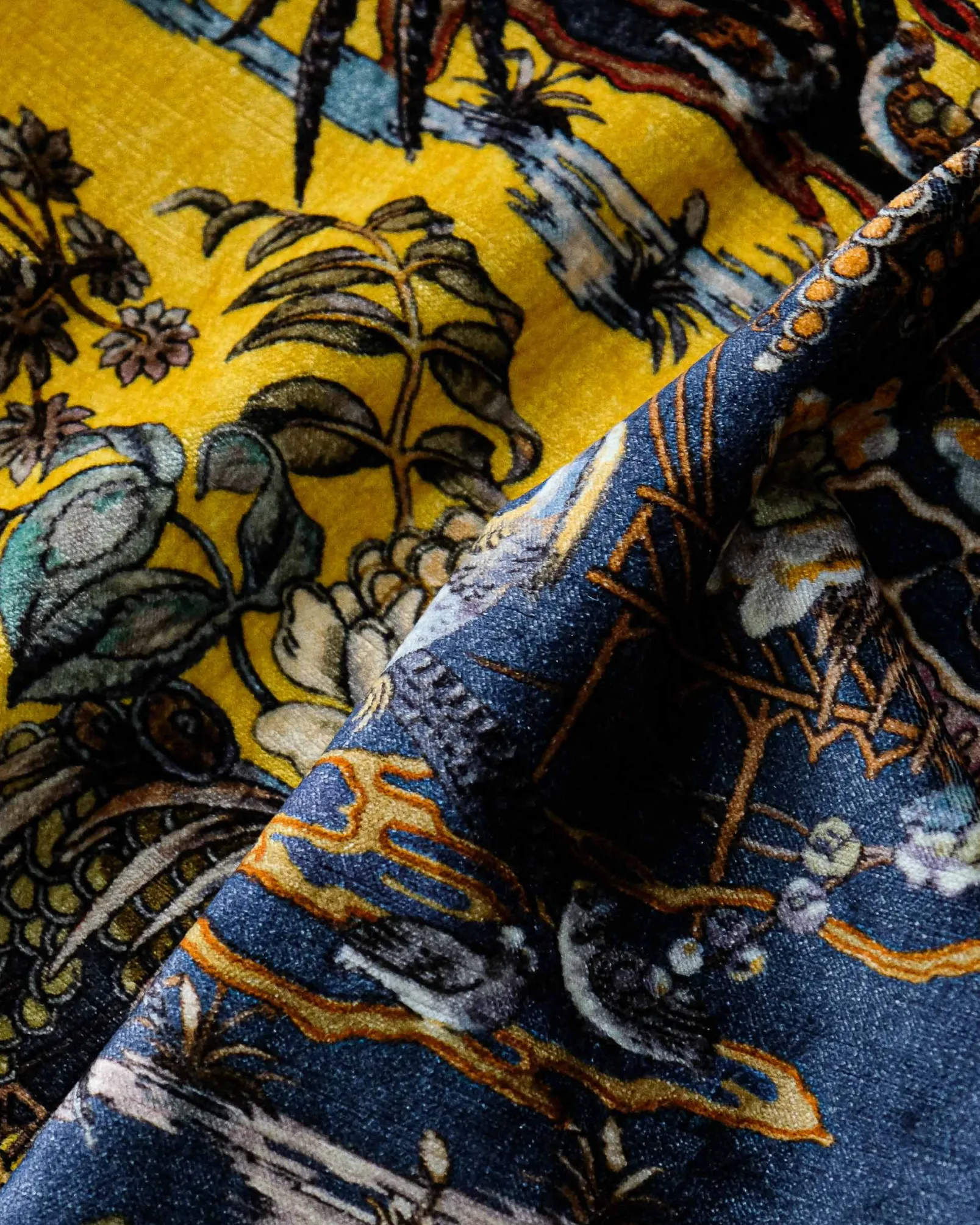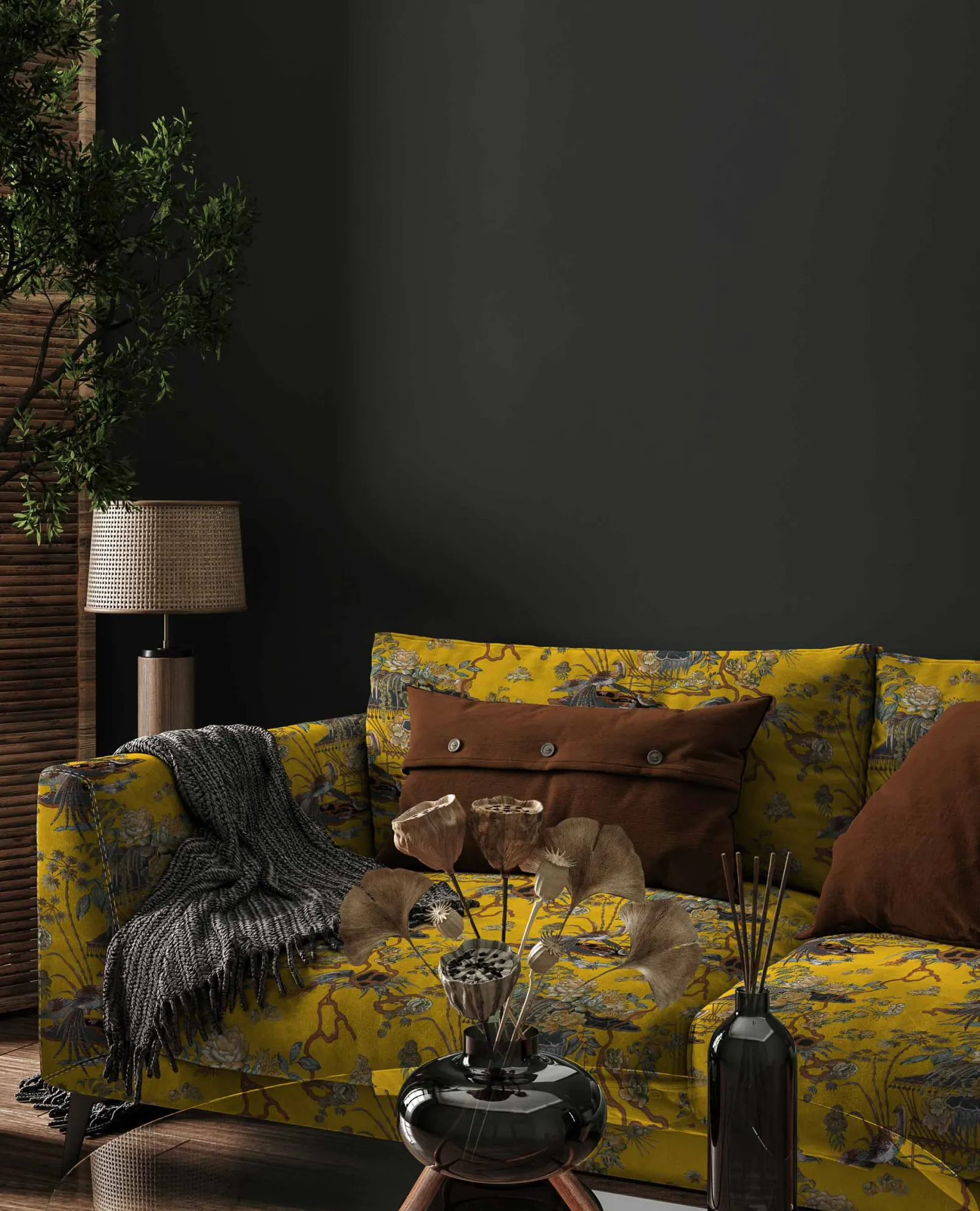 La tela Sacred Pheasants Amber de Coordonné es un diseño de animales en amarillo con tonos rojos de la colección Forbidden City Fabrics.