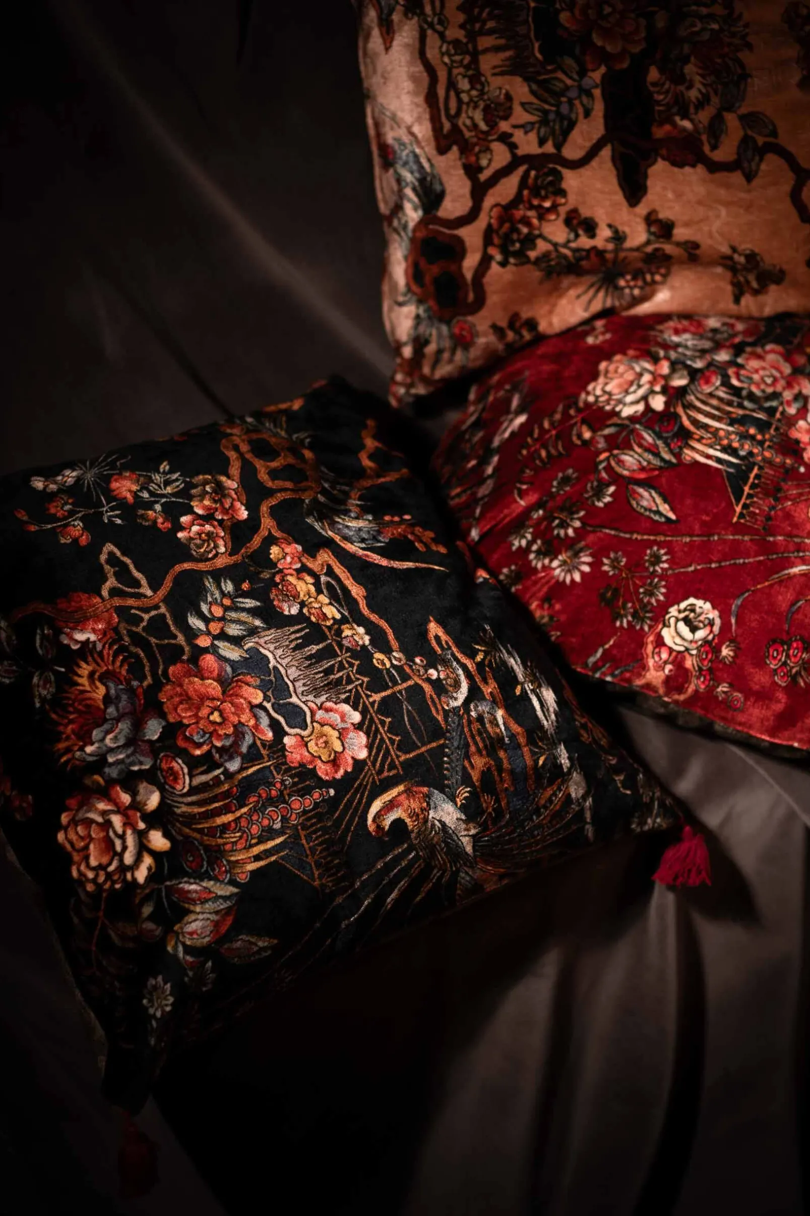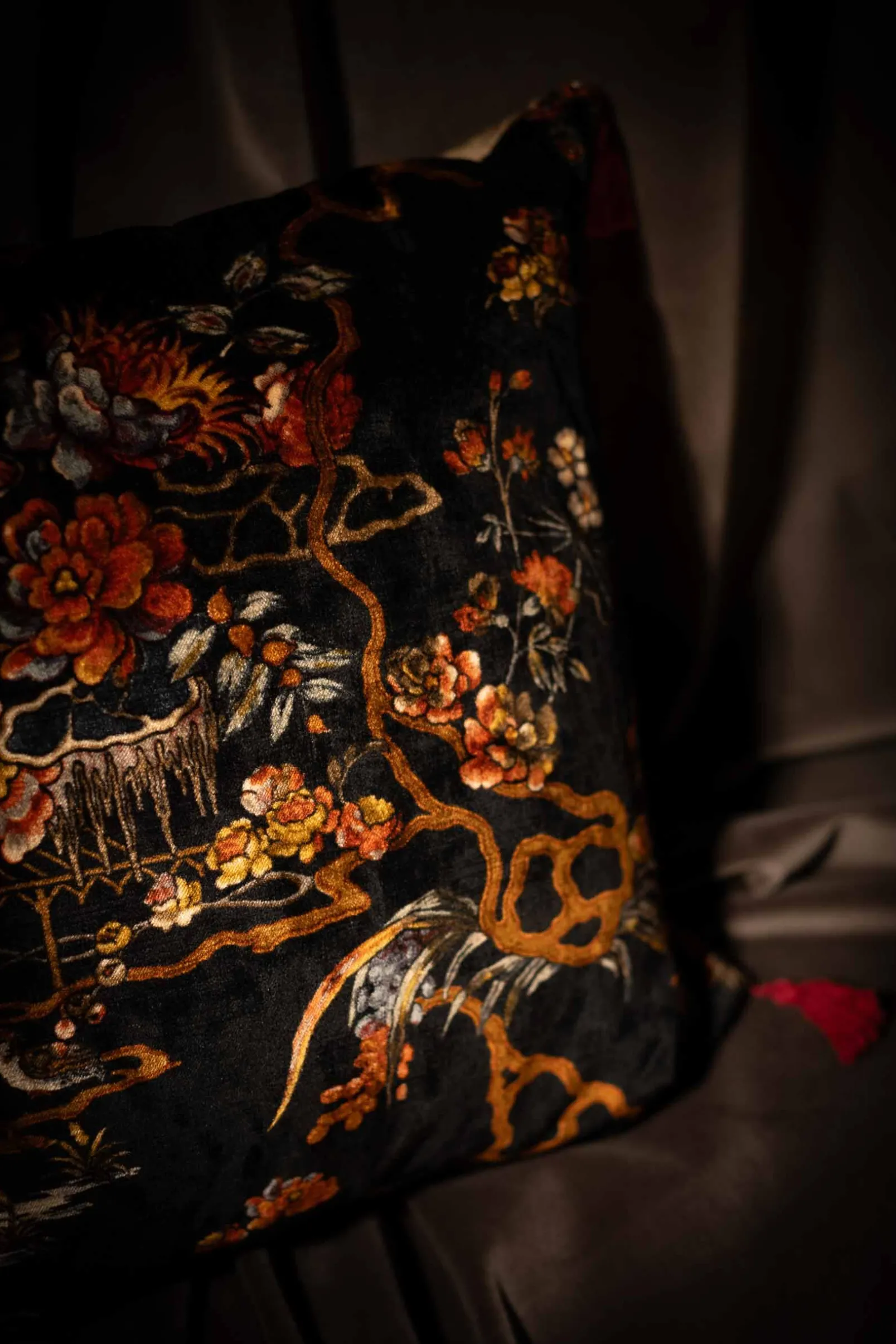 Sacred Pheasants Onyx de Coordonné es un diseño de inspiración floral en negro de la colección Forbidden City. Reverso en terciopelo liso tono topo.