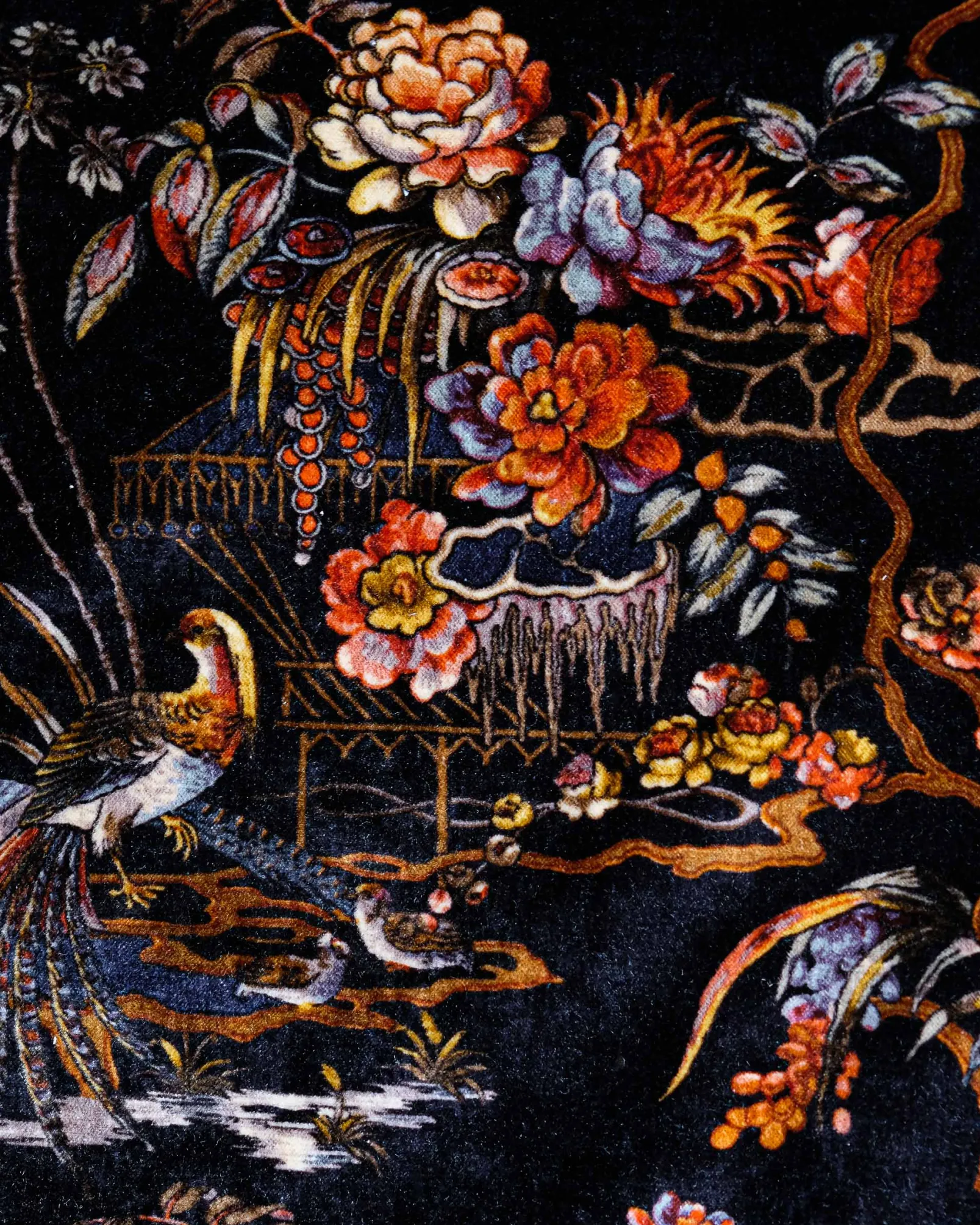 La tela Sacred Pheasants Onyx de Coordonné es un diseño de animales en negro con tonos dorados de la colección Forbidden City Fabrics.