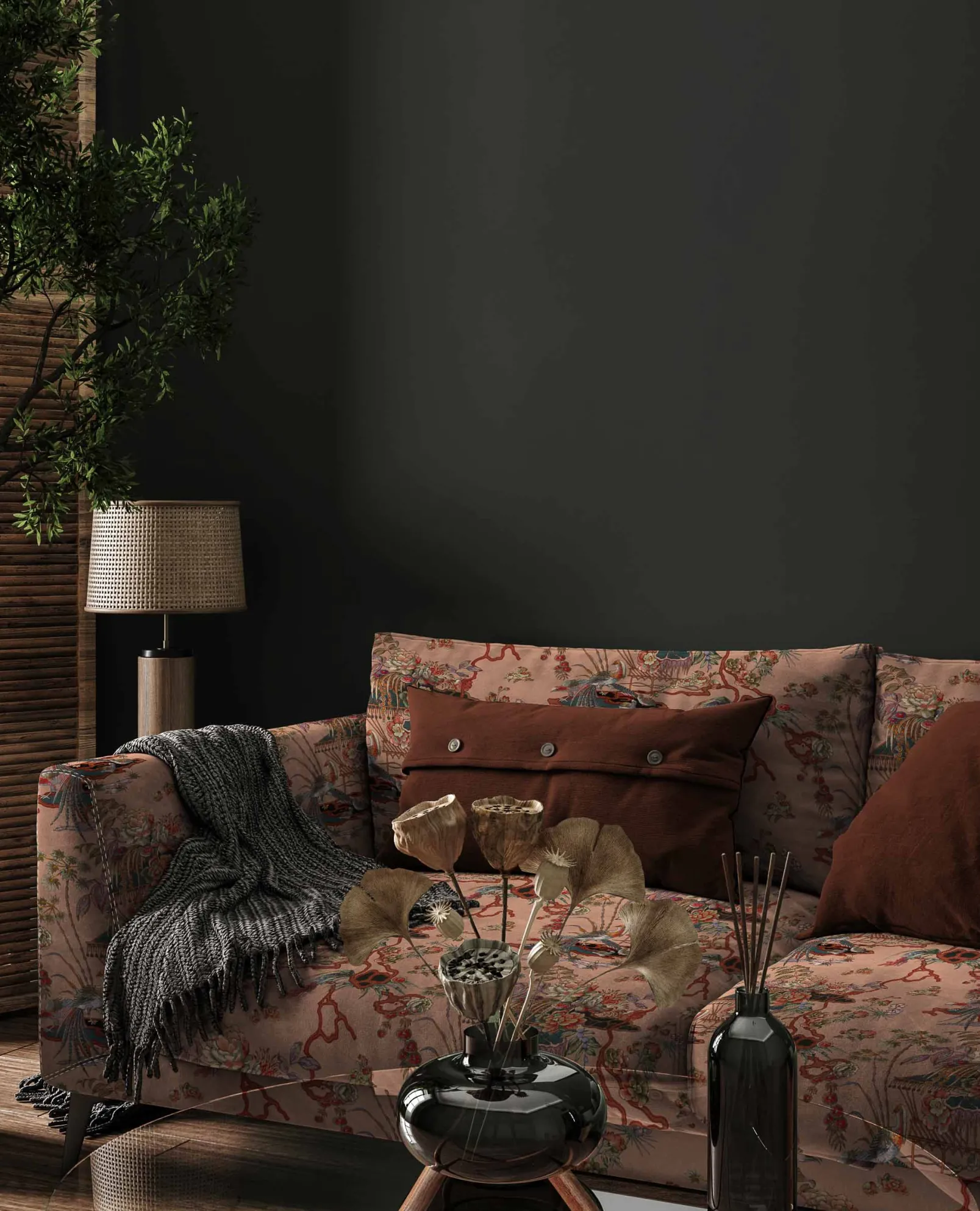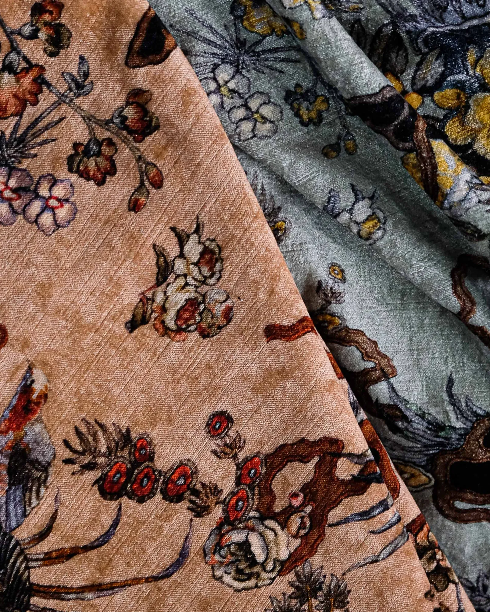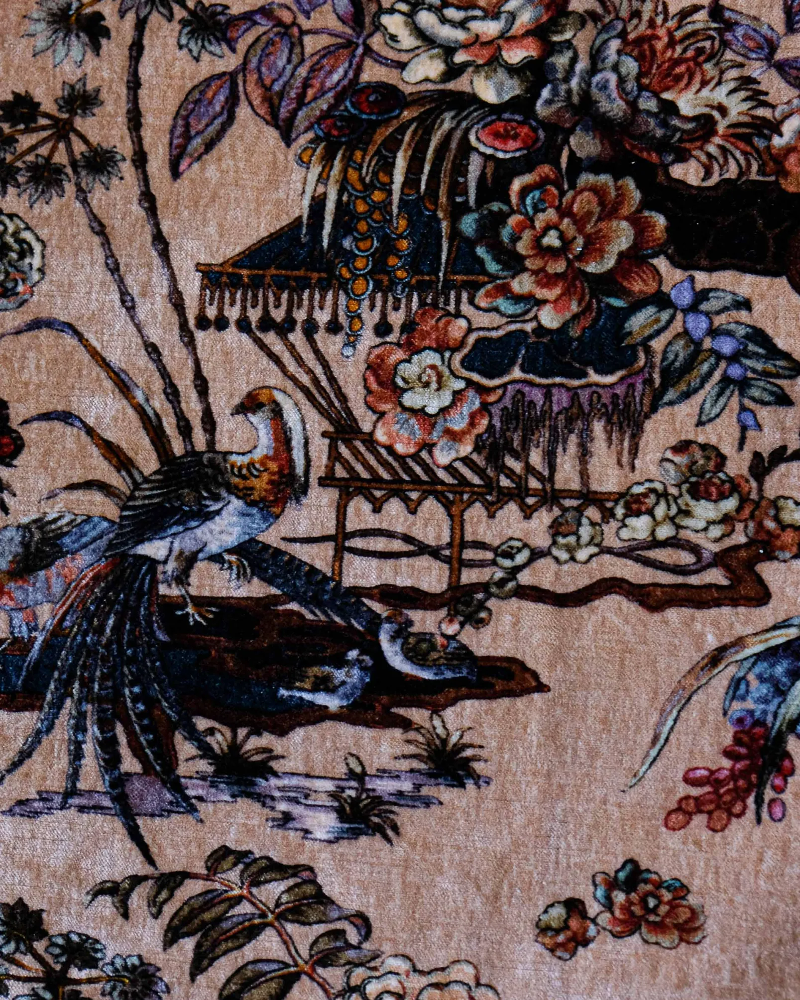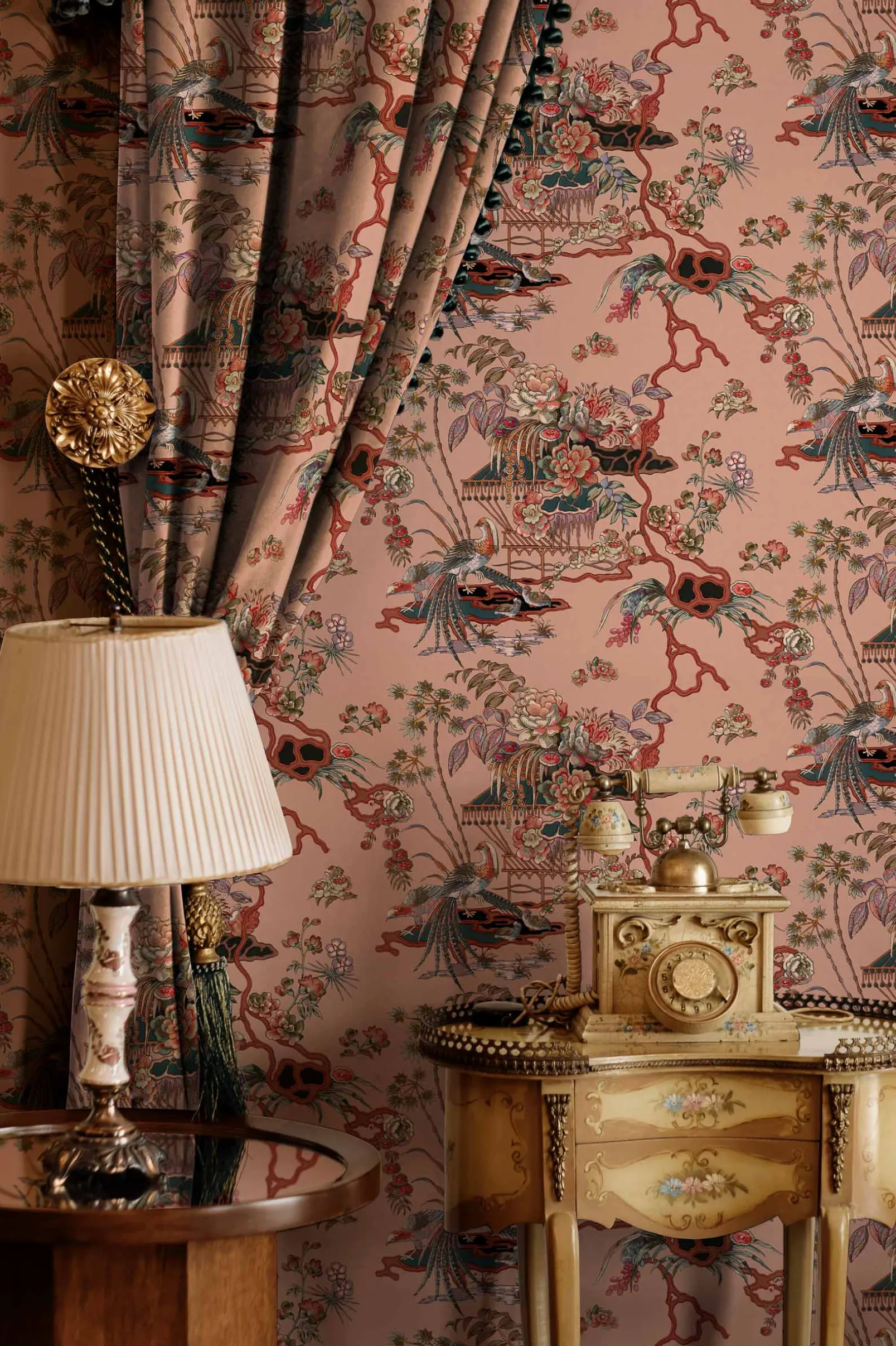 La tela Sacred Pheasants Rose de Coordonné es un diseño de animales en rosa con tonos rojos de la colección Fordbidden City Fabrics.