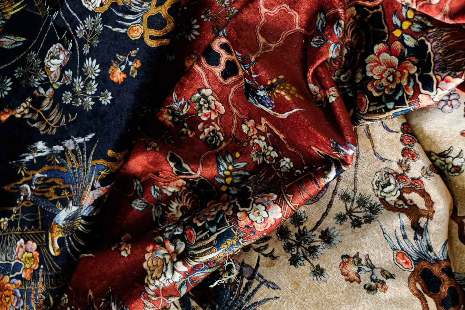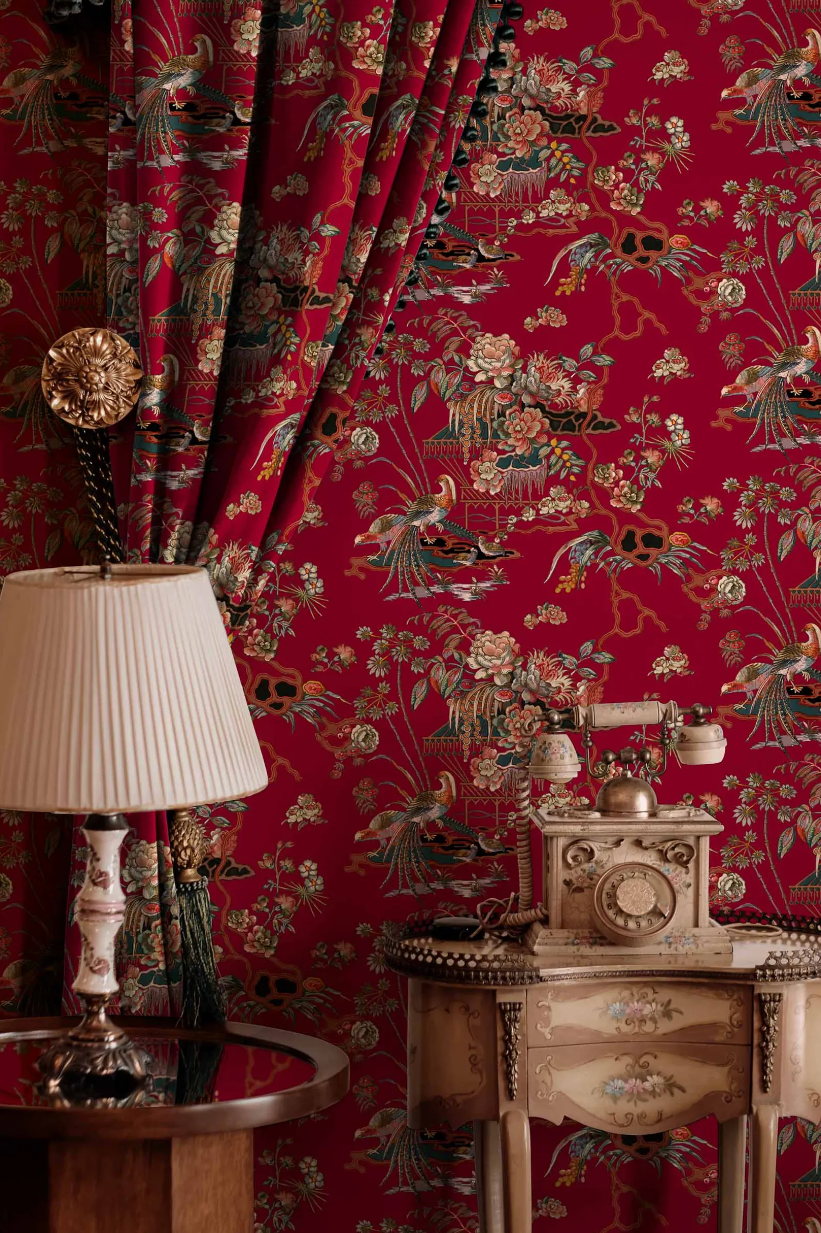La tela Sacred Pheasants Ruby de Coordonné es un diseño de animales en rojo de la colección Forbidden City Fabrics.