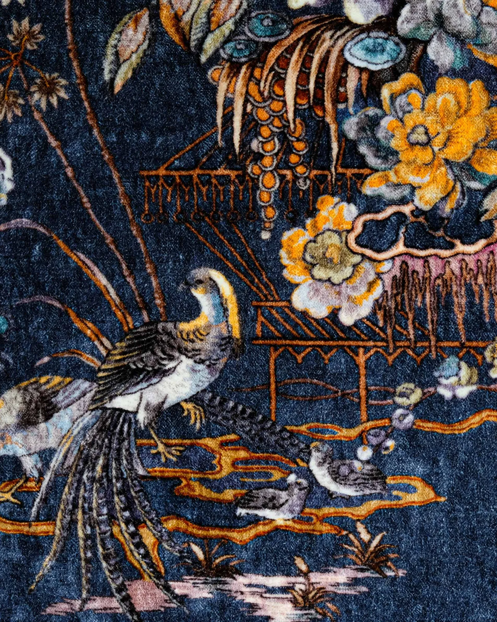 La tela Sacred Pheasants Sapphire de Coordonné es un diseño de animales en azul con tonos dorados de la colección Forbidden City Fabrics.
