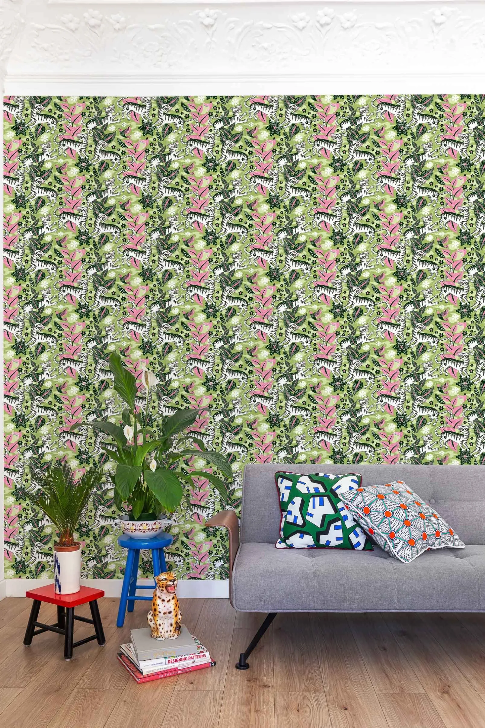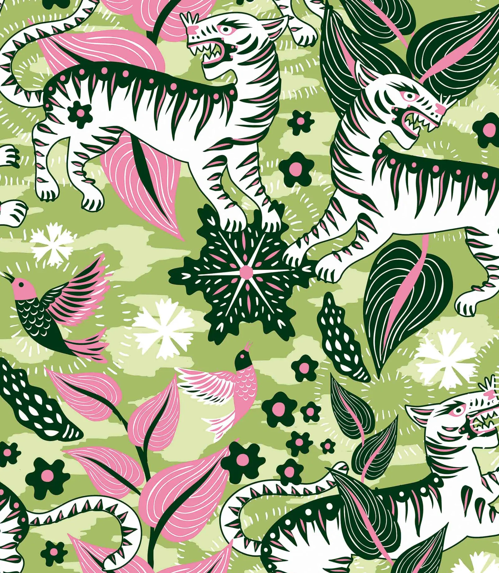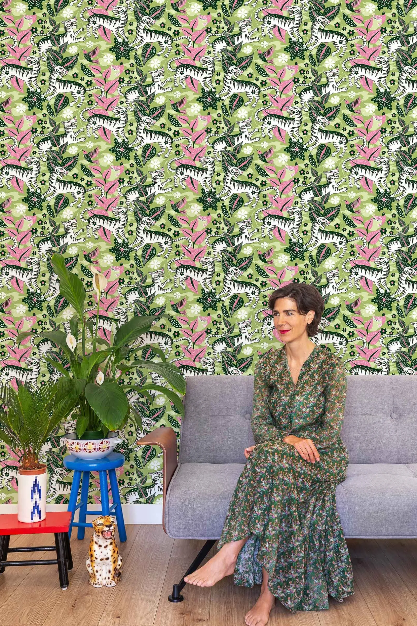 Papel pintado Selva de Tigres Morning Coordonné de la colección 40 aniversario con diseño de animales en tonos verdes.