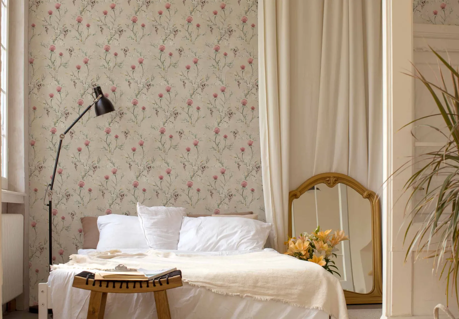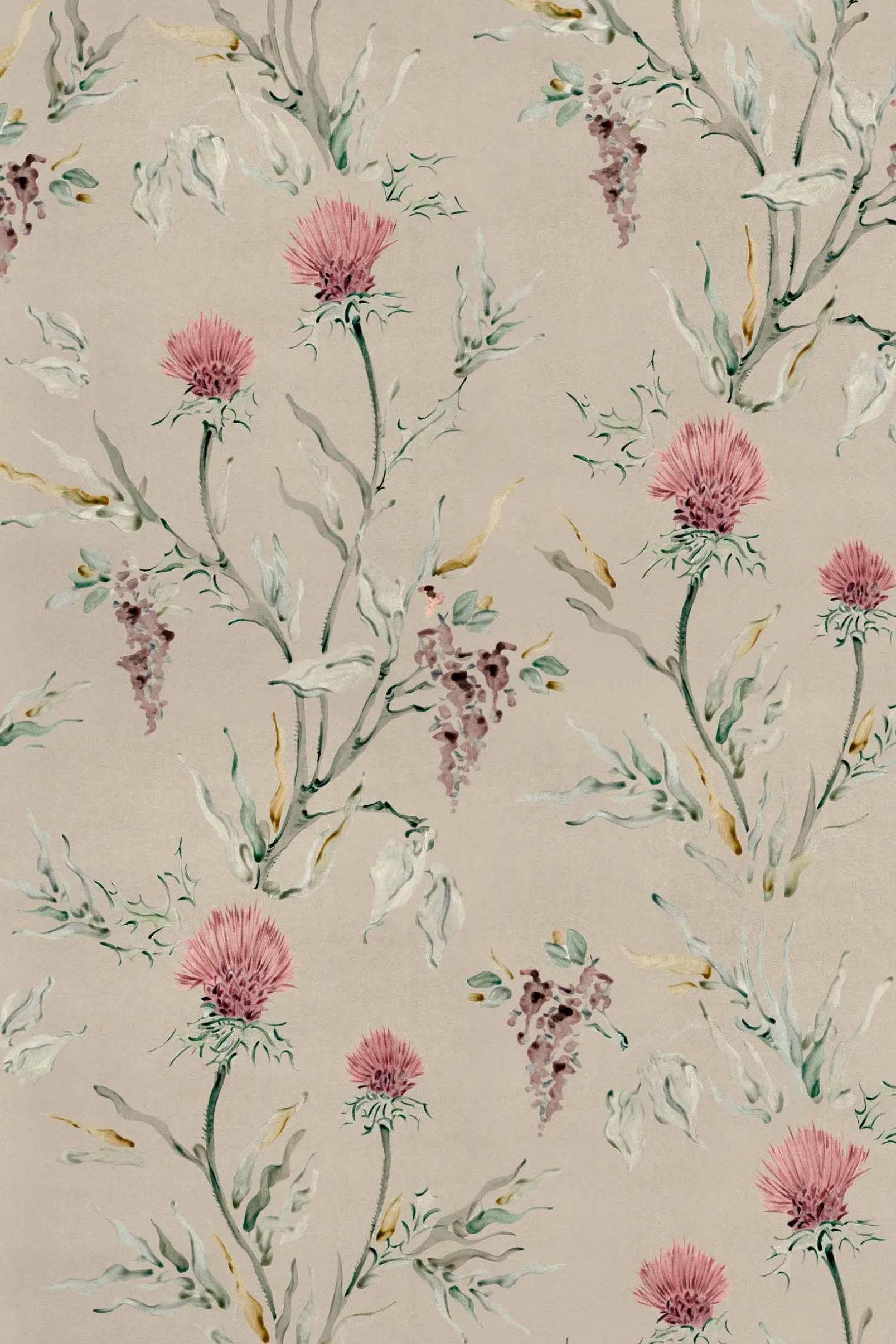 Silvestre Papiro de Coordonn es un papel pintado de inspiración vegetal en tonos beige/nude . Rebeldes cardos multicolores que se abren paso entre la ropa de cama del invernadero.