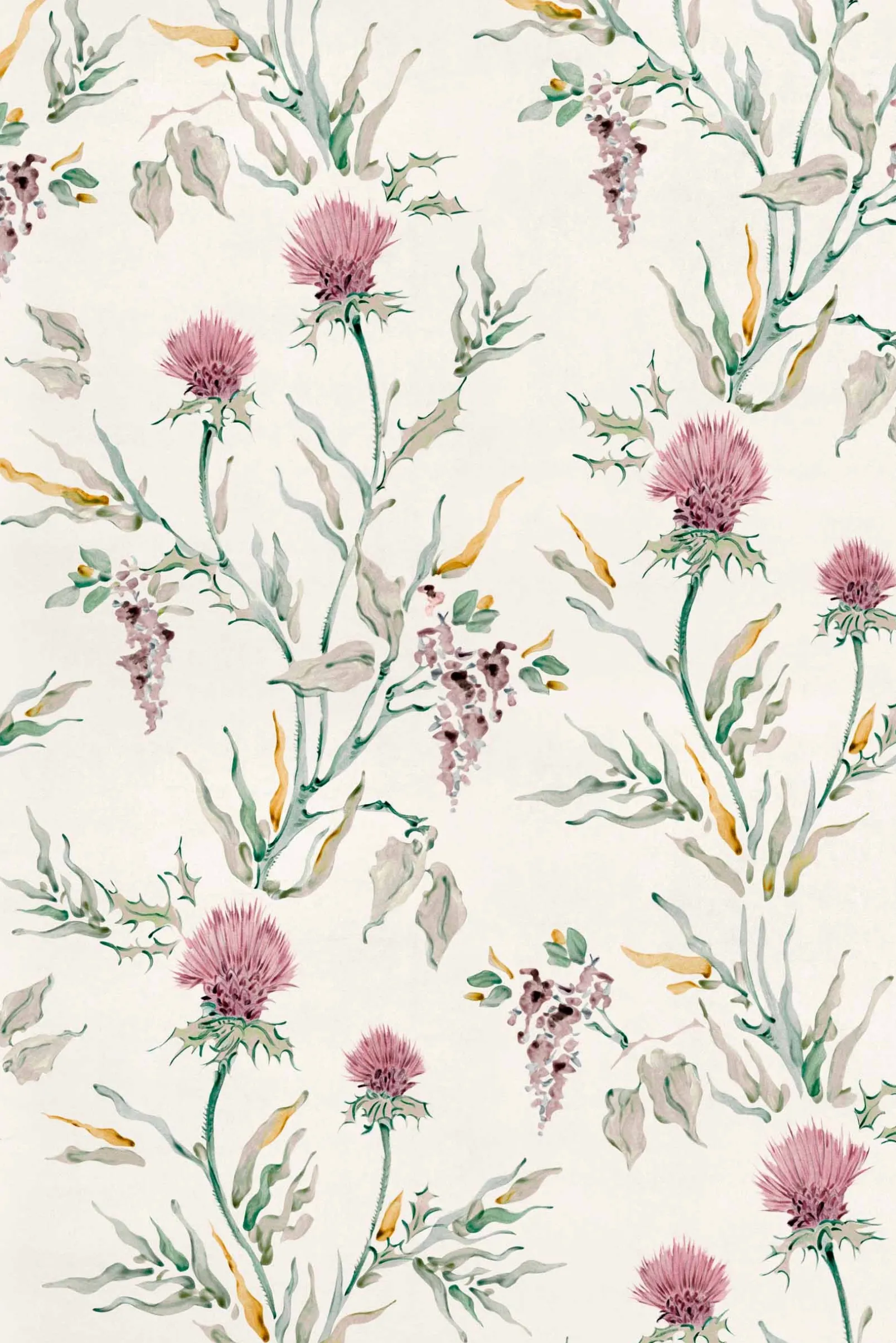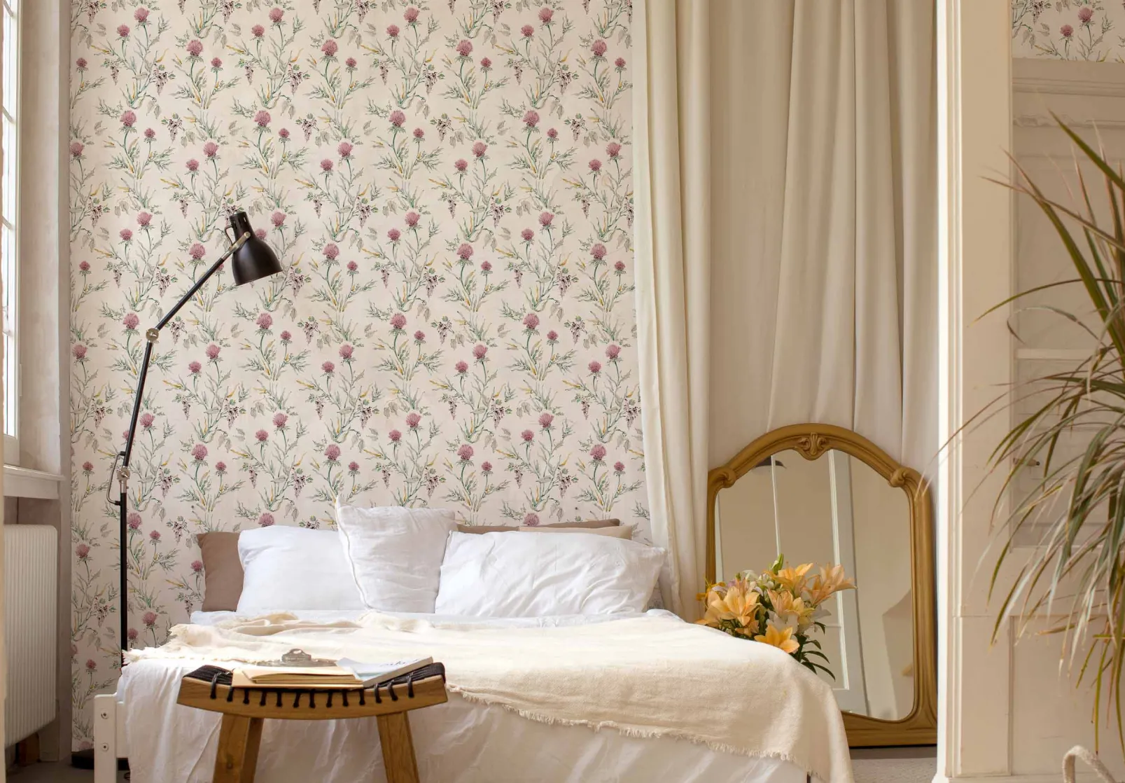 Silvestre Rosaceo de Coordonn es un papel pintado de inspiración vegetal en tonos rosa/lila. Rebeldes cardos multicolores que se abren paso entre la ropa de cama del invernadero.