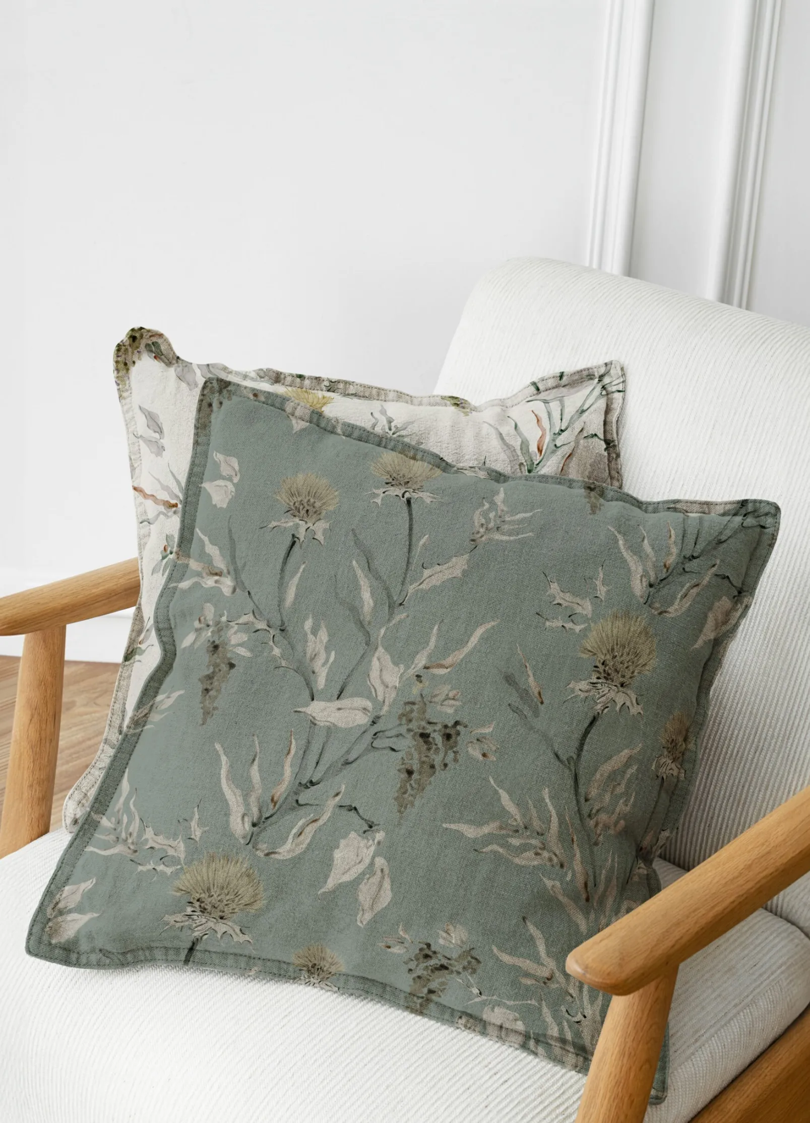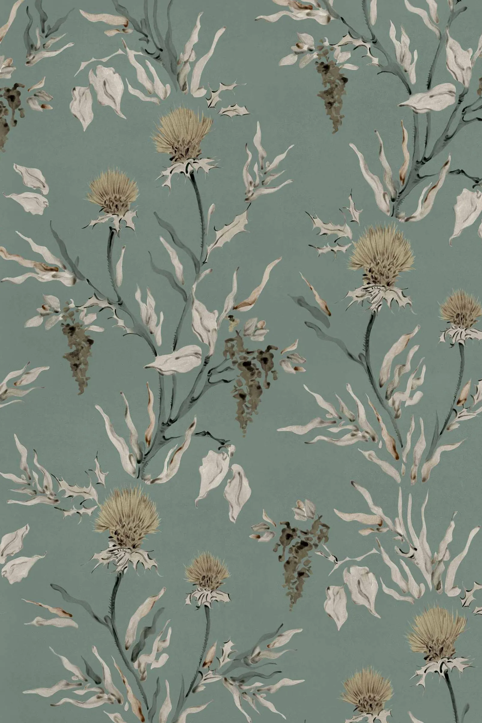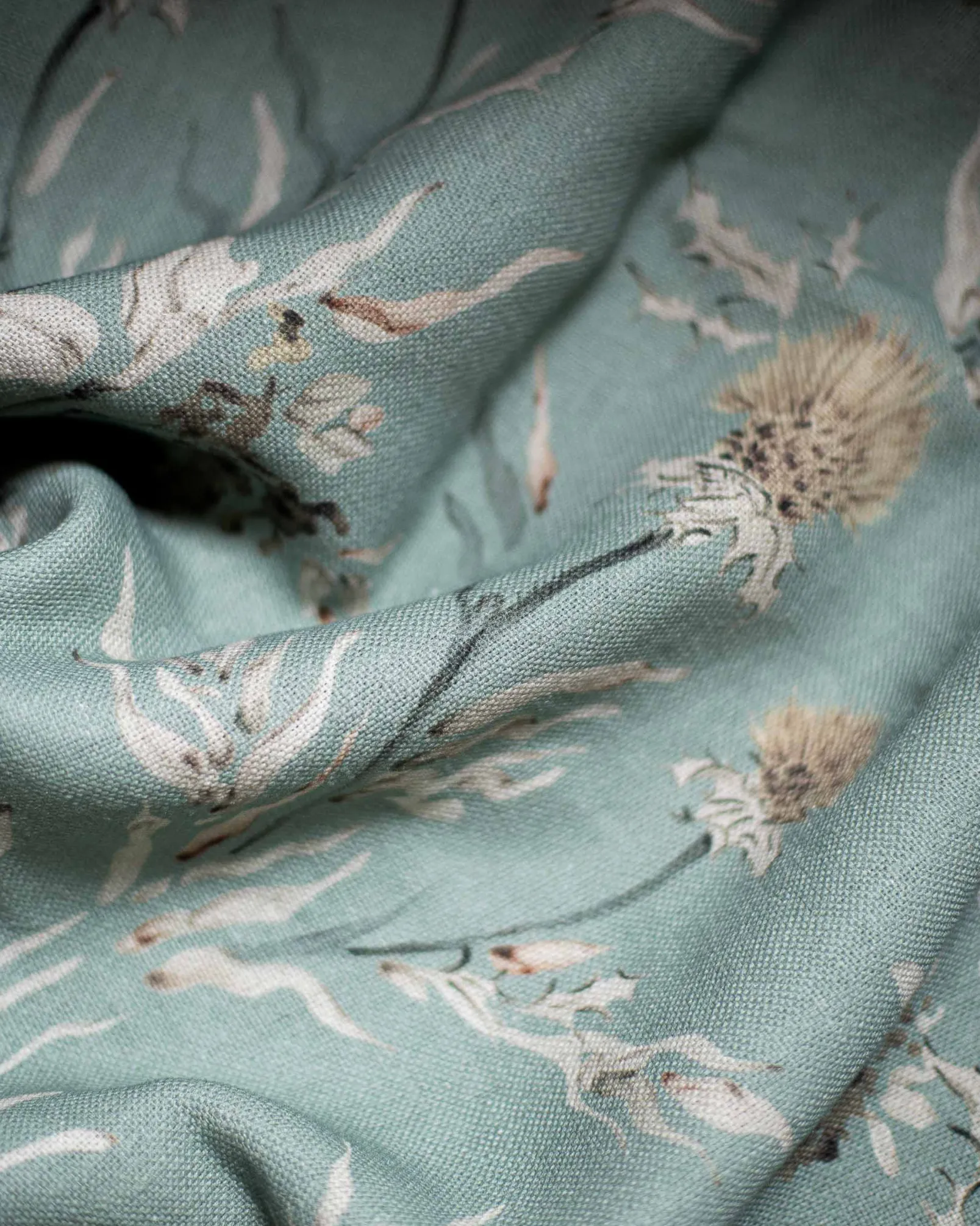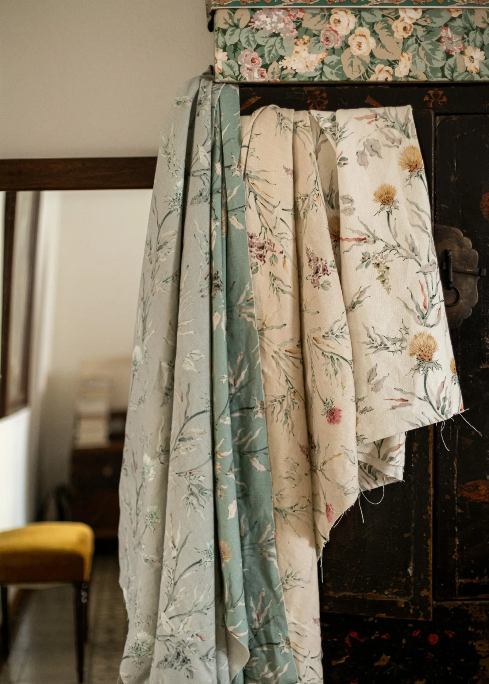 La tela Silvestre Sage de Coordonné es un diseño de inspiración floral en color verde de la colección Palacio de Cristal Fabrics.