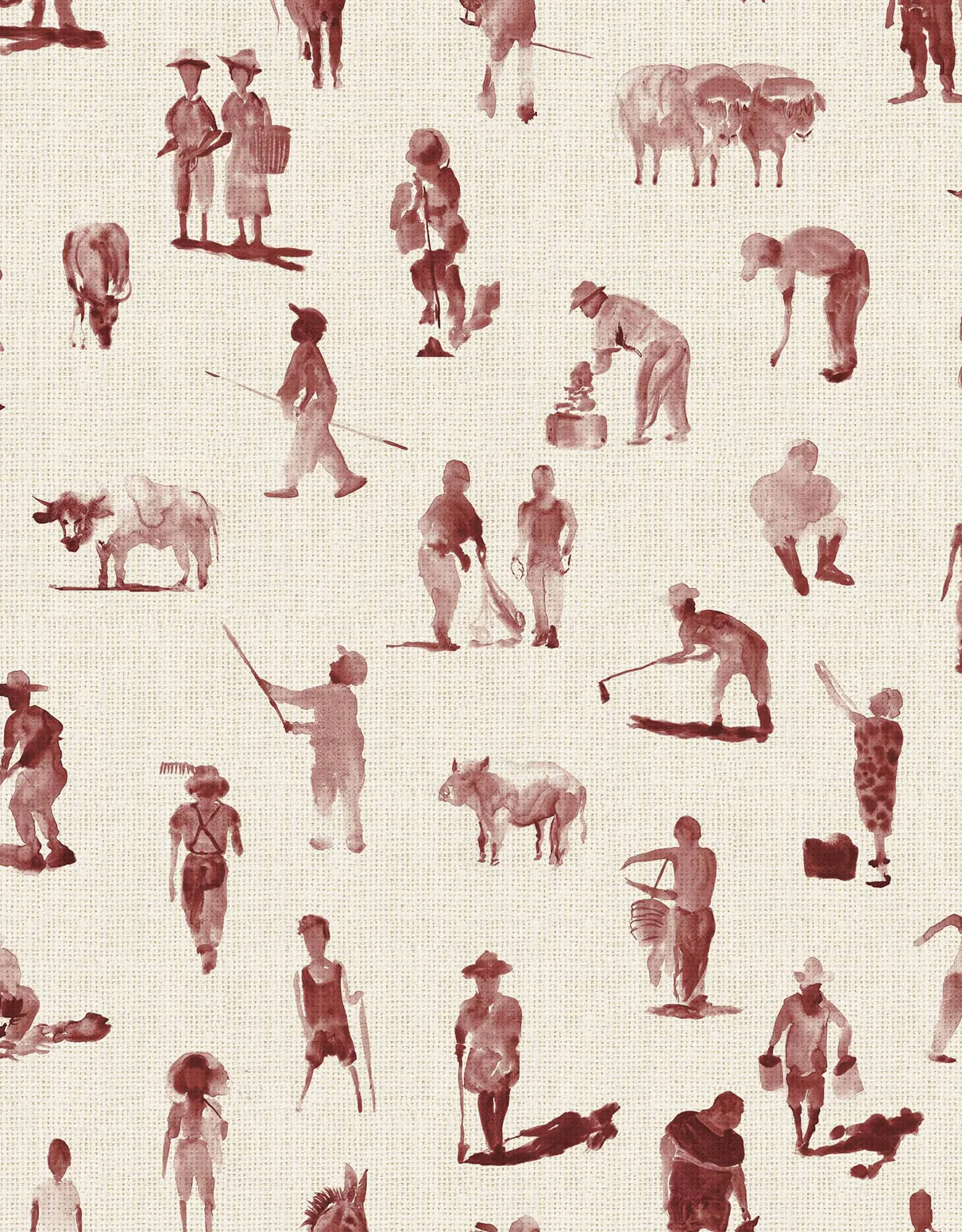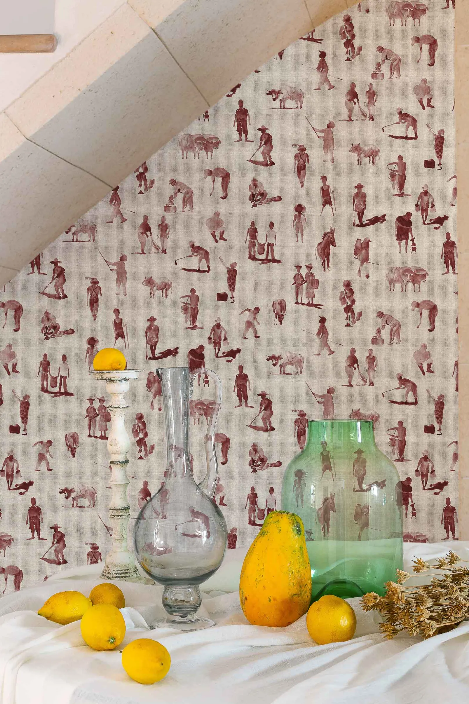 El papel pintado Sineu Wine de Coordonné es un pueblo diseñado en tonos rojo/vino de la colección Mallorca.
