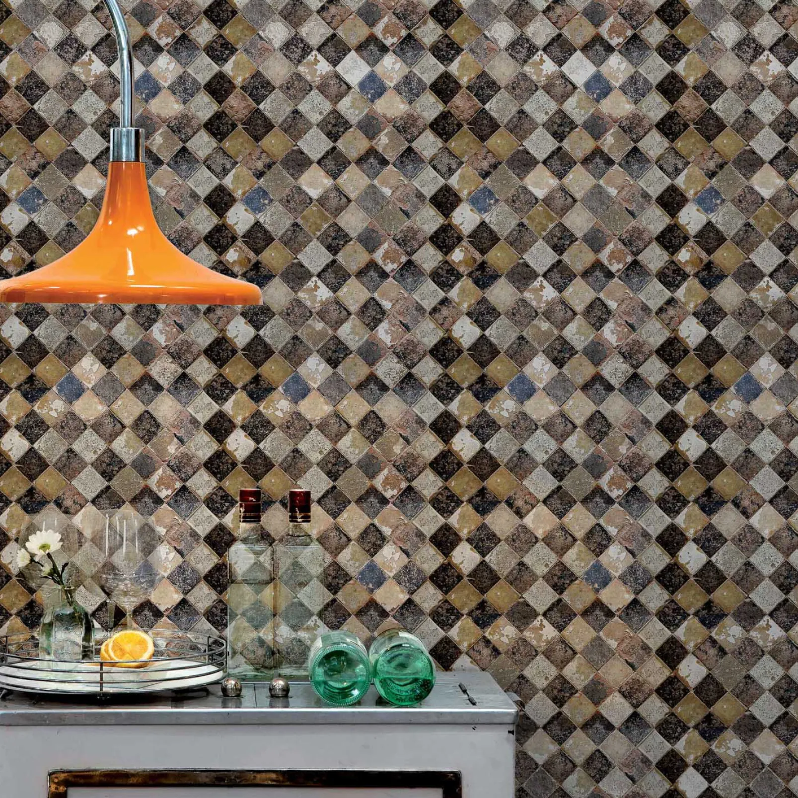 El papel pintado de ajedrez Solera de Coordonné es un diseño geométrico en tonos negros de la colección Tiles.