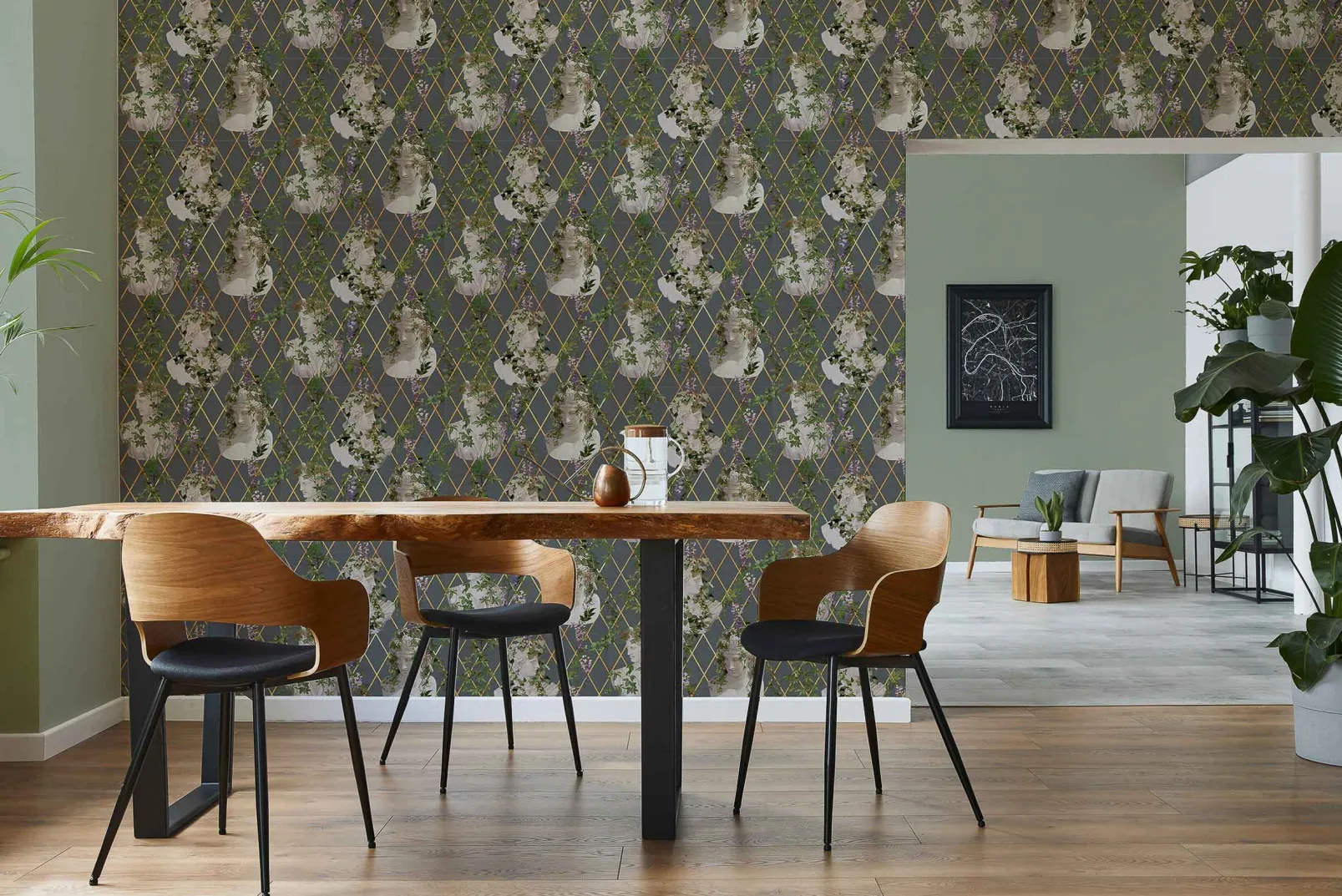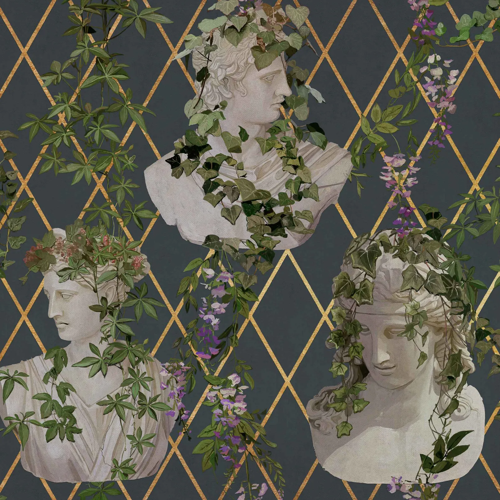 El papel pintado Statues Eclipse de Coordonné es un diseño vegetal en tonos negros de la colección Maximalism.