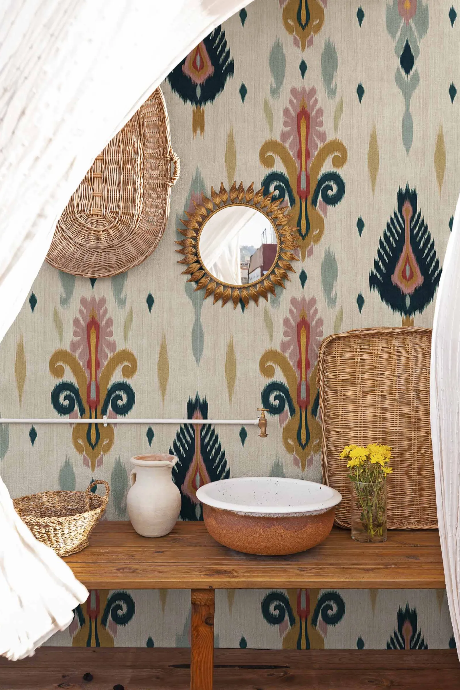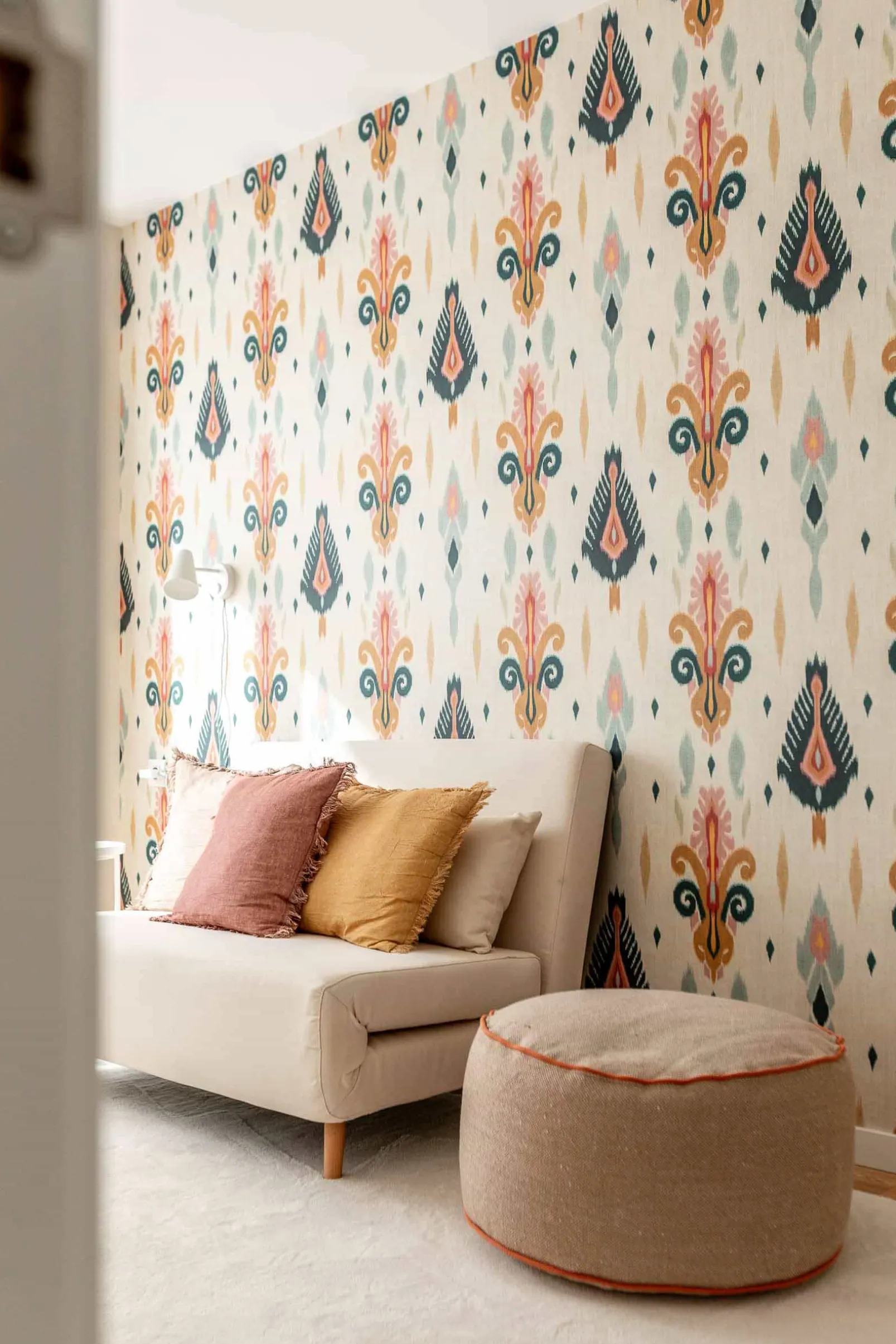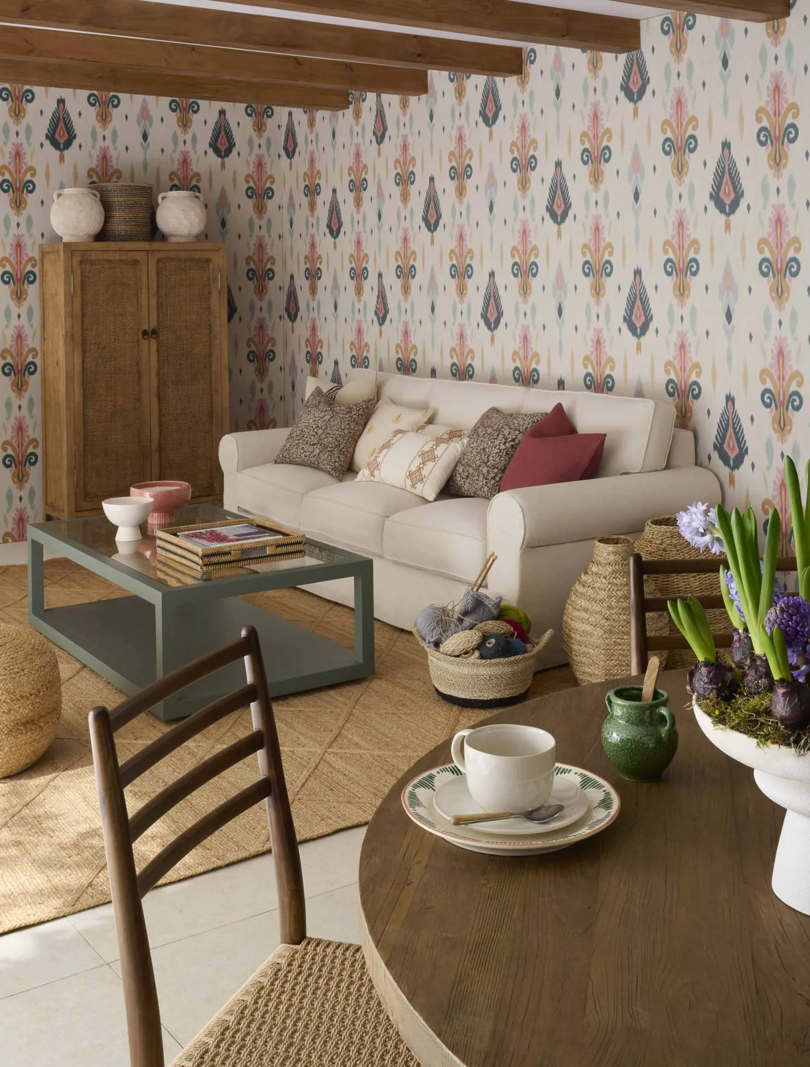El papel pintado Sumba Cream de Coordonné es un diseño floral en tonos beige/nude . Tejedores de la isla de Sumba que se inspiran en los arrecifes de coral de Indonesia.