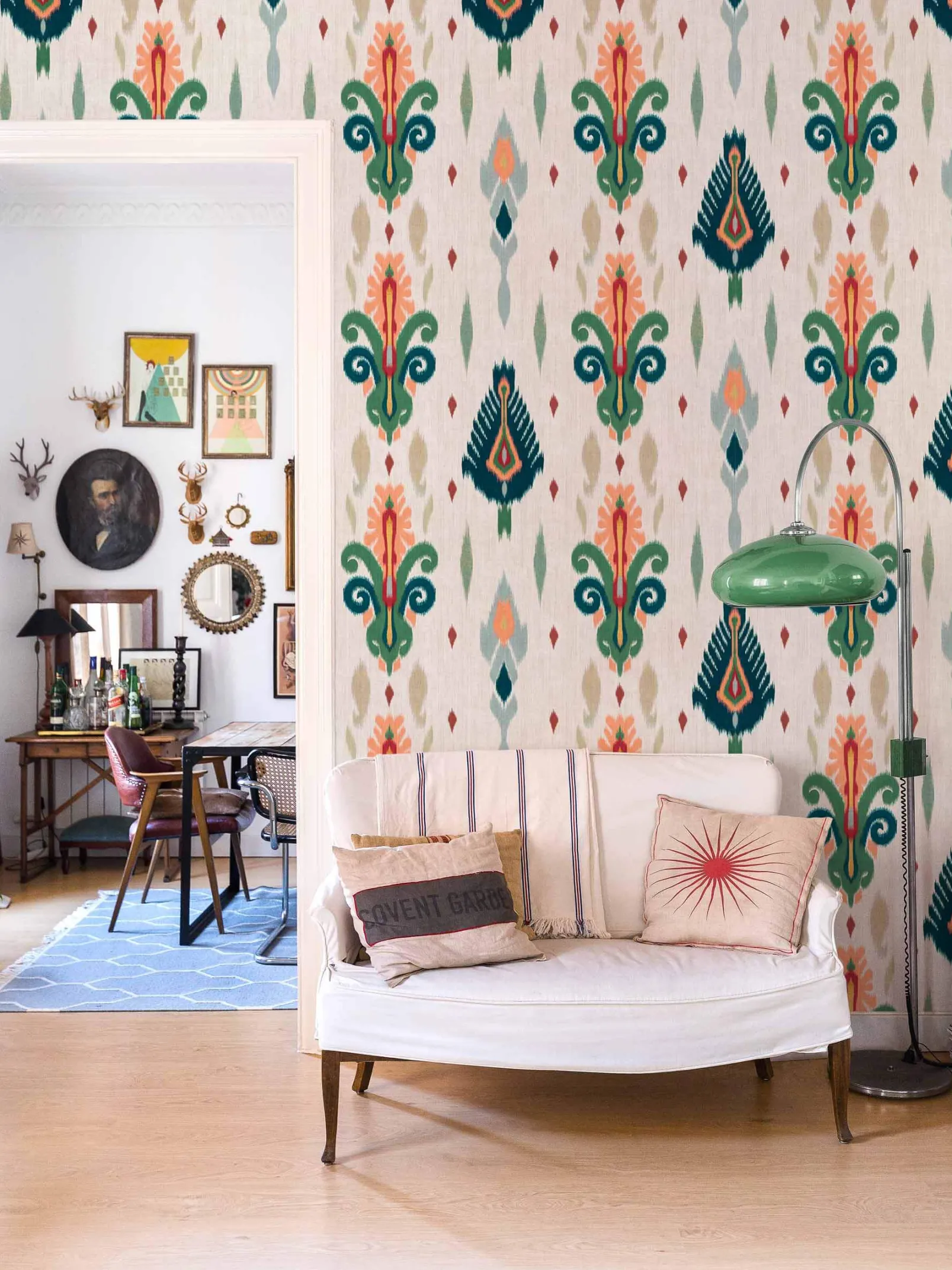 El papel pintado Sumba Green de Coordonné es un diseño floral en tonos verdes. Tejedores de la isla de Sumba que se inspiran en los arrecifes de coral de Indonesia.