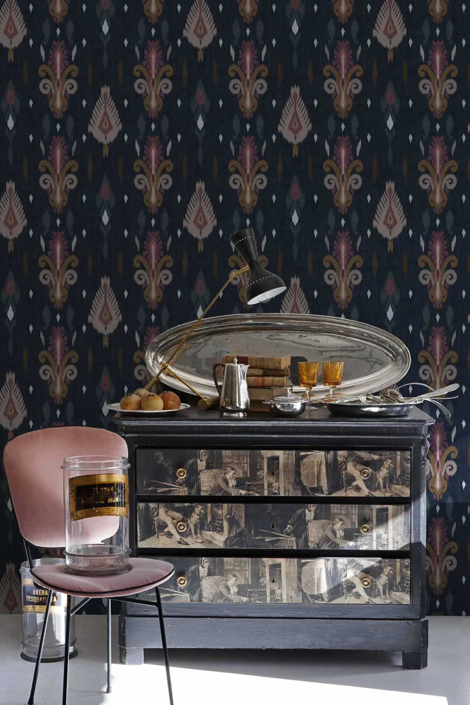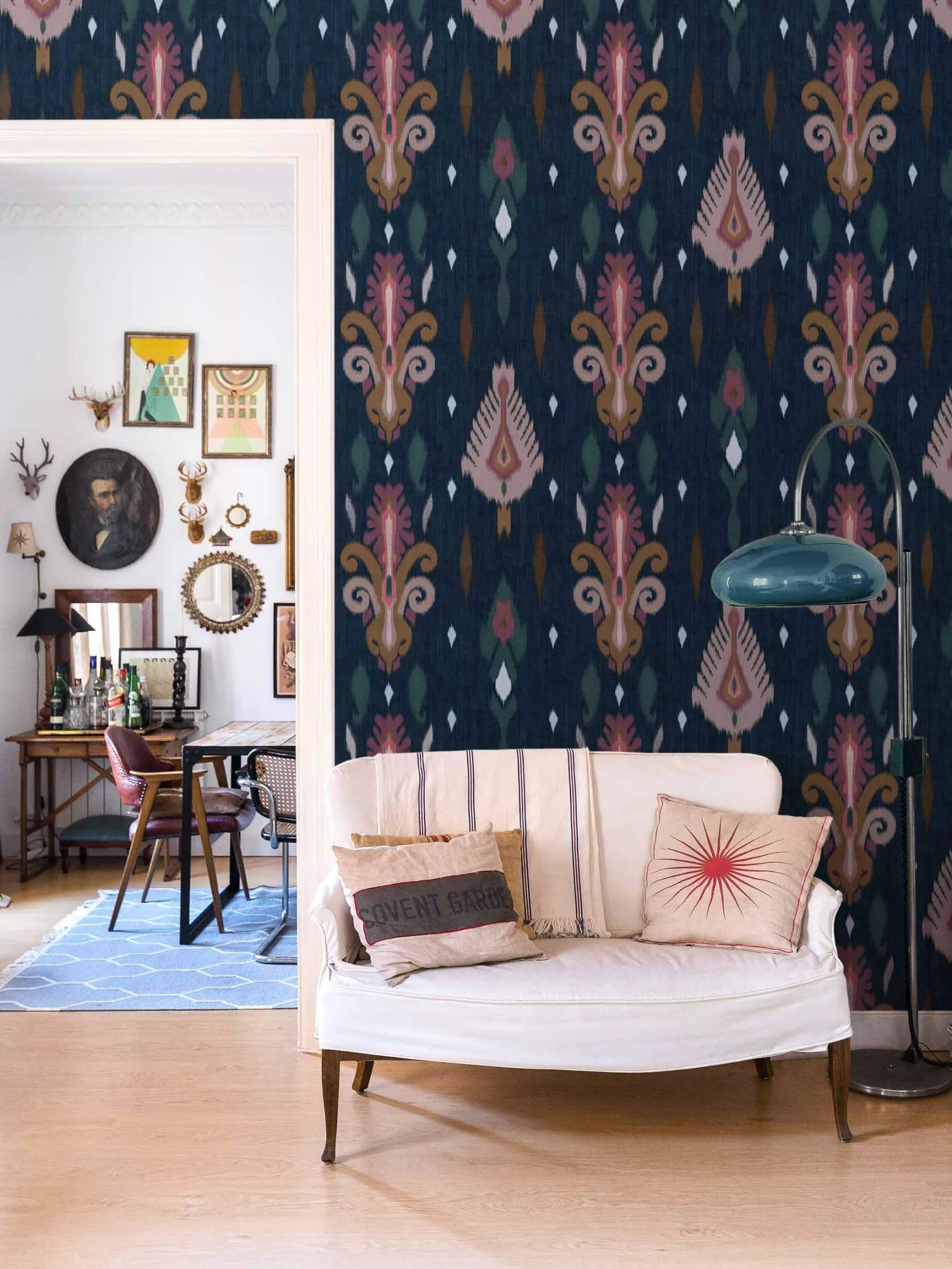 El papel pintado Sumba Navy de Coordonné es un diseño floral en tonos azules y marinos. Tejedores de la isla de Sumba que se inspiran en los arrecifes de coral de Indonesia.