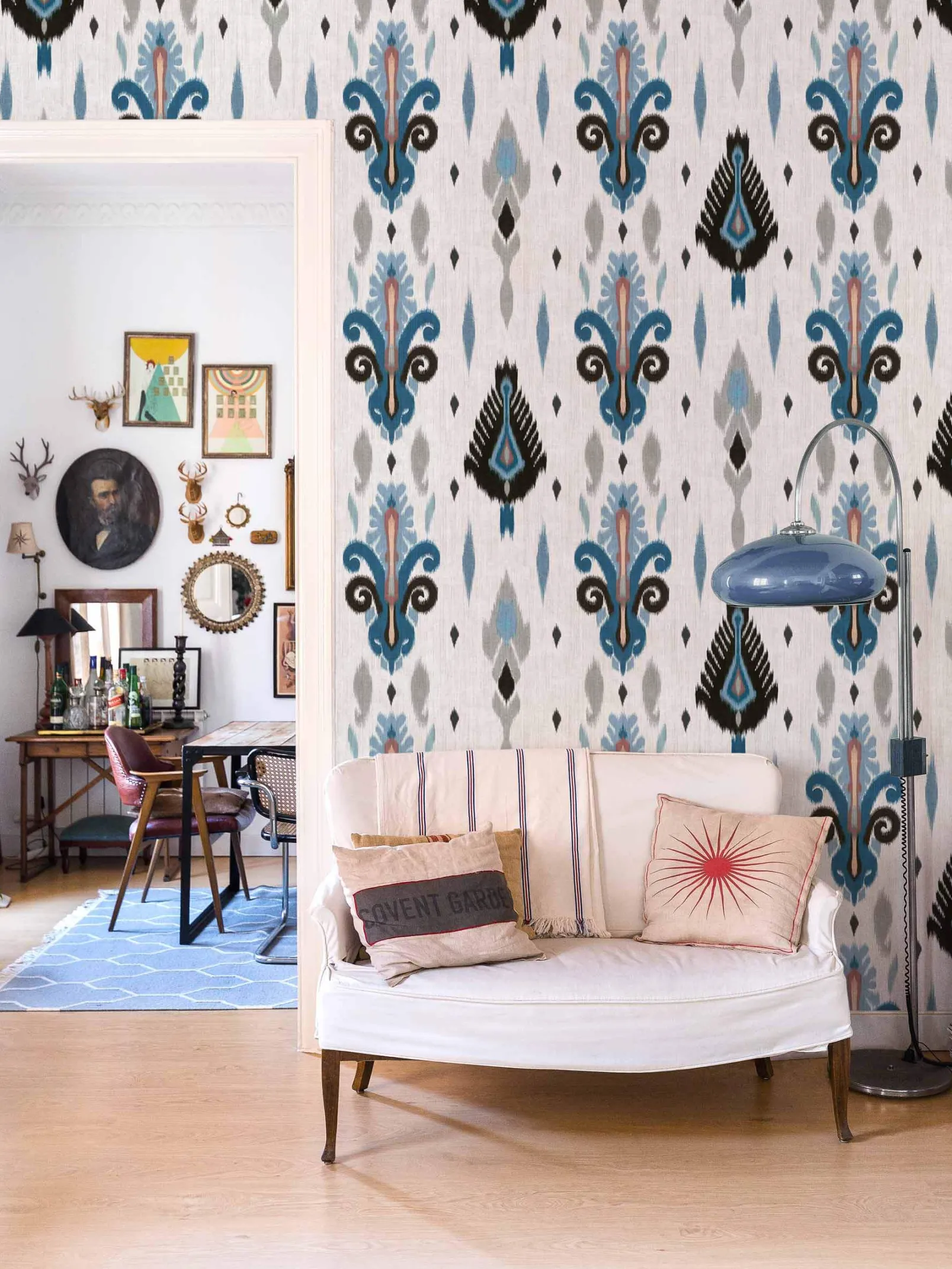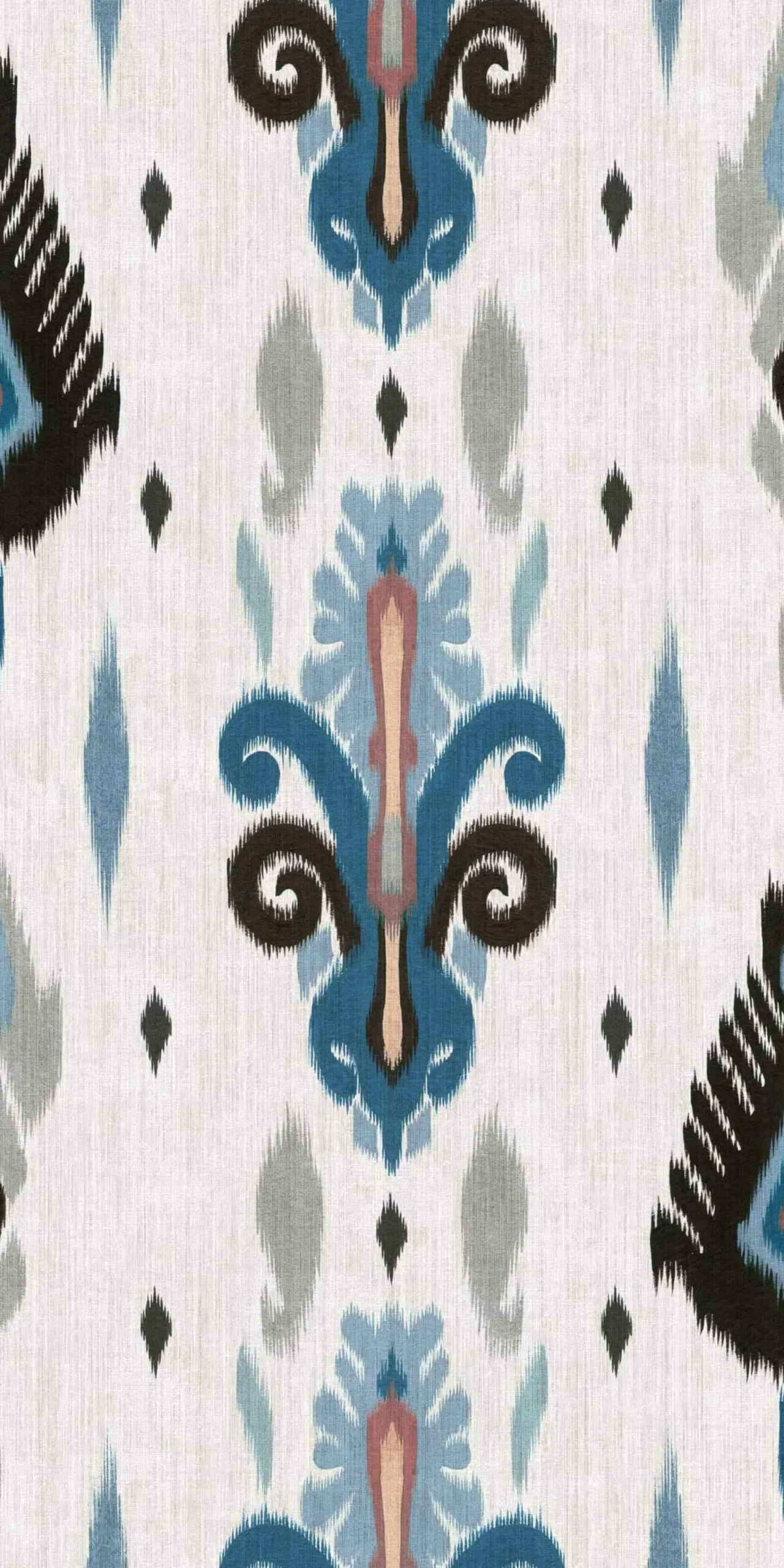 El papel pintado Sumba White de Coordonné es un diseño floral en tonos azules/azules marinos. Tejedores de la isla de Sumba que se inspiran en los arrecifes de coral de Indonesia.
