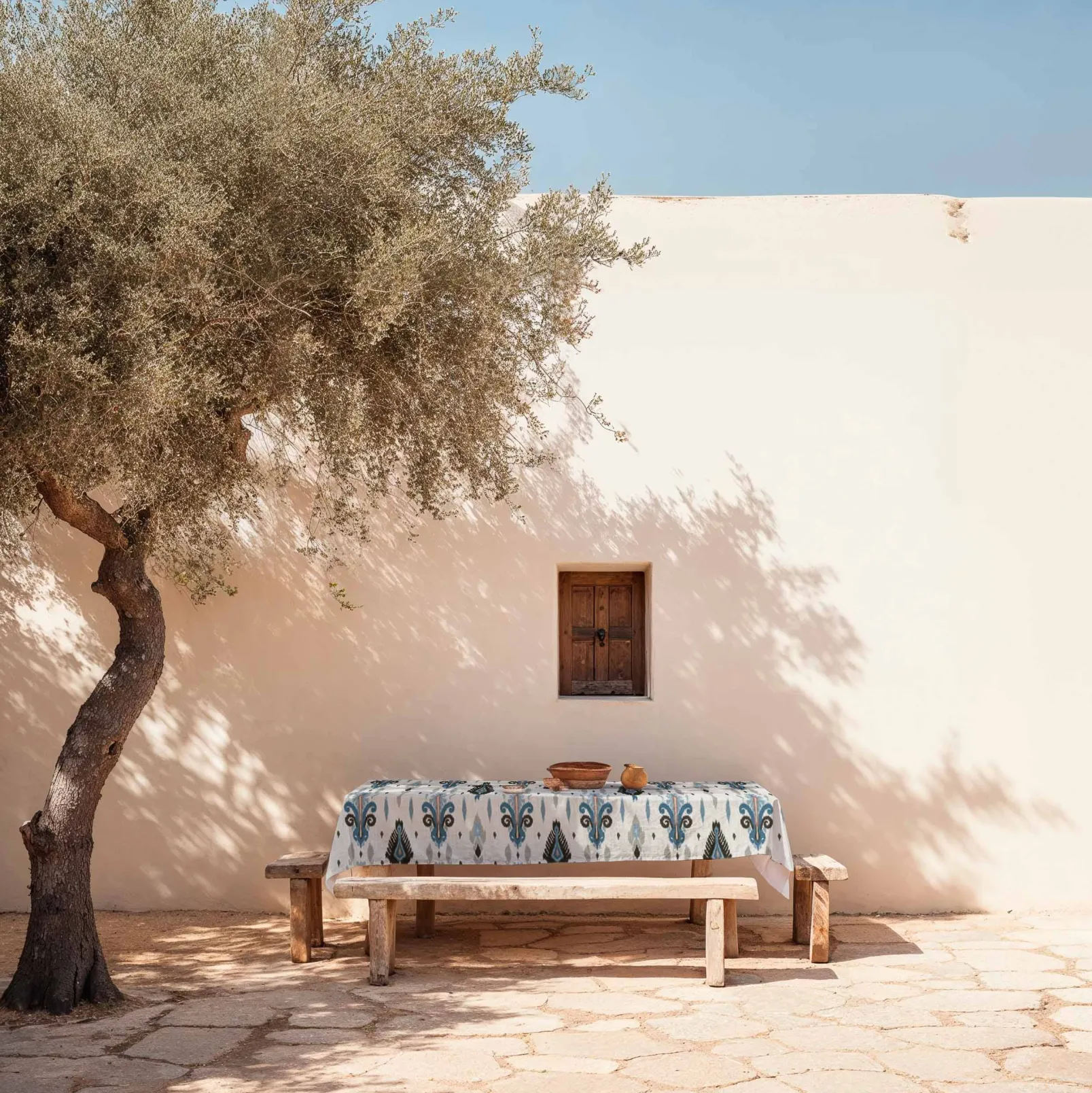 Sumba White de Coordonné es un diseño inspirado en texturas en azul/azul marino de la colección Ikart Outdoor II. Tejedores de la isla de Sumba que se inspiran en los arrecifes de coral de Indonesia.