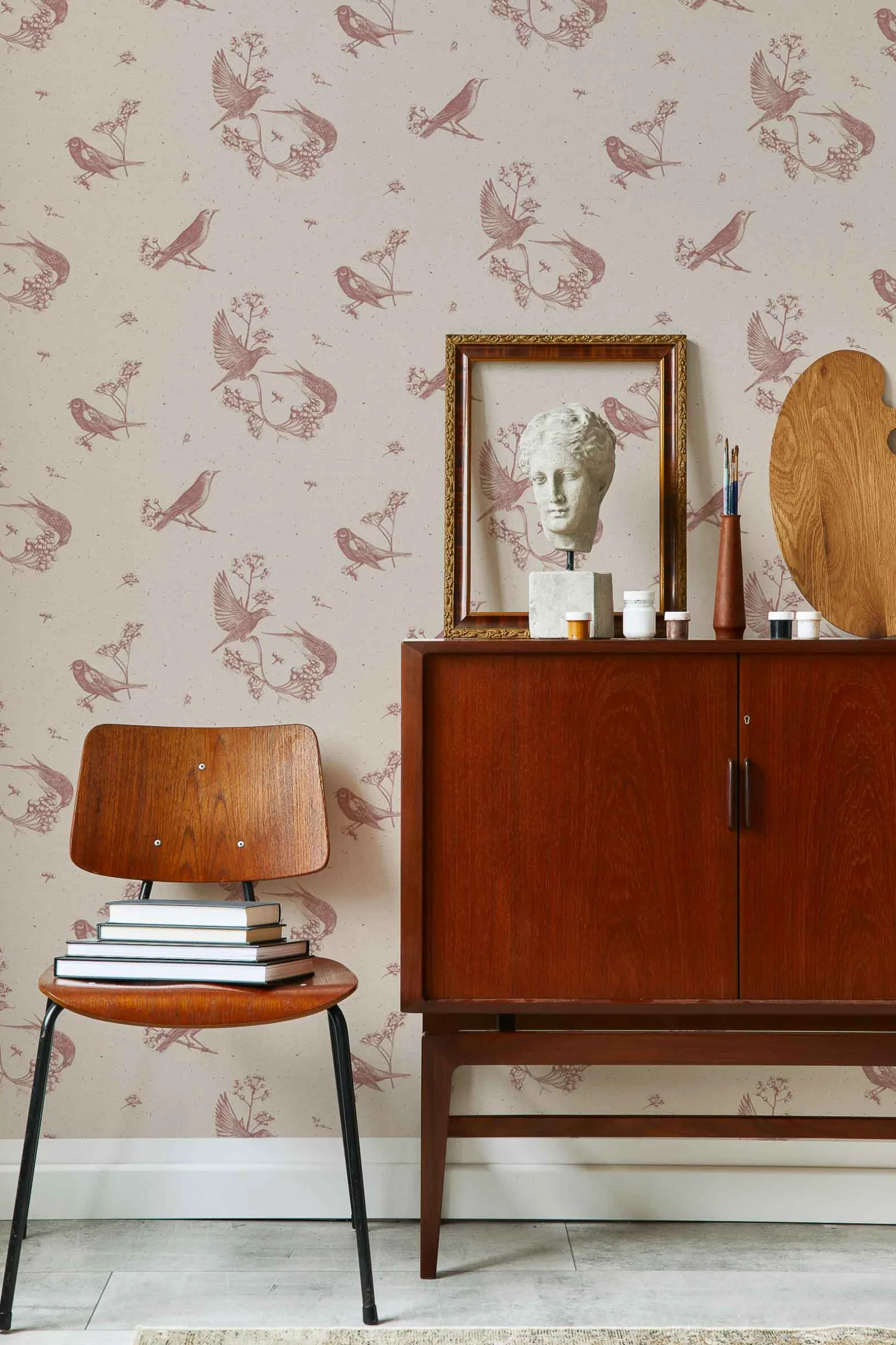 Papel pintado Sweet Birds Rose de Coordonné en un animal diseñado en tonos rosa/lila de la colección Naturae.