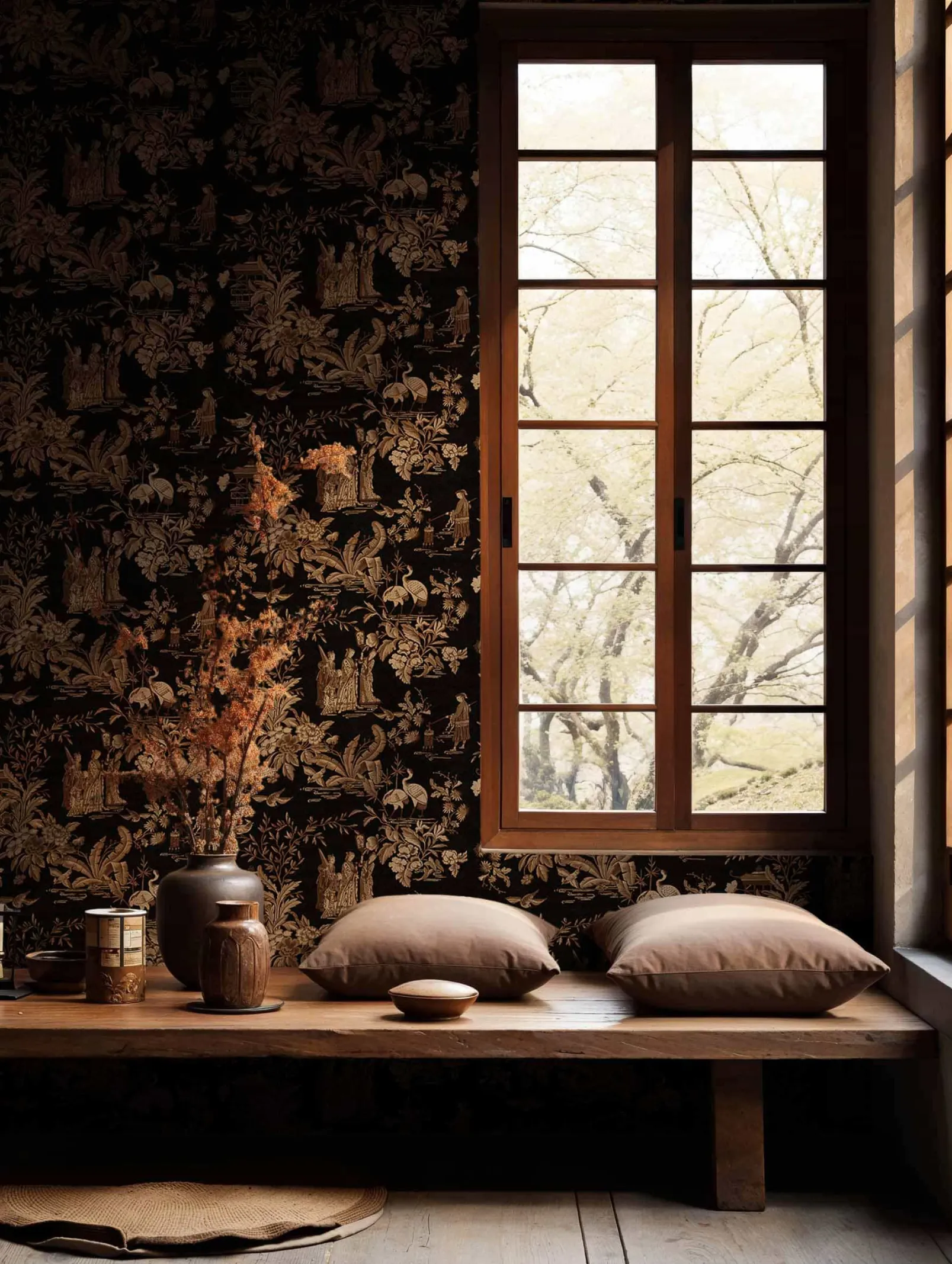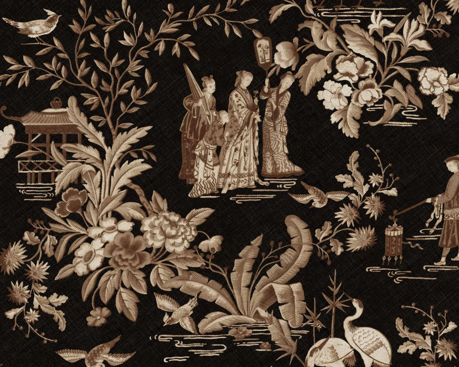 Tang Walk Onyx de Coordonné es un papel pintado negro. Damas de la Corte vestidas de paseo primaveral.