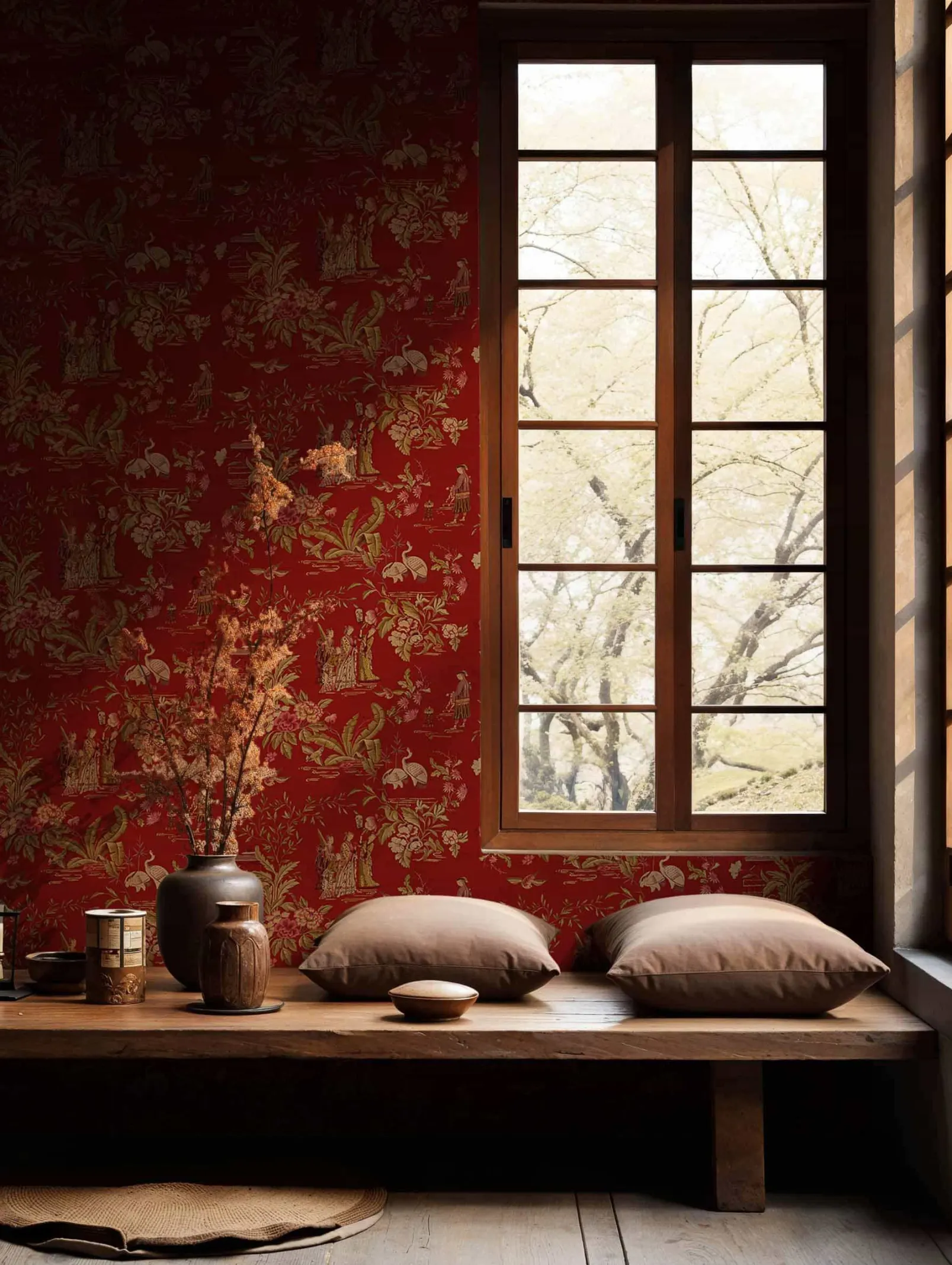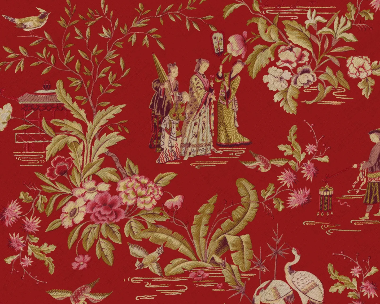 Tang Walk Ruby de Coordonné es un papel pintado rojo/vino. Damas de la Corte vestidas para un paseo primaveral.