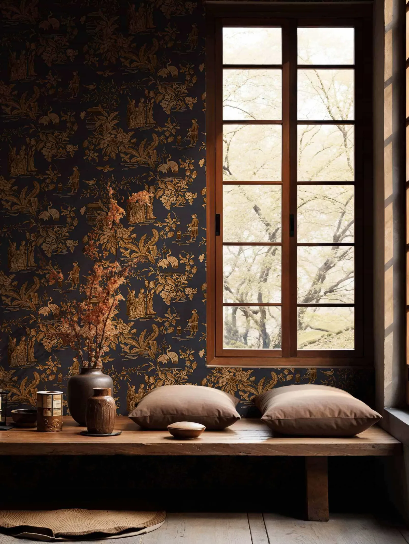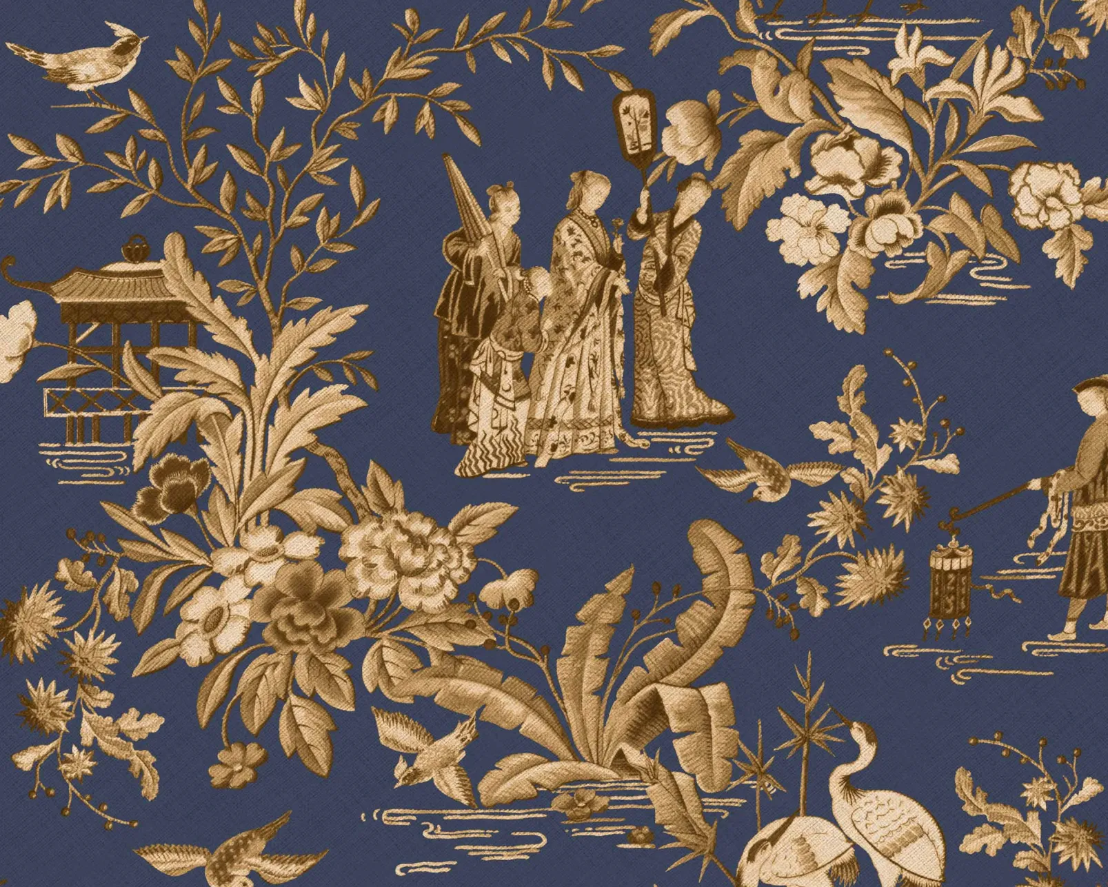 El Tang Walk Sapphire de Coordonné es un papel pintado azul/azul marino. Damas de la Corte vestidas para un paseo primaveral.
