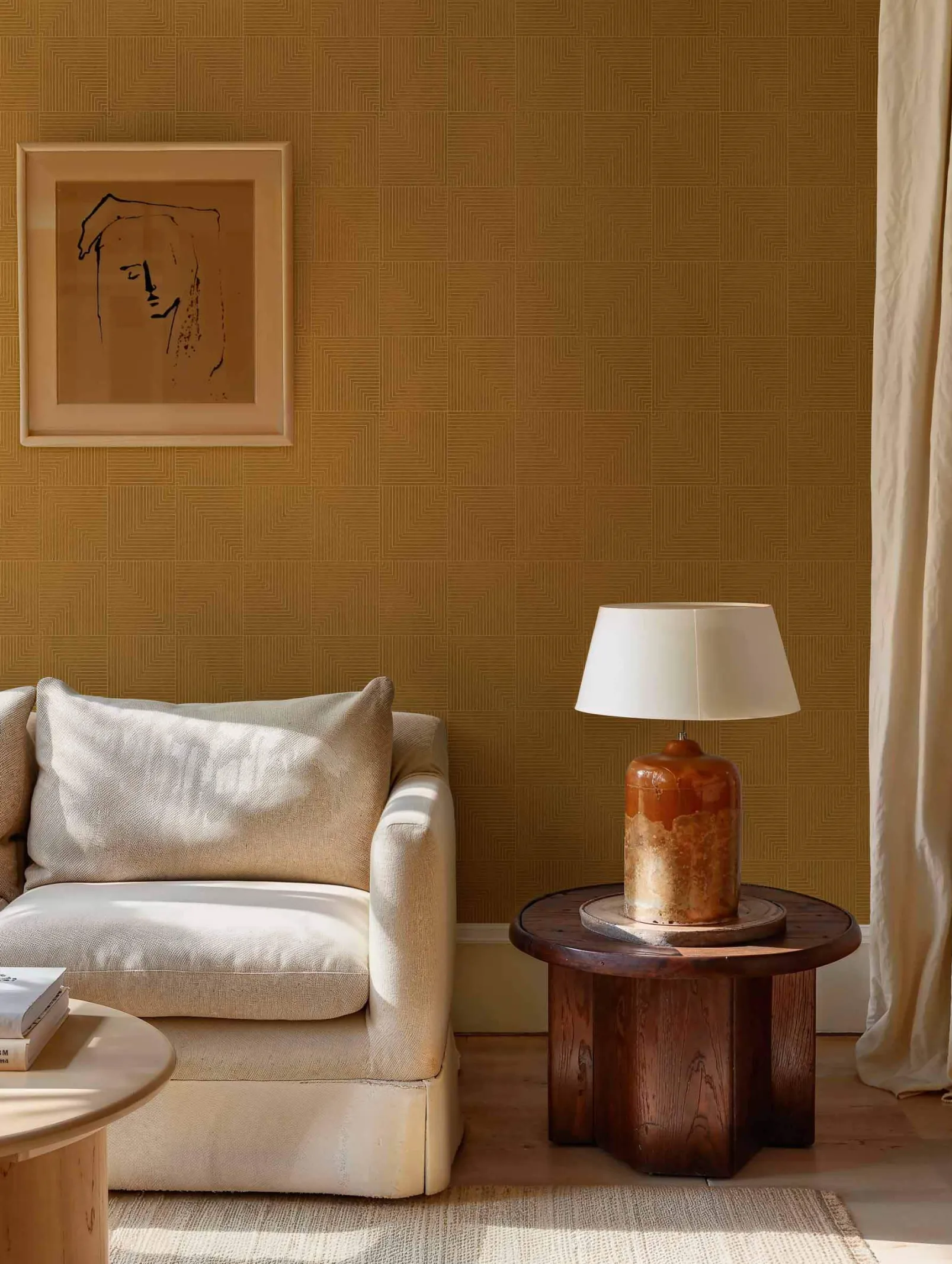 Tetragonal Curry de Coordonne es un papel pintado de inspiración geométrica en tonos amarillo/naranja de la colección Lattice Geometrics. Prismas rectangulares perfectos.