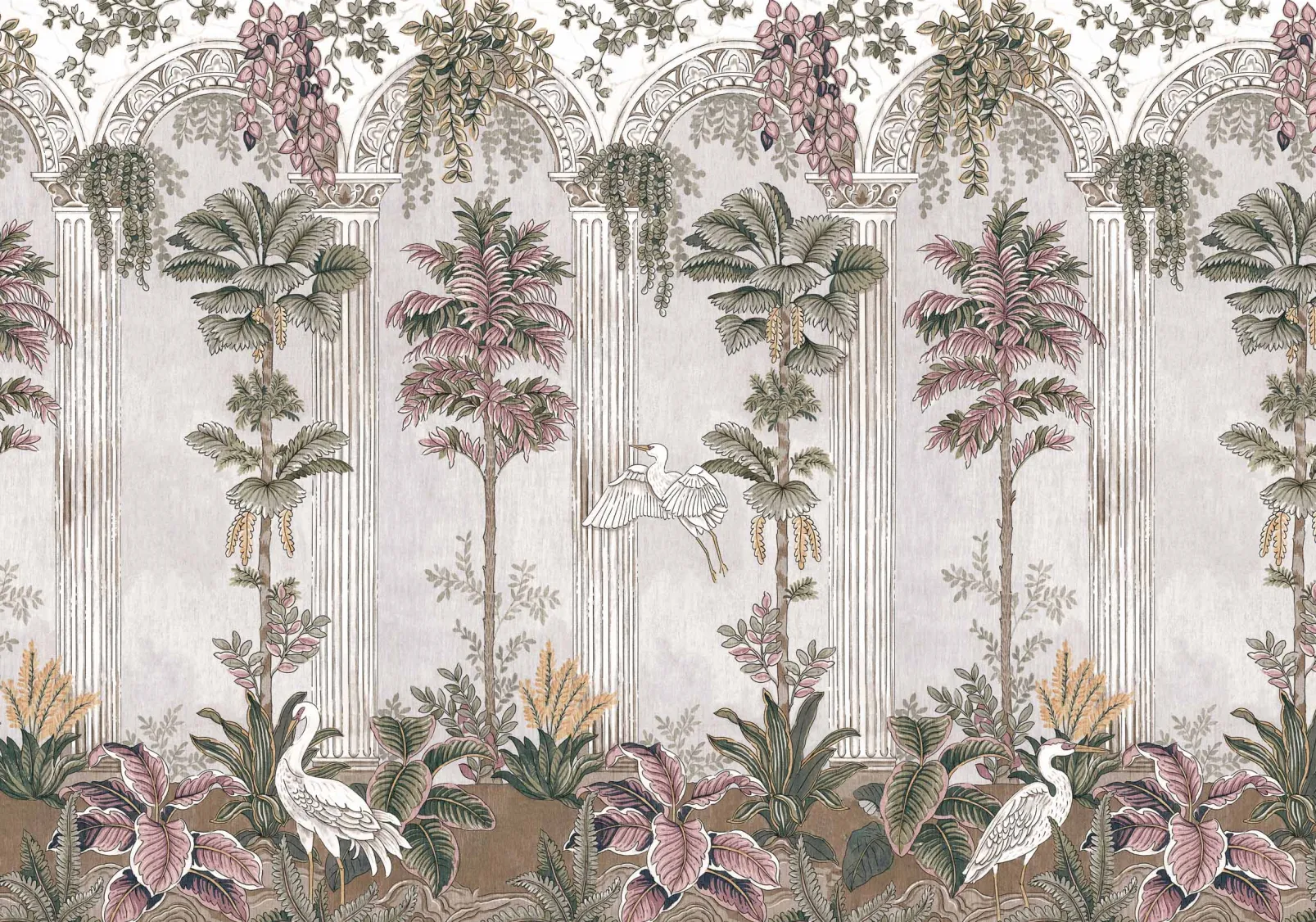 Thermae Autumn de Coordonné es un diseño de Paisajes en rosa/lila de la colección Pompei. Ambiente de termas rodeadas de columnas y frescos con escenas mitológicas.