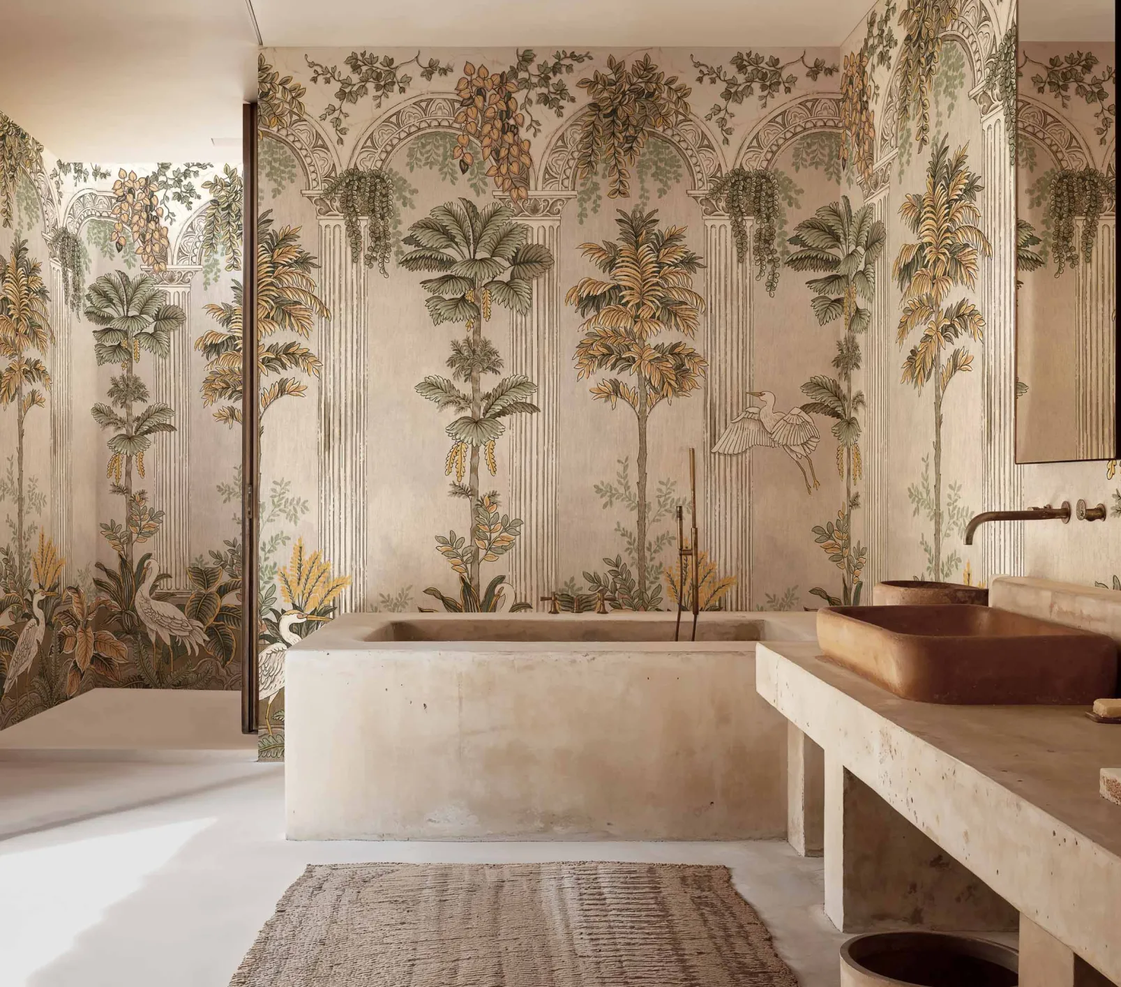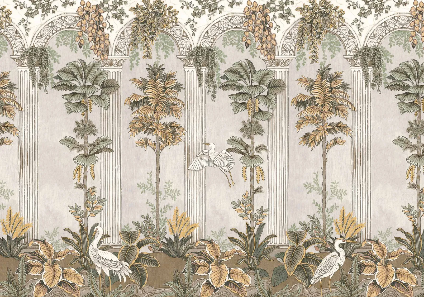 Thermae Summer de Coordonné es un diseño de Paisajes en amarillo/naranja de la colección Pompei. Ambiente de termas rodeadas de columnas y frescos con escenas mitológicas.