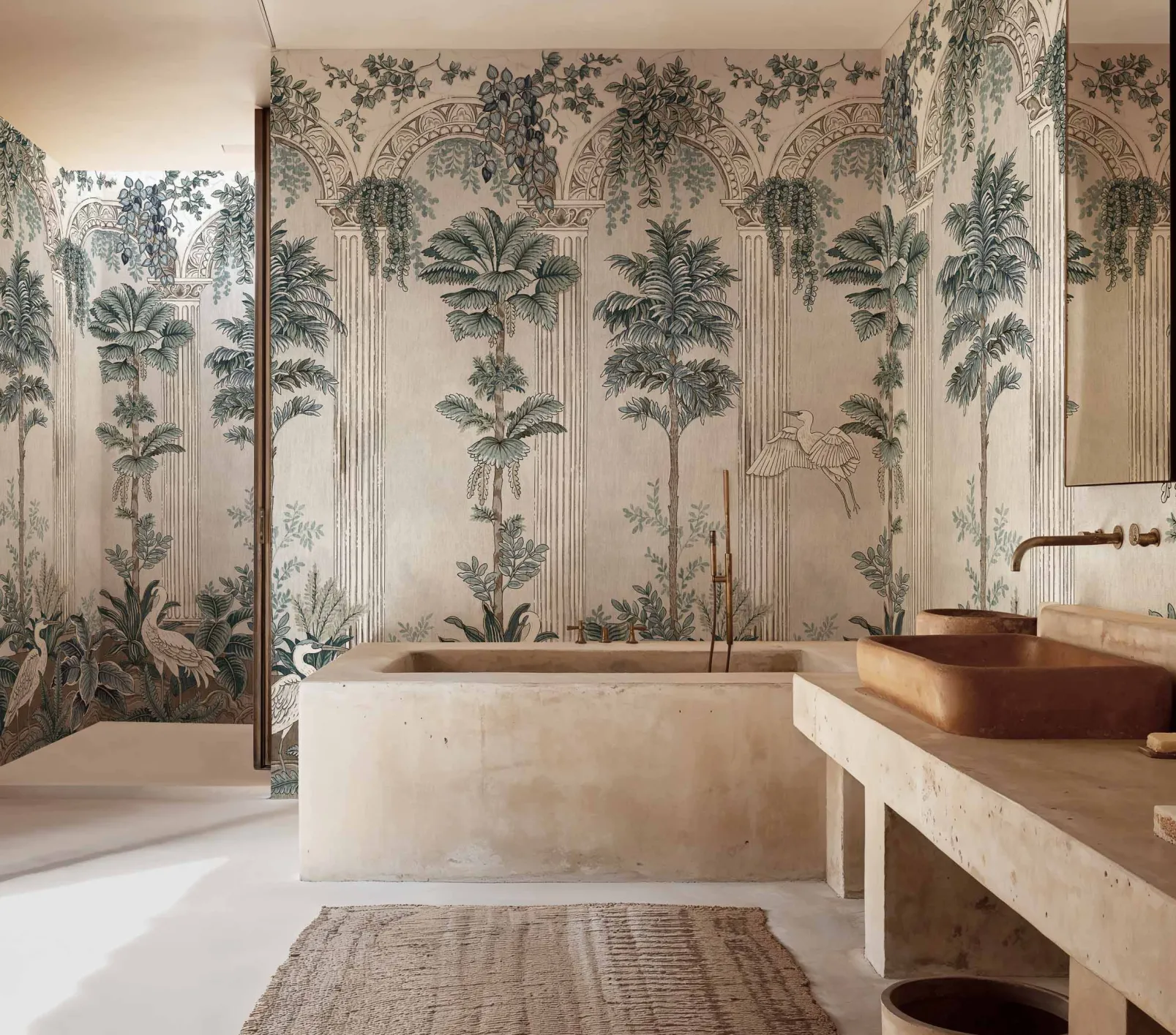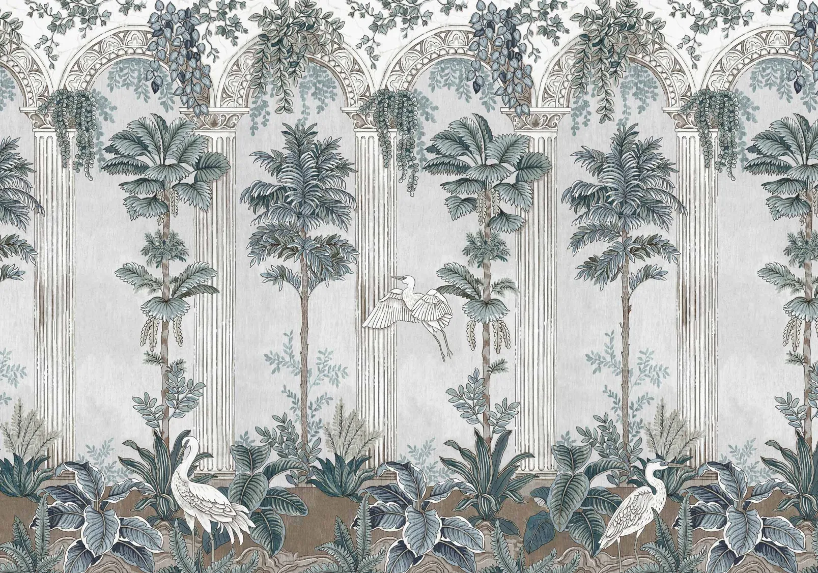 Thermae Winter de Coordonné es un diseño de Paisajes en azul/azul marino de la colección Pompei. Ambiente de termas rodeadas de columnas y frescos con escenas mitológicas.
