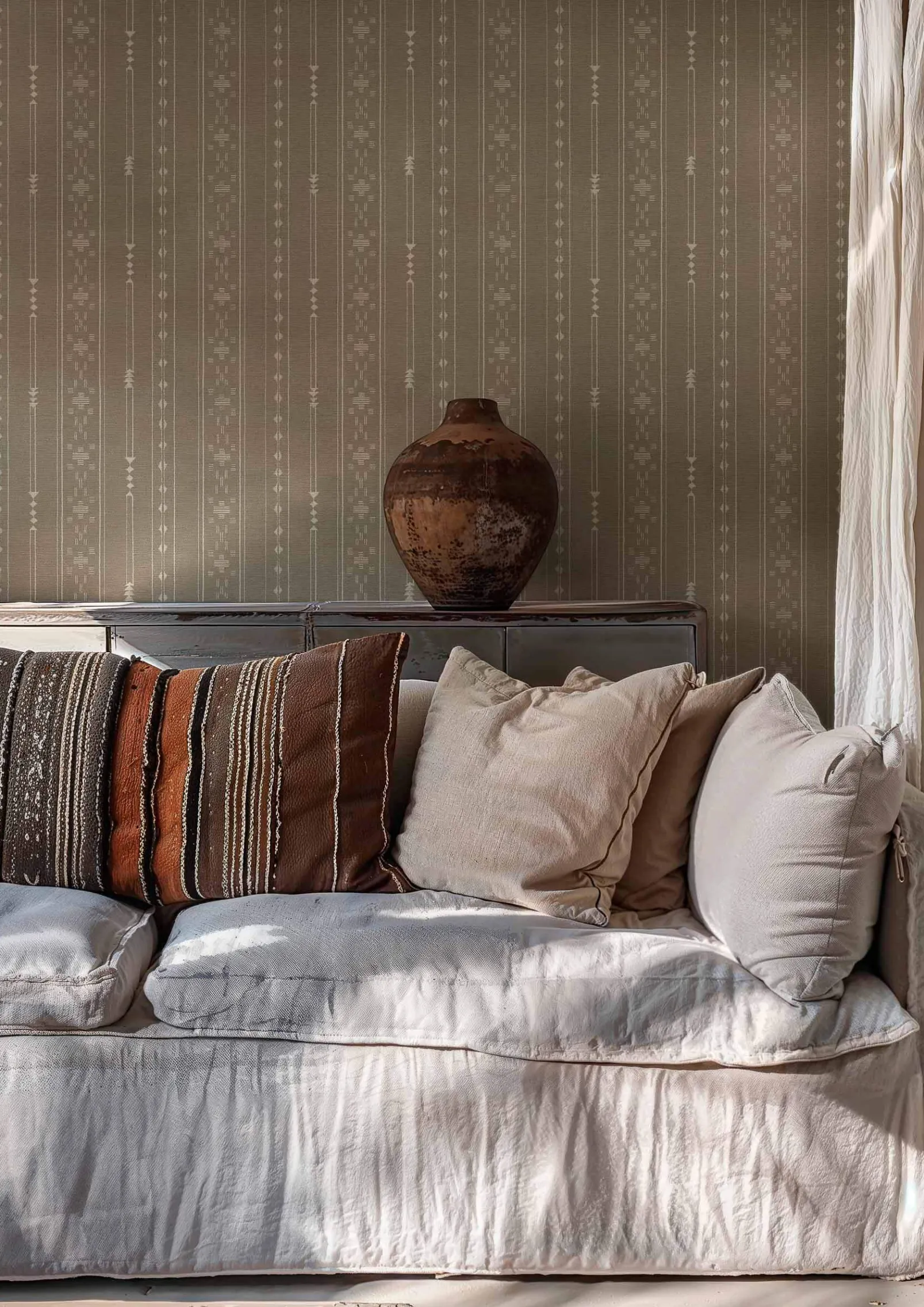 Tifinagh Script Mole de Coordonne es un papel pintado inspirado en la textura en tonos Beige/Nude de la colección Bereber. Interpretación abstracta de uno de los alfabetos más antiguos que aún existen, el bereber.