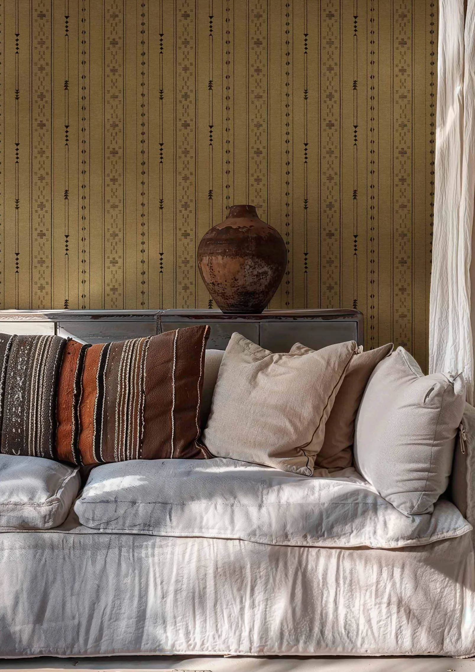 Tifinagh Script Sienna de Coordonne es un papel pintado inspirado en la textura en tonos amarillo/naranja de la colección Bereber. Interpretación abstracta de uno de los alfabetos más antiguos que aún existen, el bereber.
