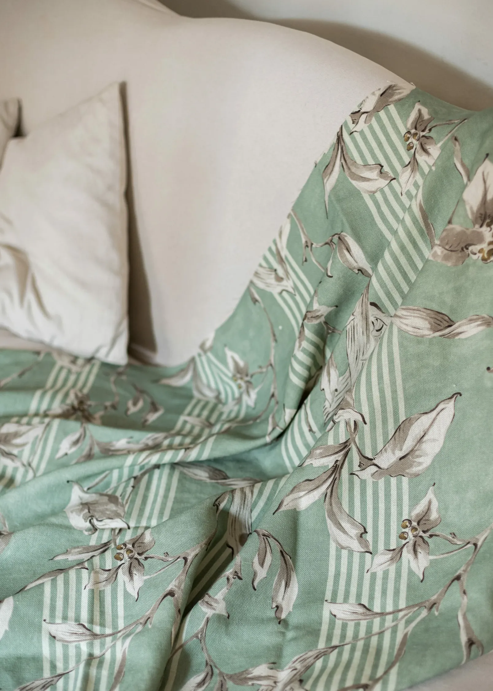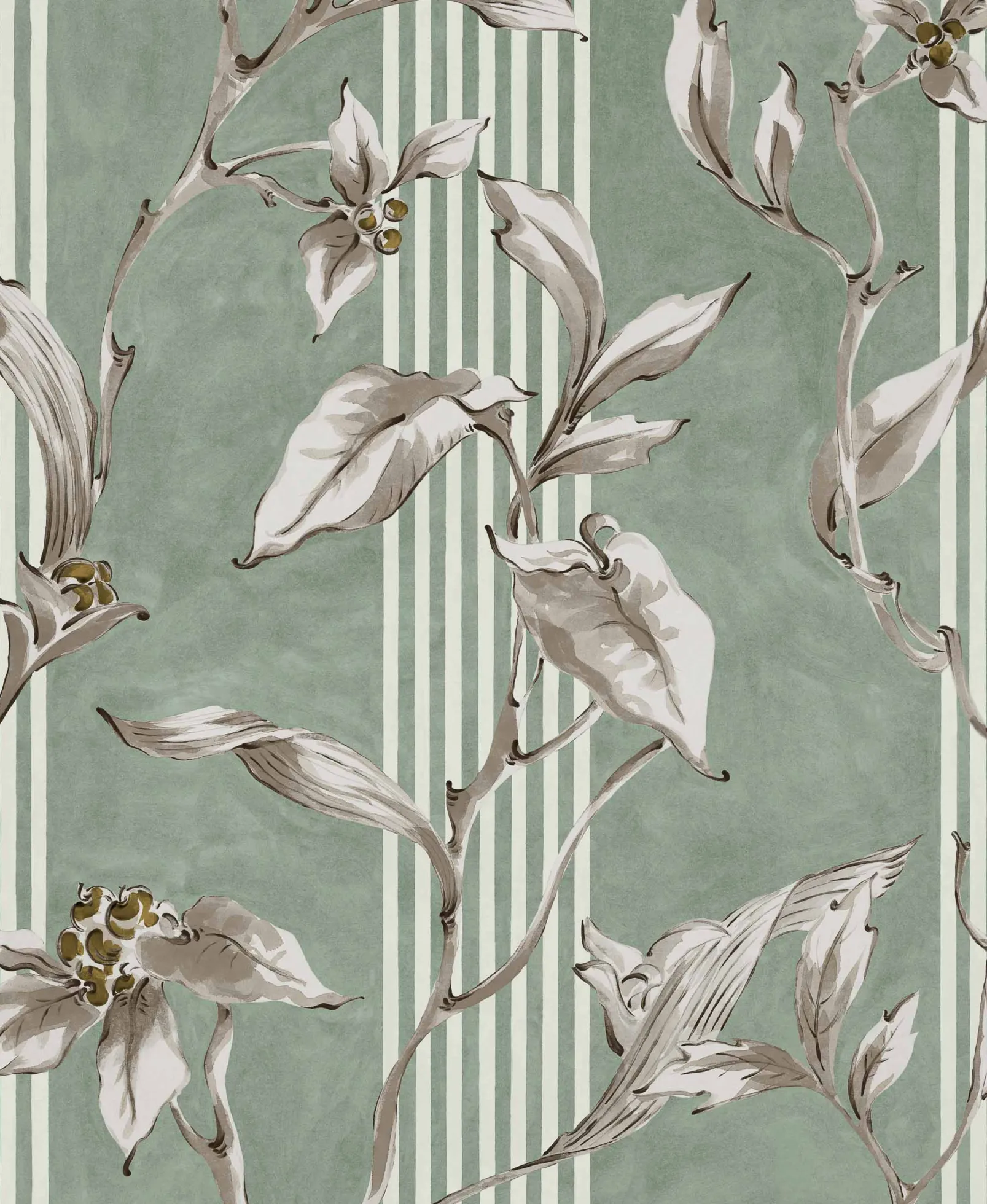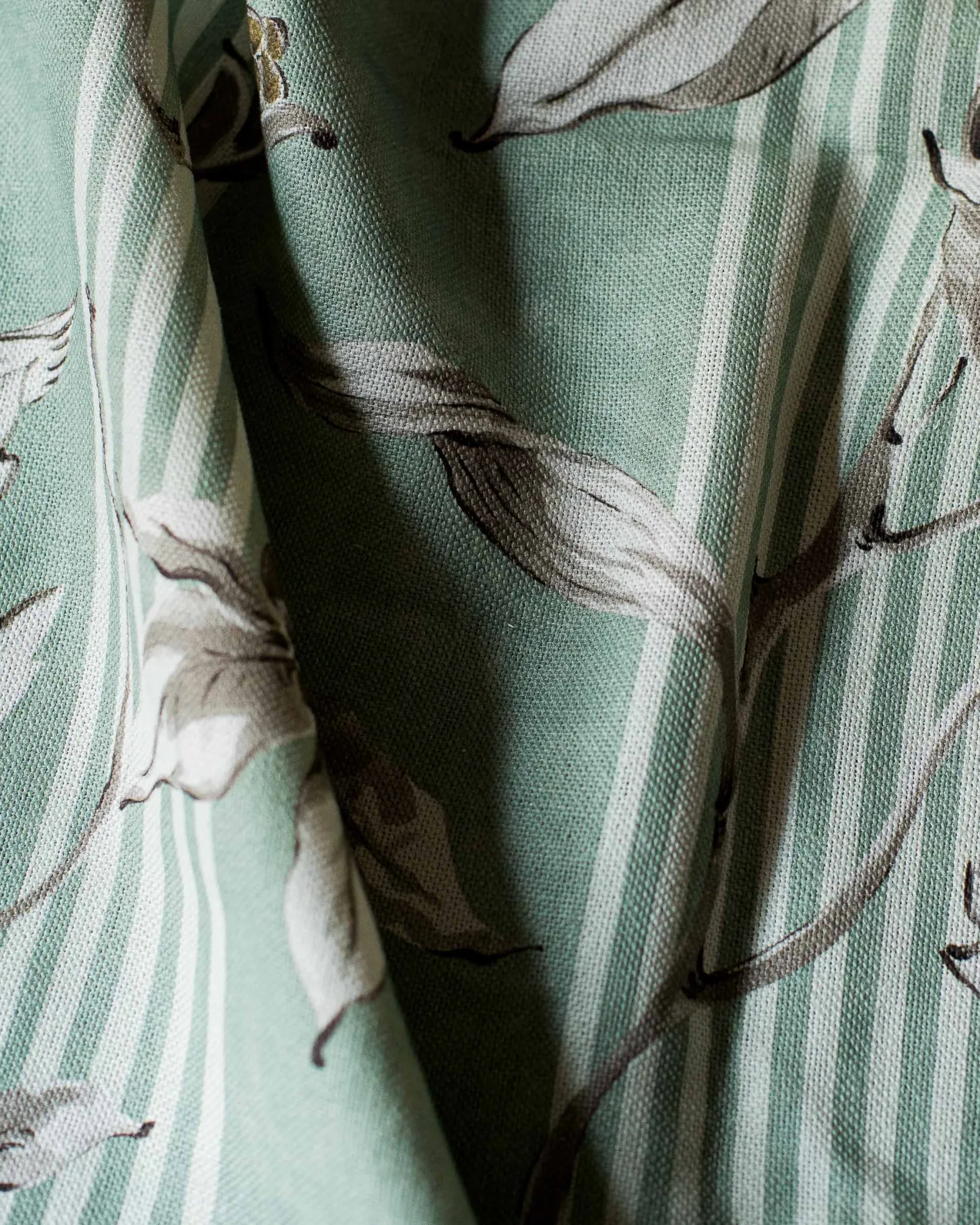 La tela Trepadora Sage de Coordonné es un diseño de inspiración vegetal en turquesa/blanco de la colección Palacio de Cristal Fabrics.