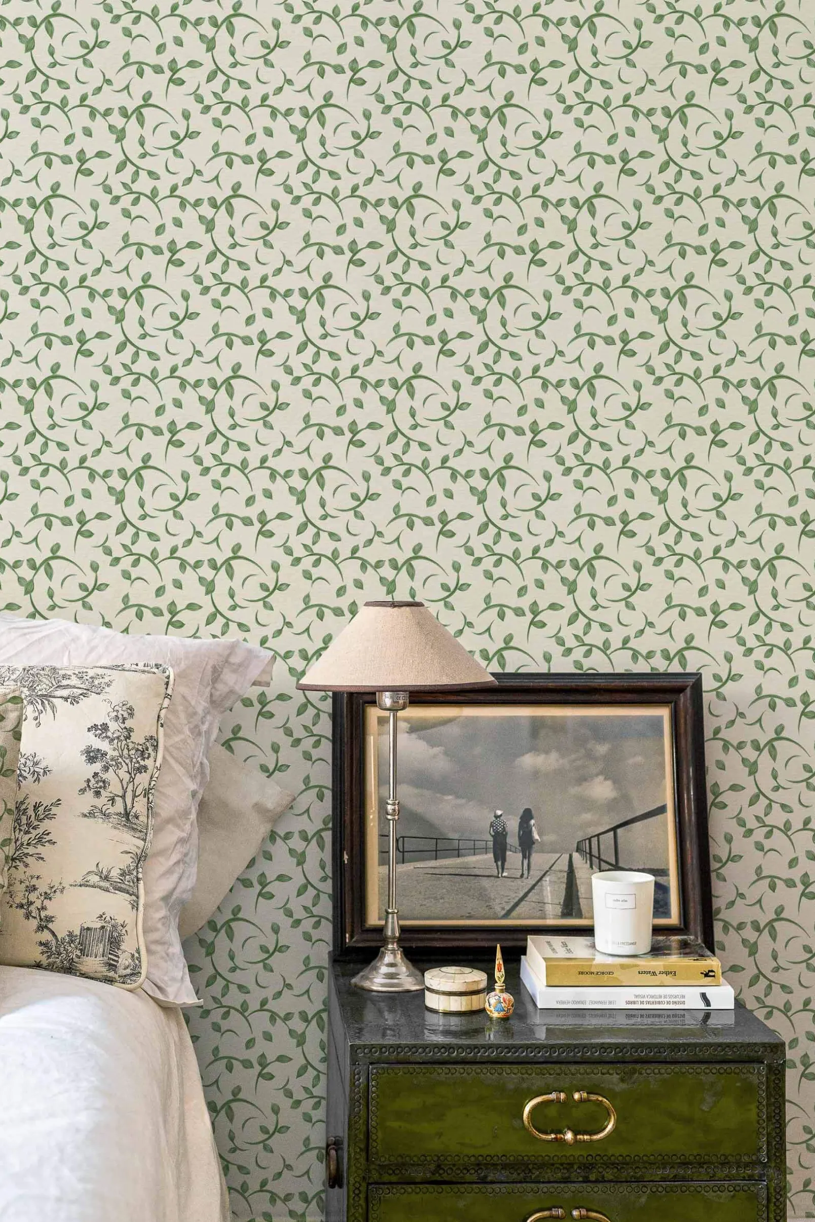 Twig Green de Coordonné es un papel pintado de inspiración vegetal en color verde. Juguetonas ramitas que bailan al son del viento.