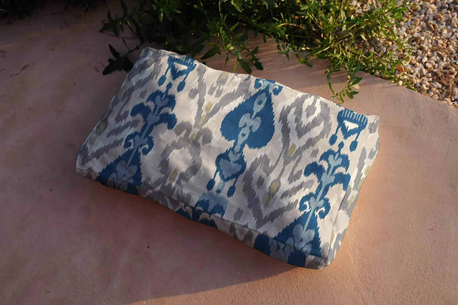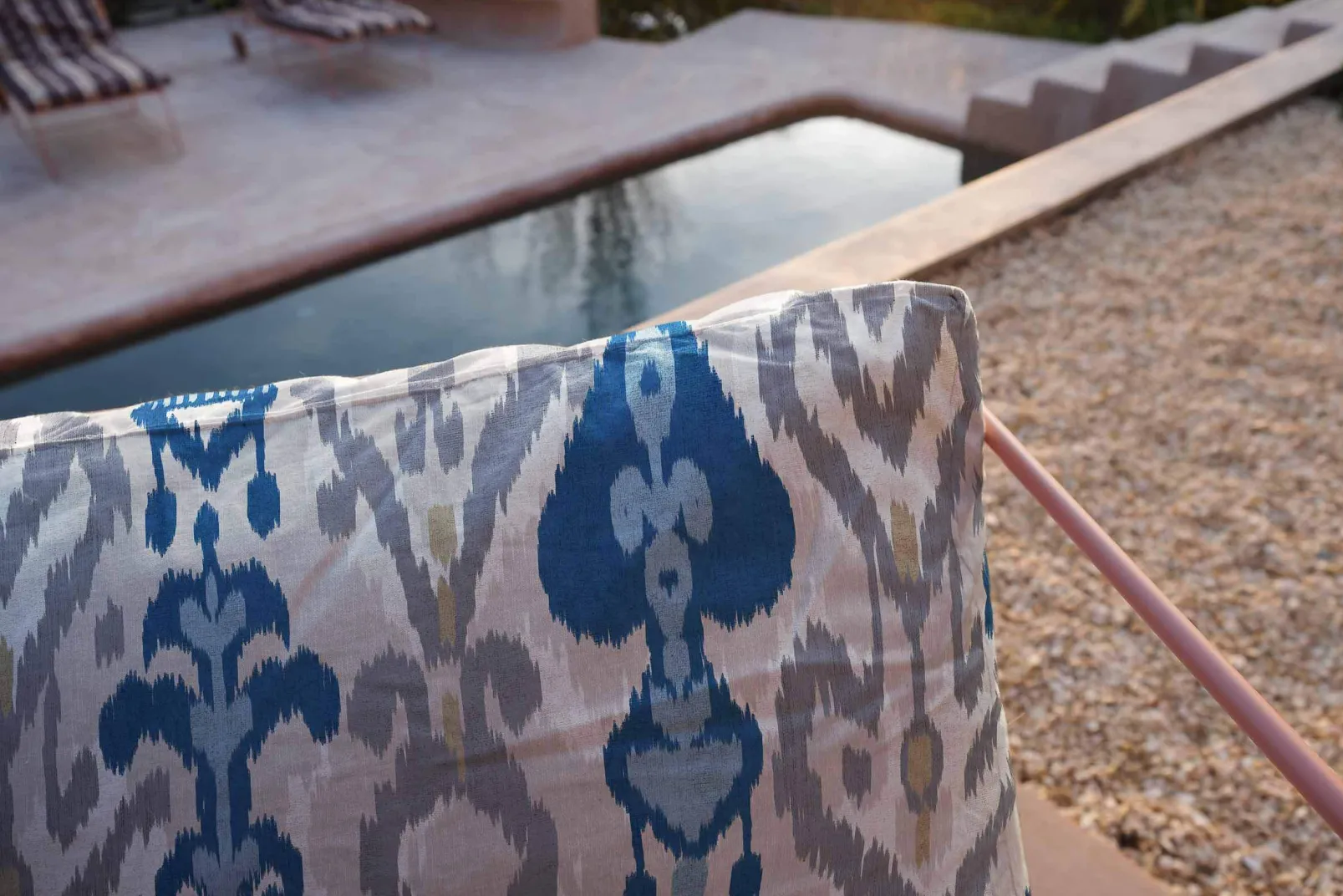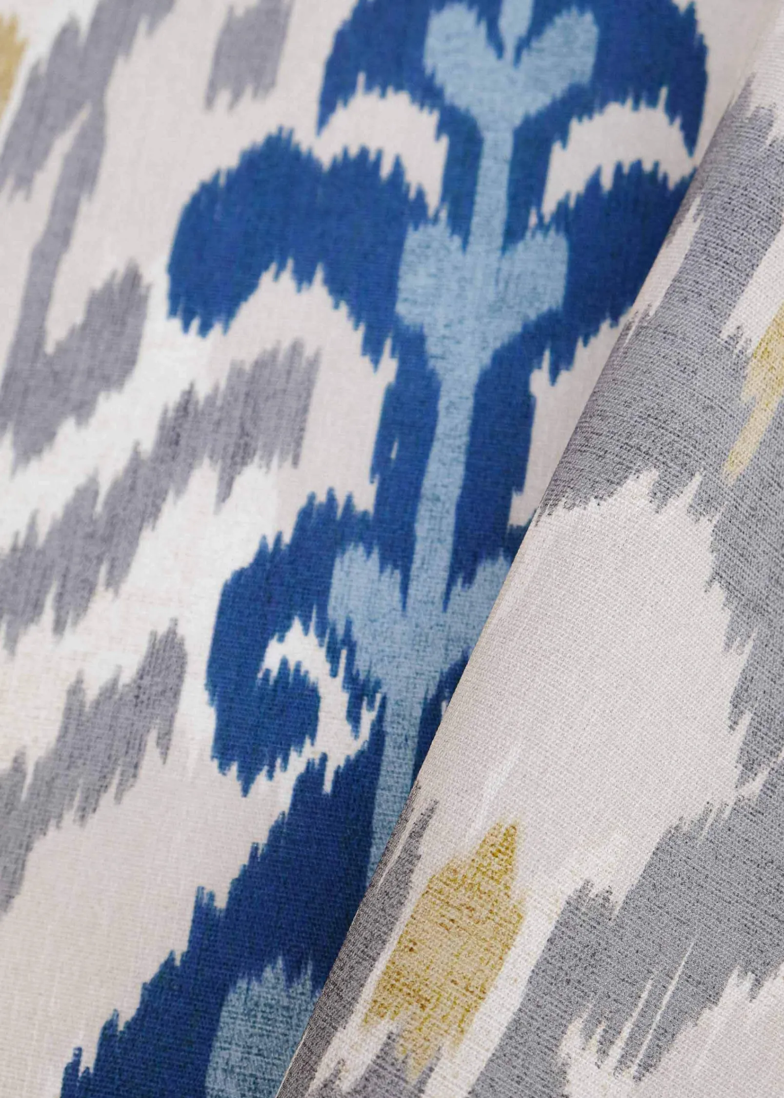 El Uzbek Cream de Coordonné es un diseño inspirado en las texturas en azul/azul marino de la colección Ikart Outdoor II. El legado textil de la ruta de la seda en la confección de elegantes caftanes.