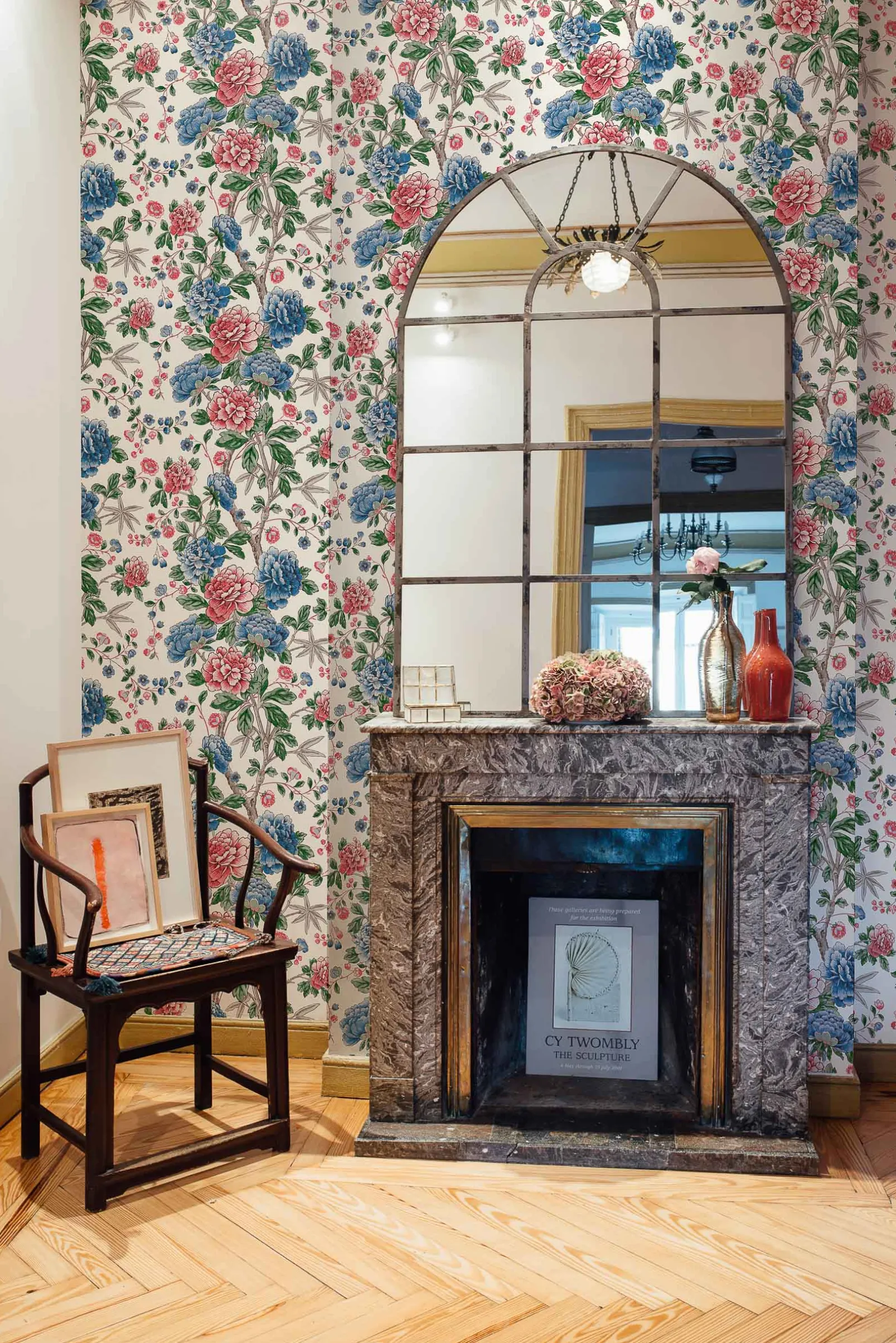 El papel pintado Valentina Spring de Coordonné es un diseño floral en tonos azul/marino de la colección Tempo.