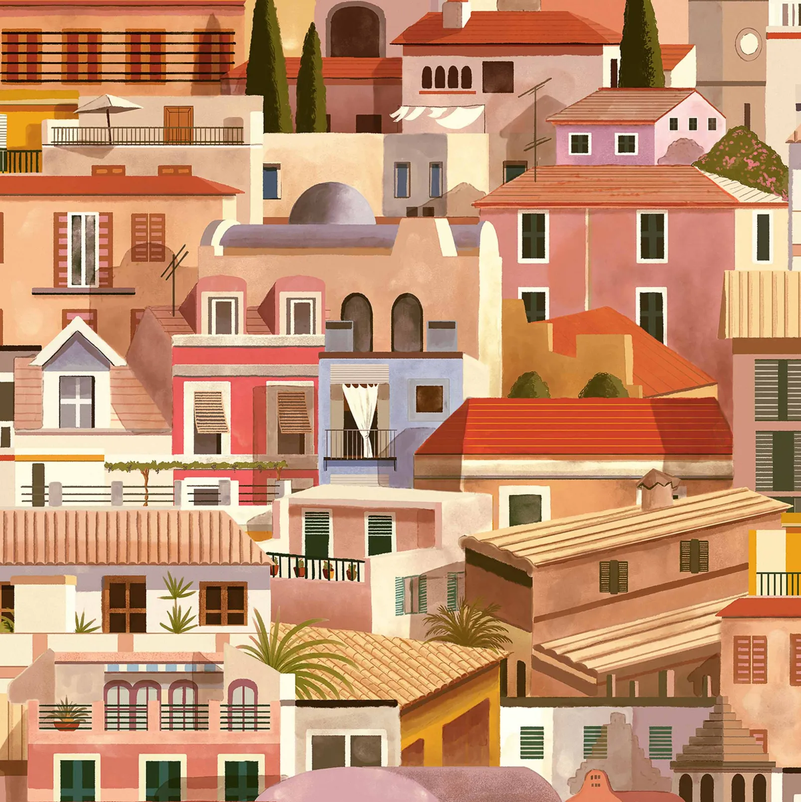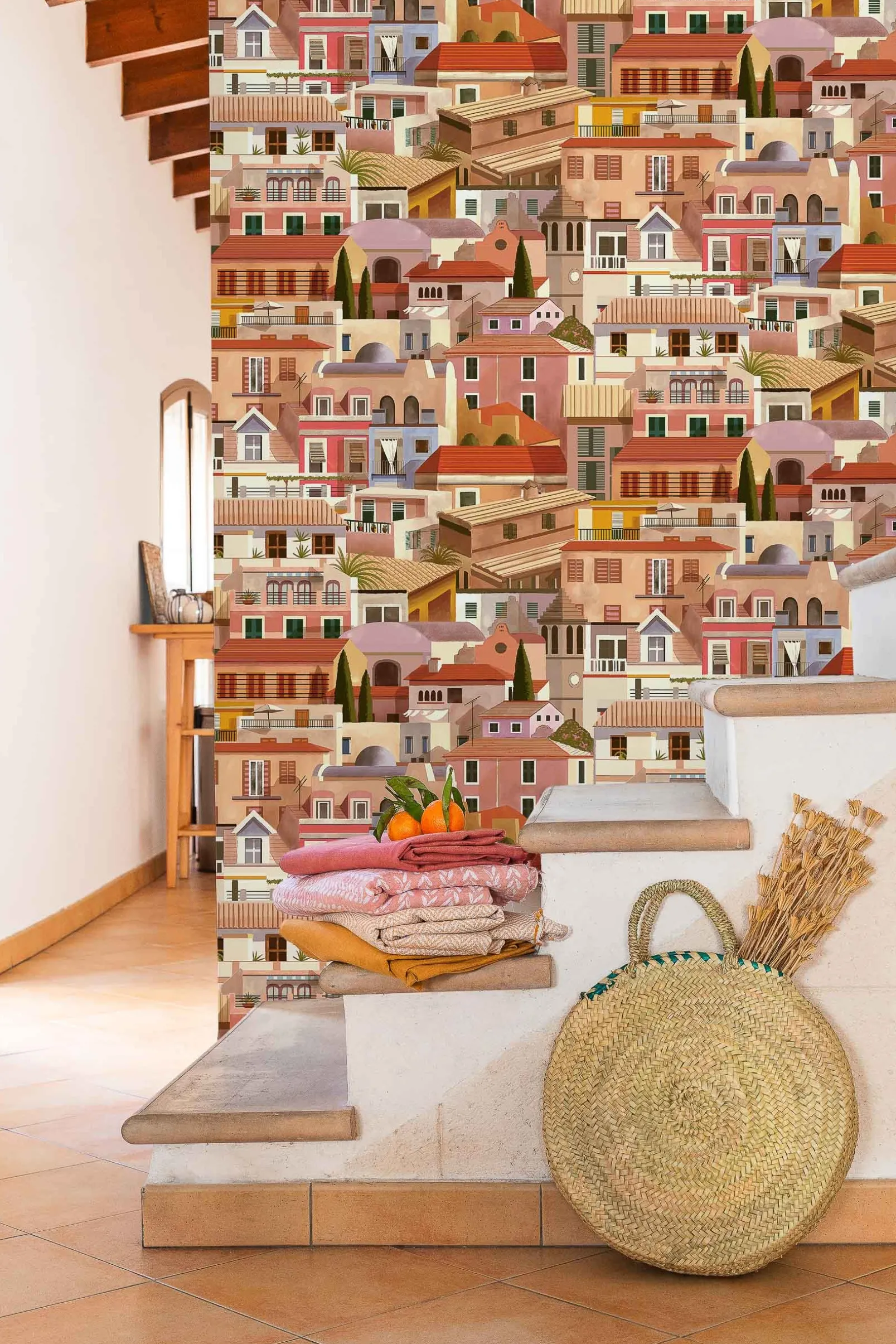 El papel pintado Valldemossa Sunrise de Coordonné es un paisaje diseñado en tonos amarillo/naranja de la colección Mallorca.