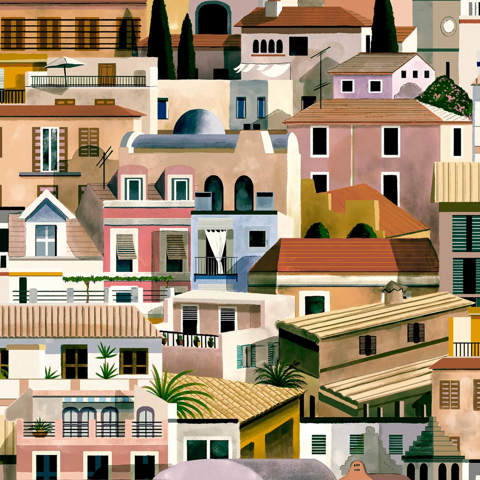 El papel pintado Valldemossa Sunset de Coordonné es un paisaje diseñado en tonos amarillo/naranja de la colección Mallorca.