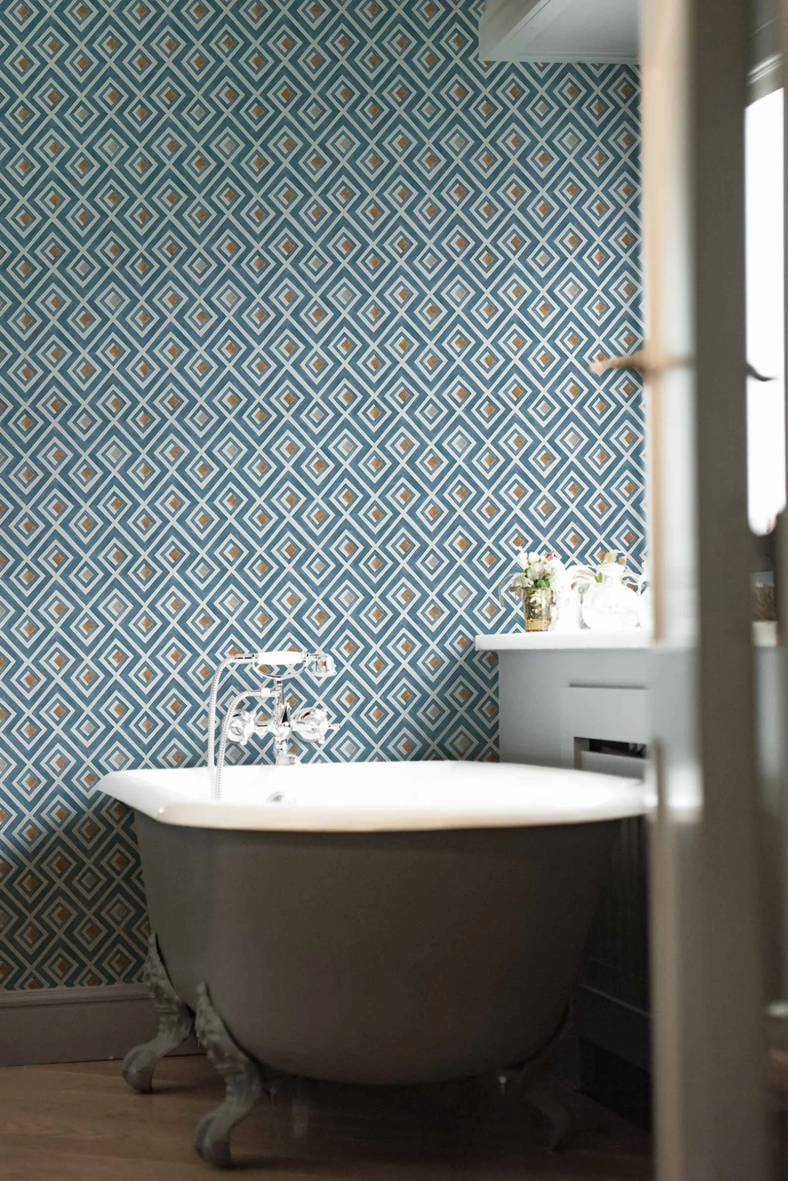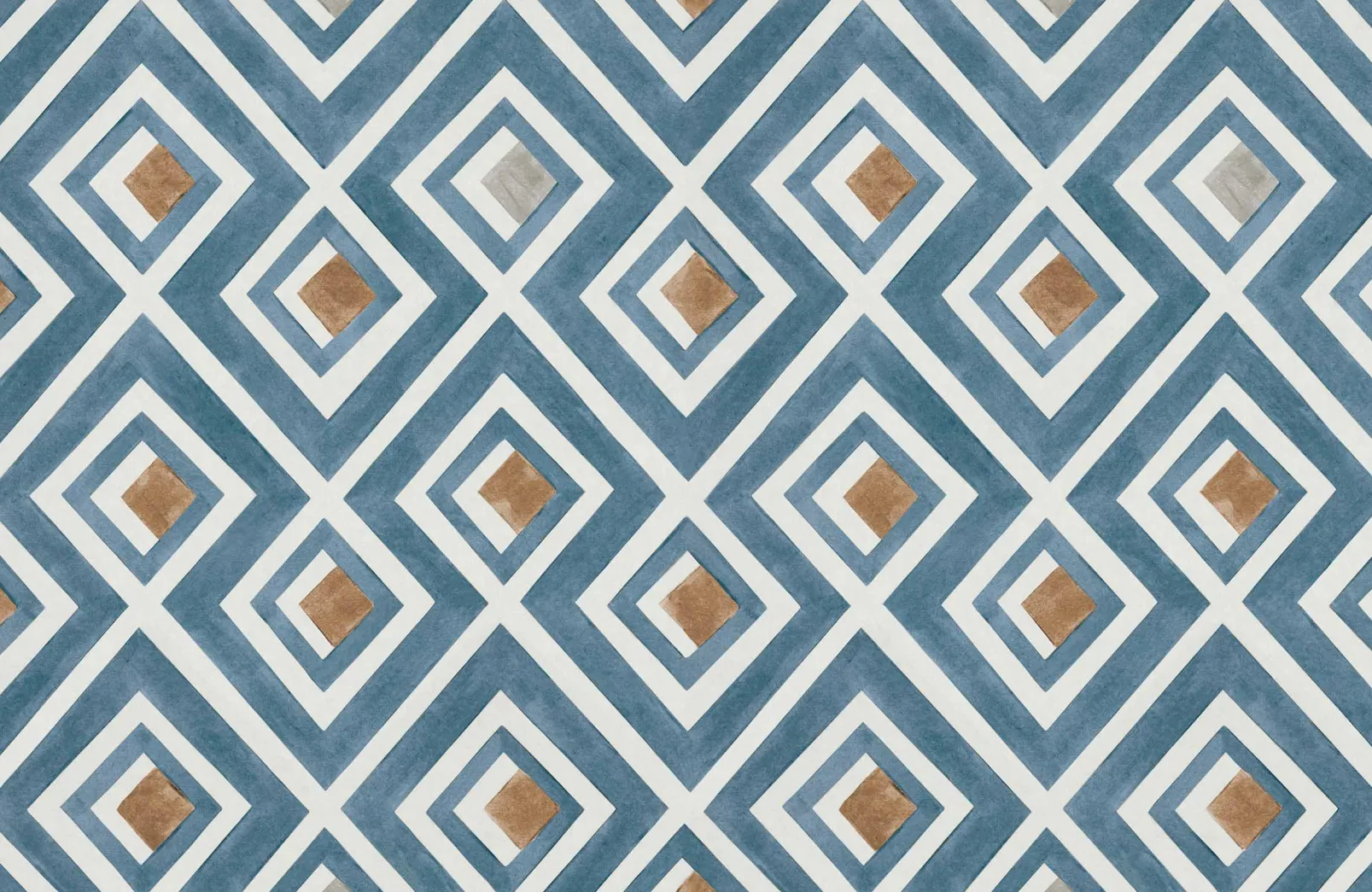 Vidriera Avio de Coordonn es un papel pintado de inspiración geométrica en tonos azules/azules marinos. Formas caleidoscópicas deco que dan un aspecto colorido a las ventanas del palacio.
