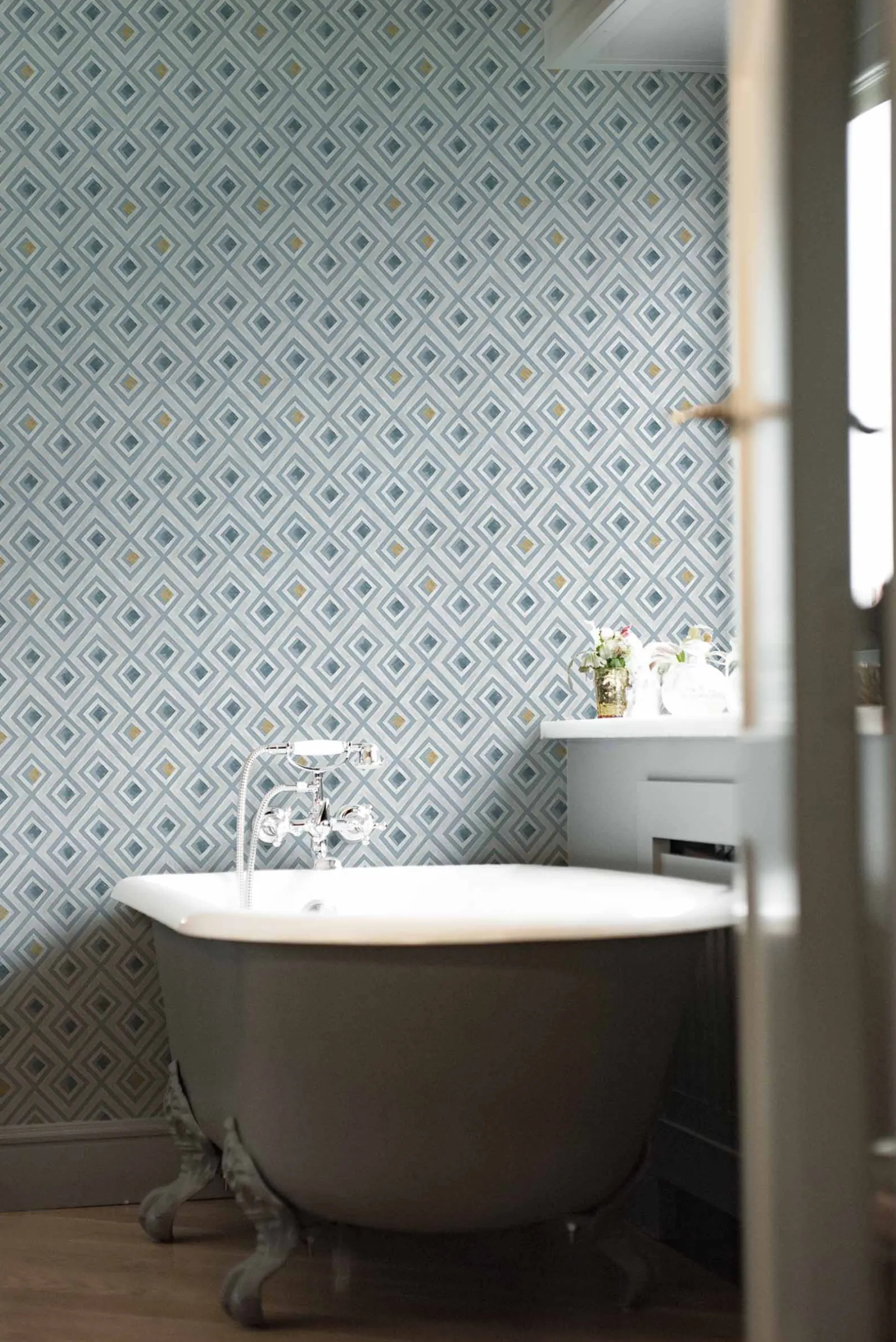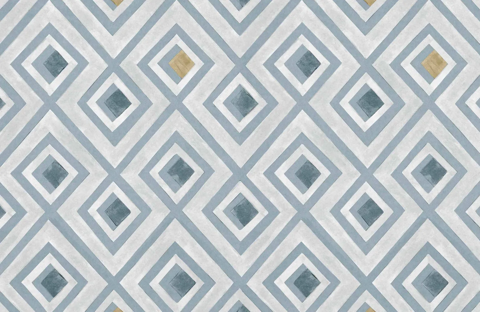 Vidriera Cielo de Coordonn es un papel pintado de inspiración geométrica en tonos azules/azules marinos. Formas caleidoscópicas deco que dan un aspecto colorido a las ventanas del palacio.